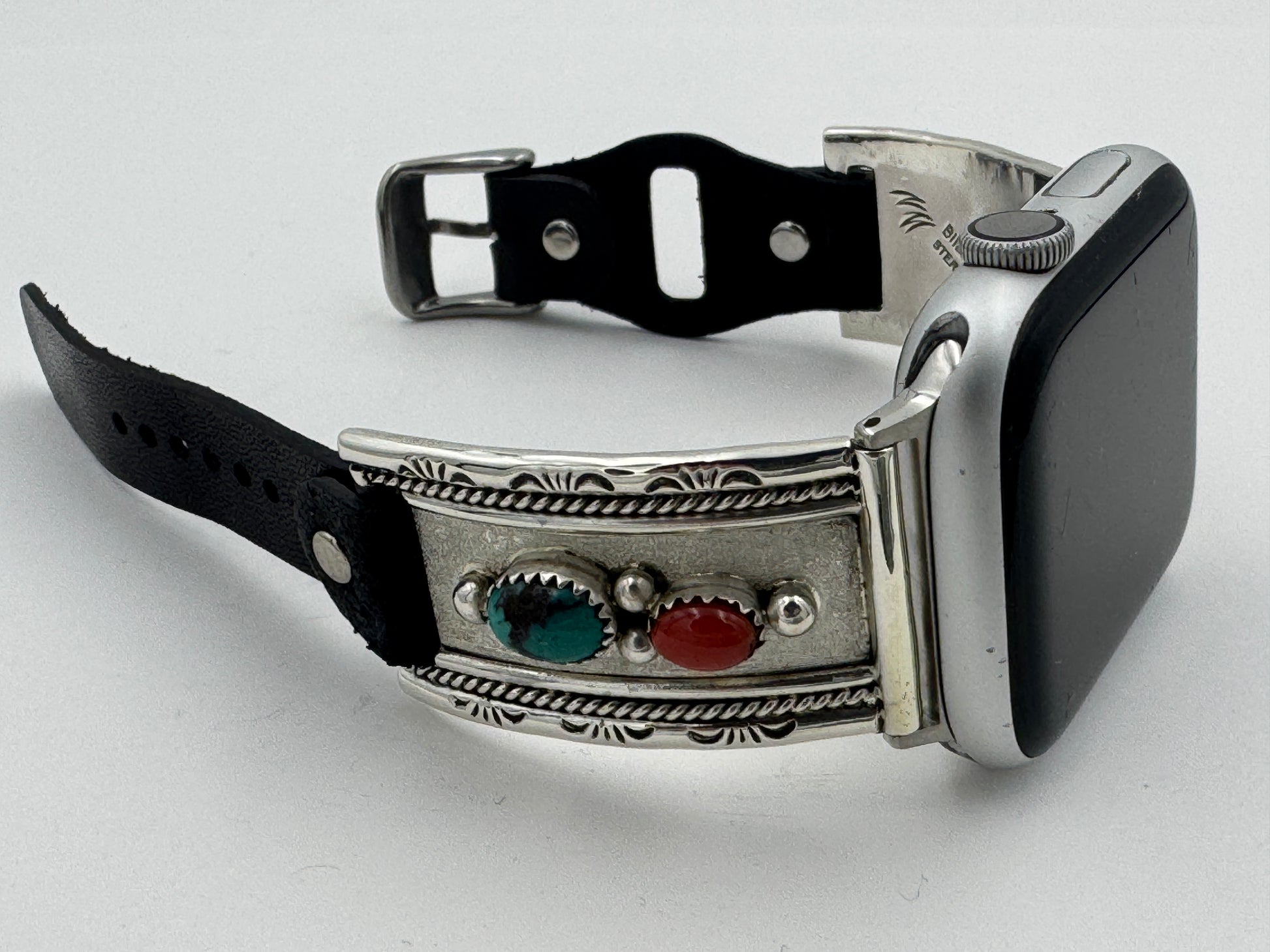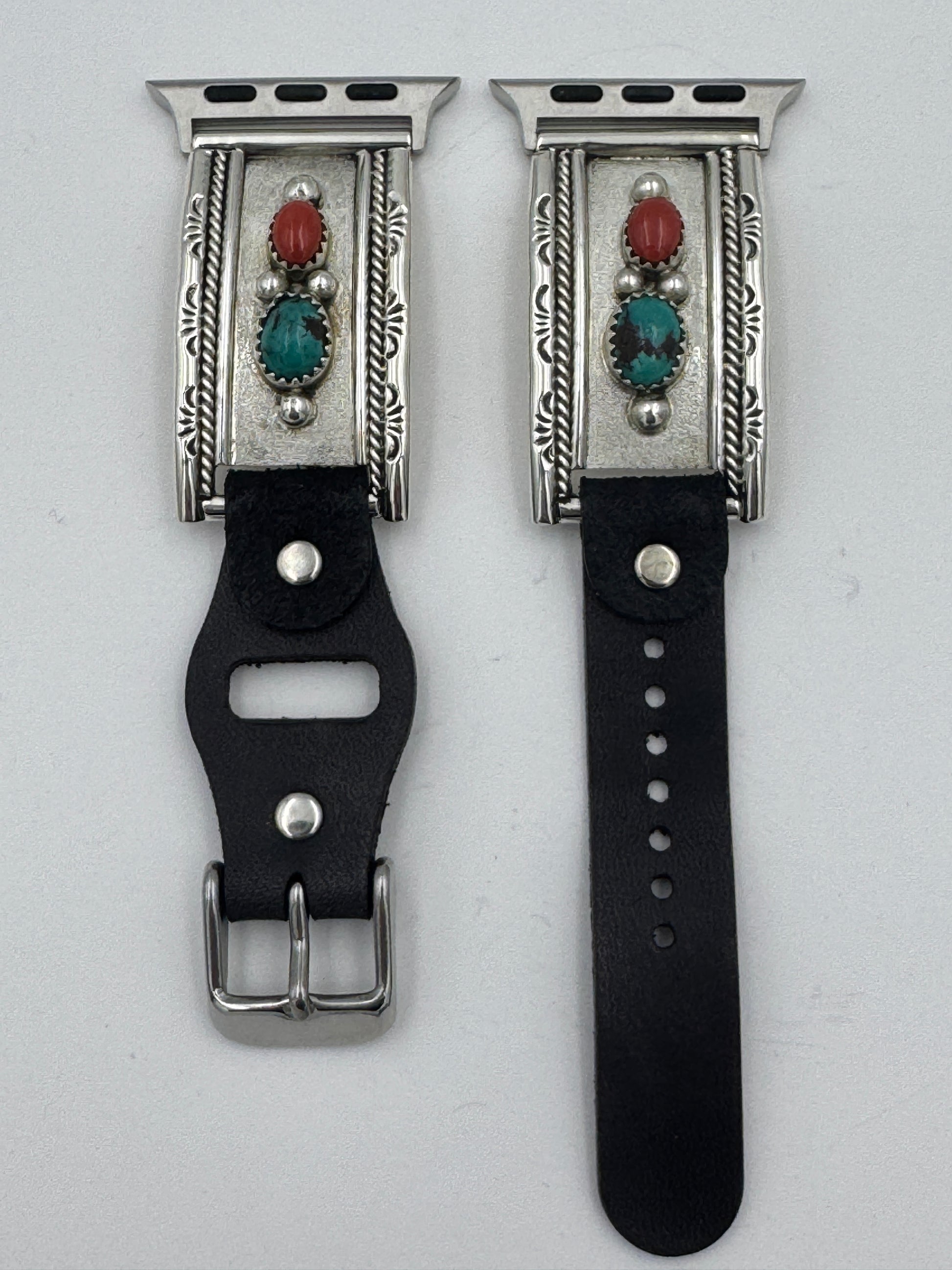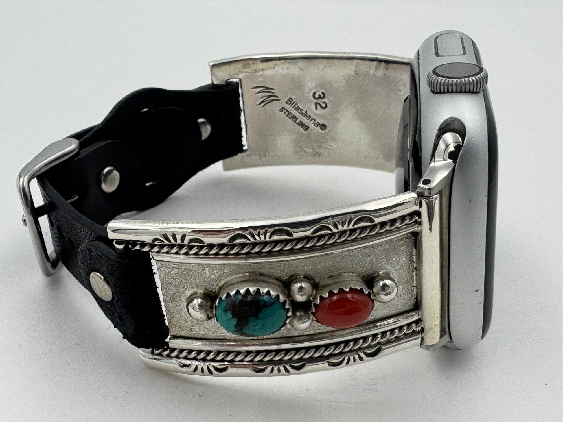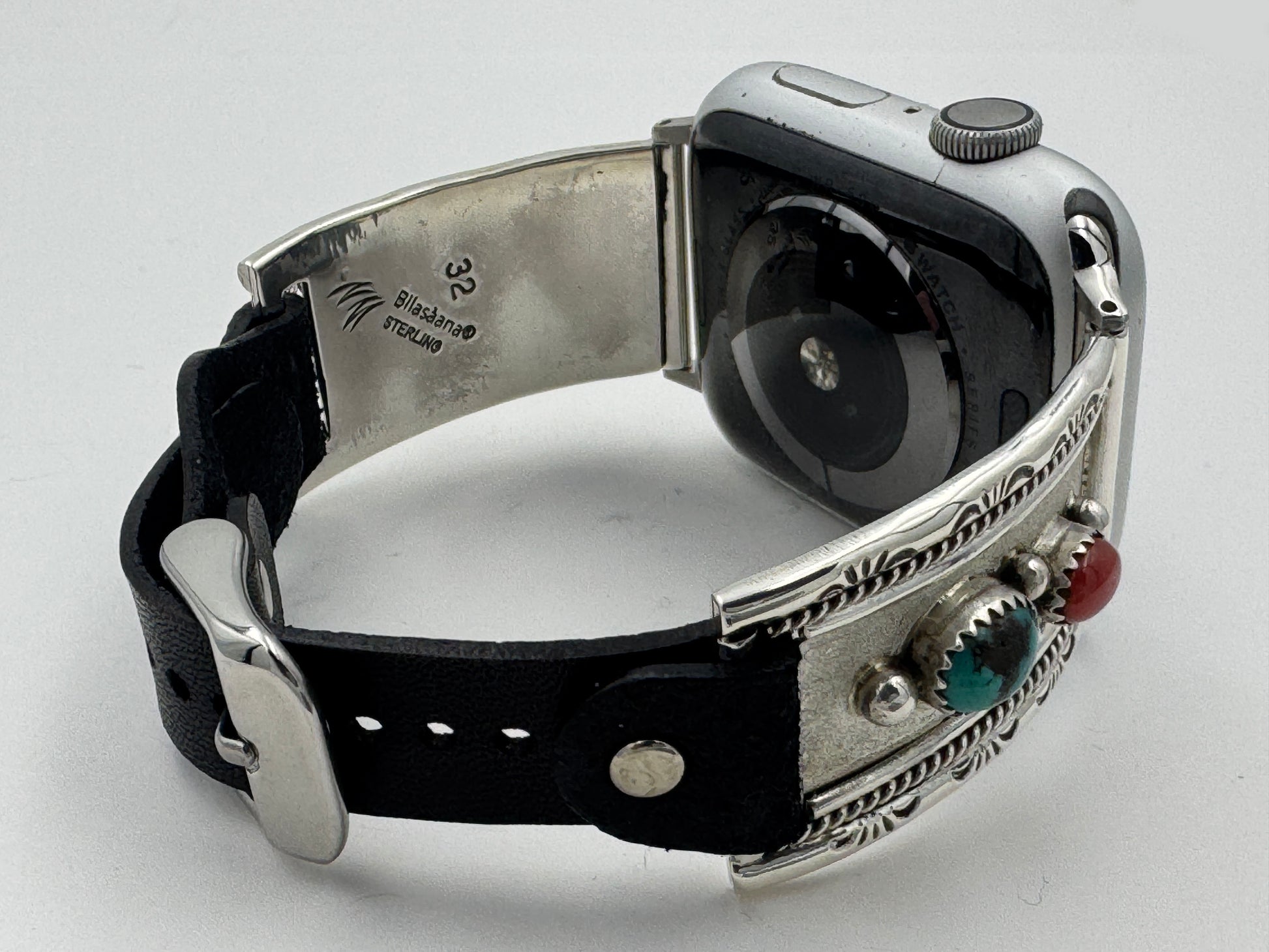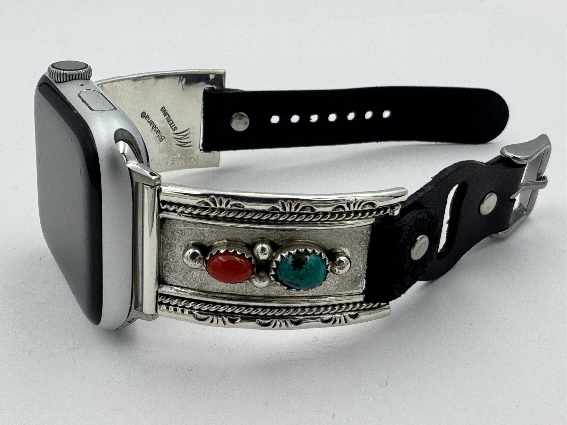 This is the 302nd Bilasáana Nelson Morgan piece offered. The iBand consists of two Sterling Silver Tips with 42/44/45mm WATCH adapters and a leather band. The Sterling Silver Tips are Handcrafted by Nelson Morgan of the Navajo Nation and have an authentic Navajo design with Kingman Turquoise and Coral stones. On the inside of one Tip is the official Bilasáana® mark, Nelson's mark and a Sterling mark. The other tip has the official Bilasaana® mark, Nelson's authenticity Stamp, a Sterling mark and serial #32.