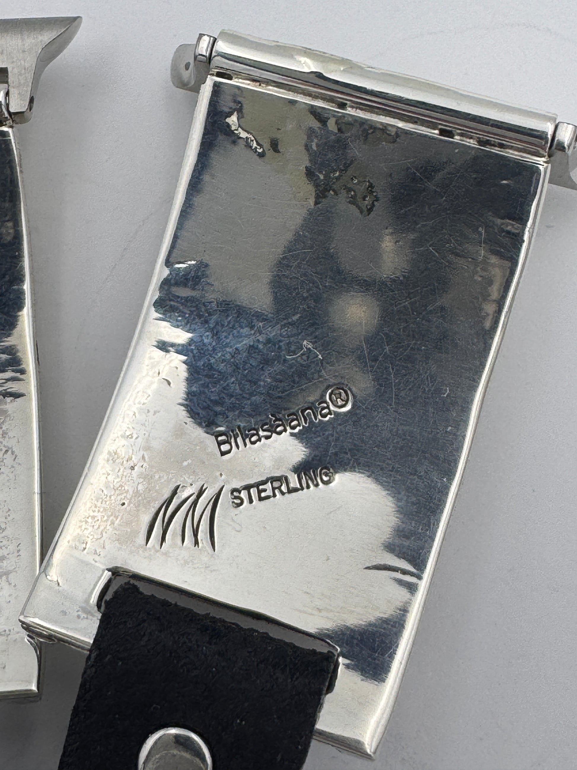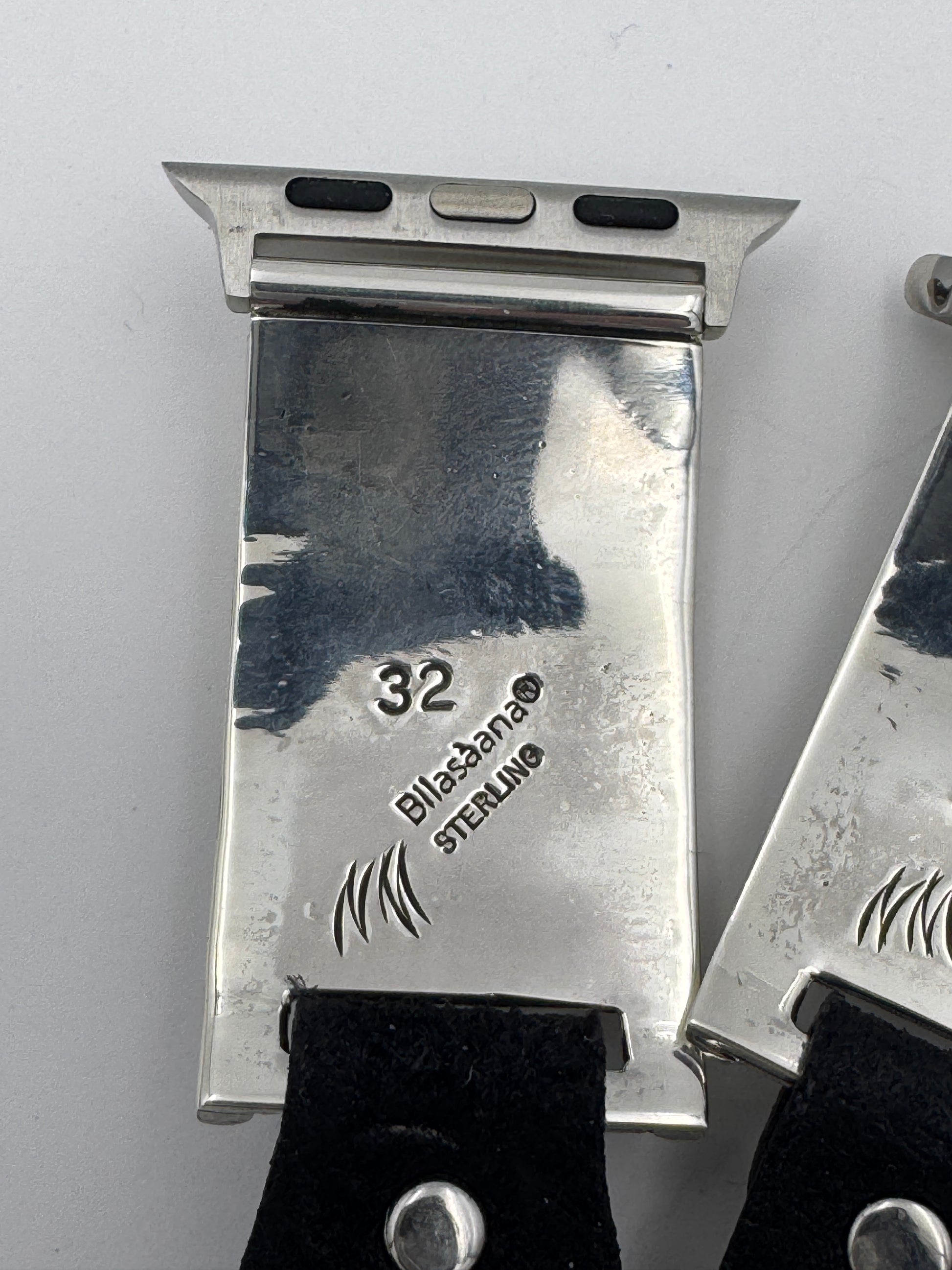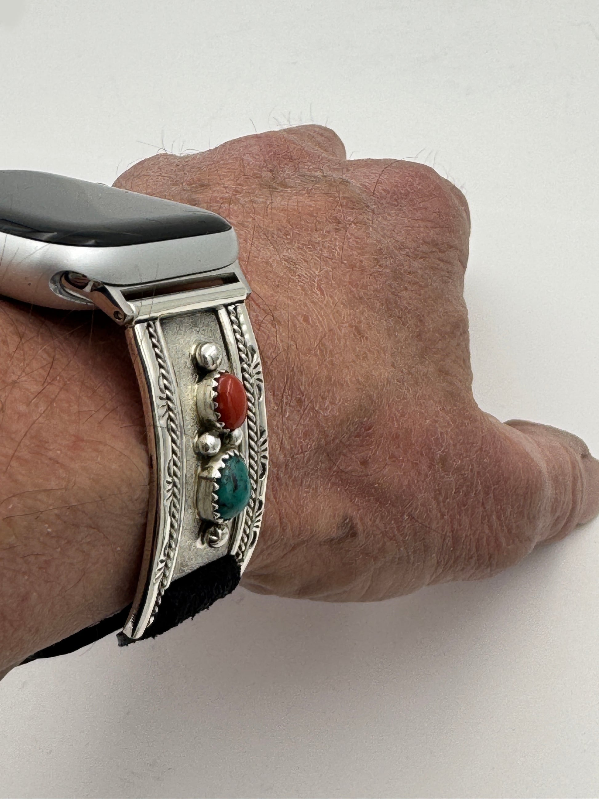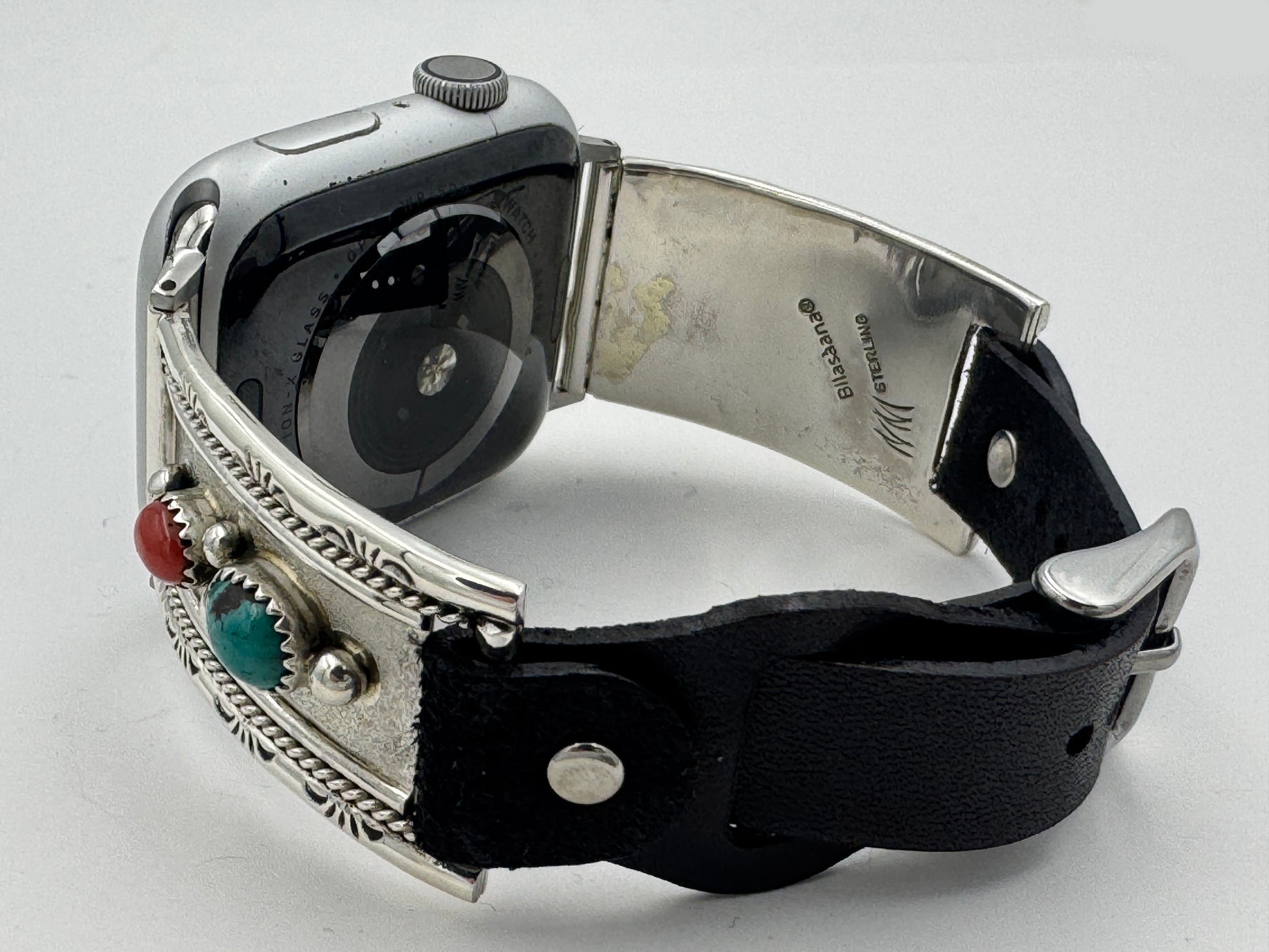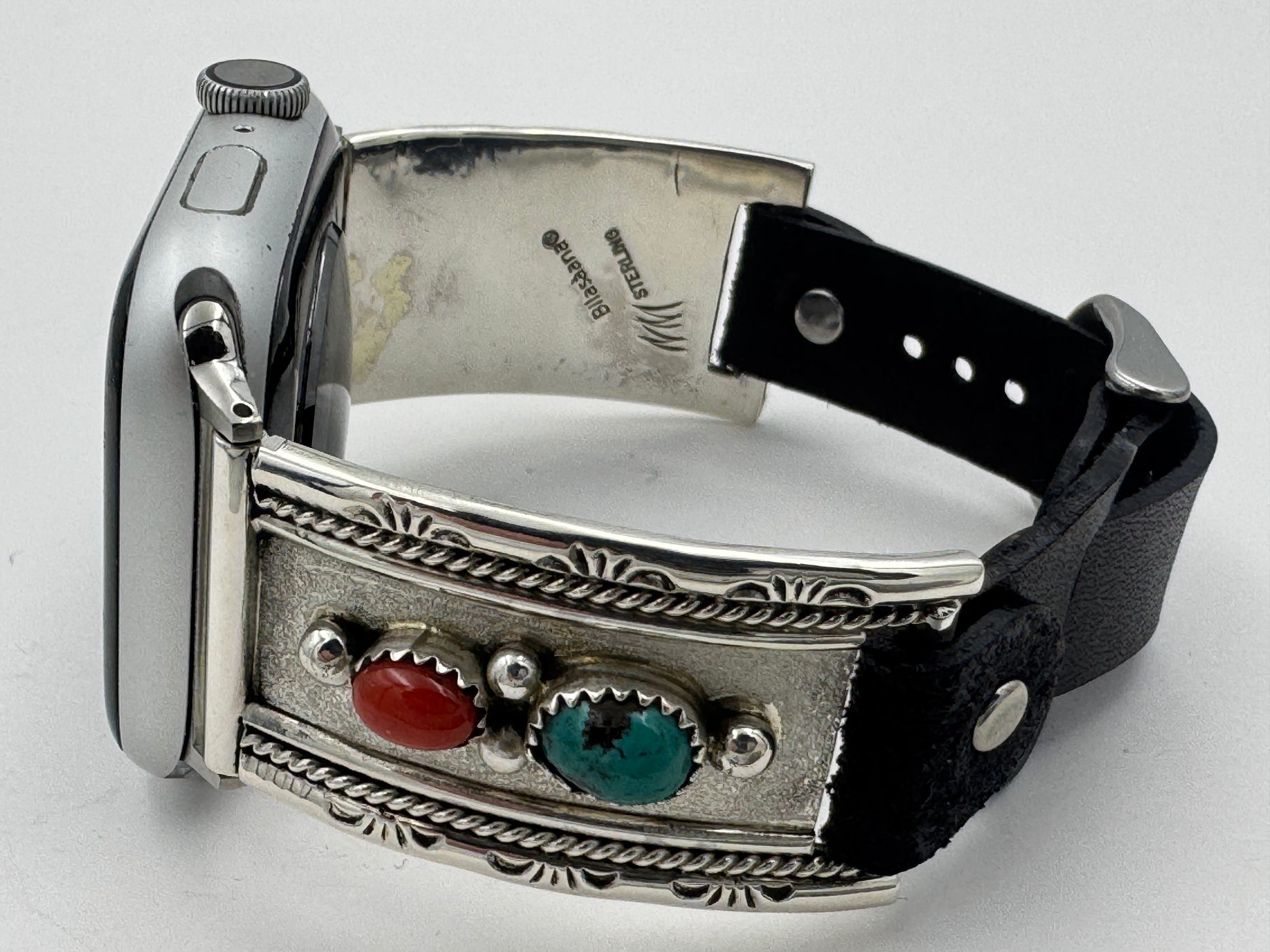 This is the 302nd Bilasáana Nelson Morgan piece offered. The iBand consists of two Sterling Silver Tips with 42/44/45mm WATCH adapters and a leather band. The Sterling Silver Tips are Handcrafted by Nelson Morgan of the Navajo Nation and have an authentic Navajo design with Kingman Turquoise and Coral stones. On the inside of one Tip is the official Bilasáana® mark, Nelson's mark and a Sterling mark. The other tip has the official Bilasaana® mark, Nelson's authenticity Stamp, a Sterling mark and serial #32.