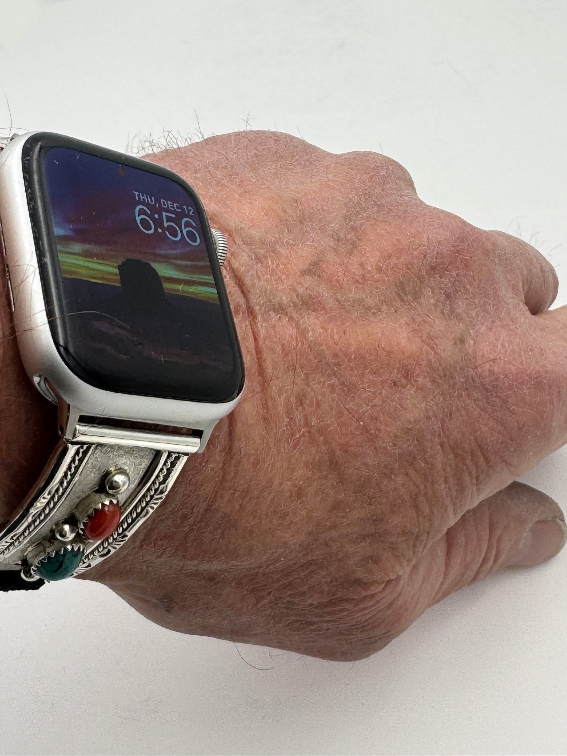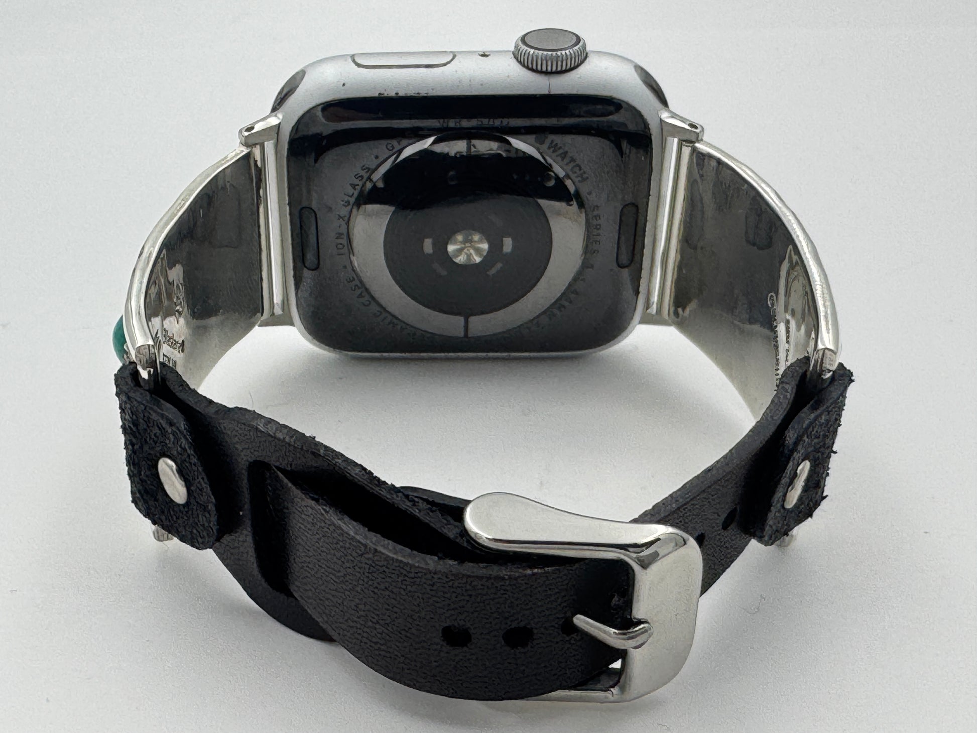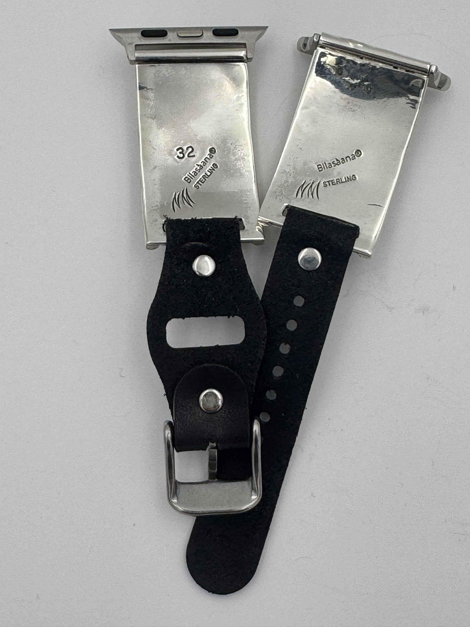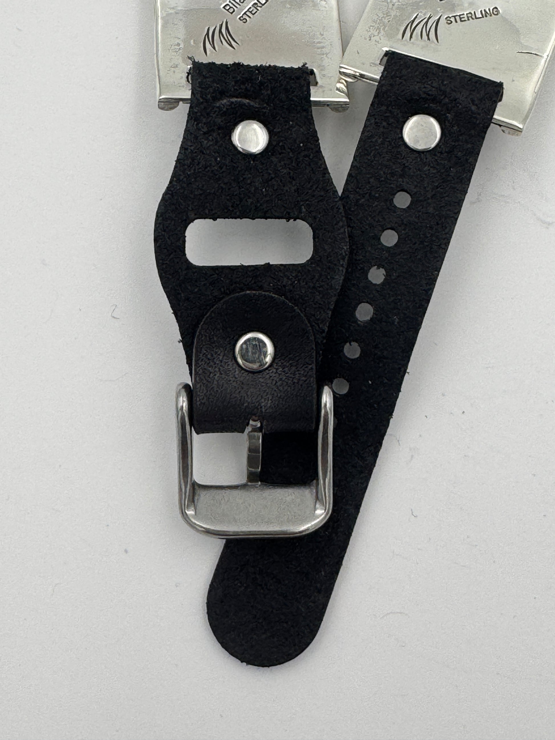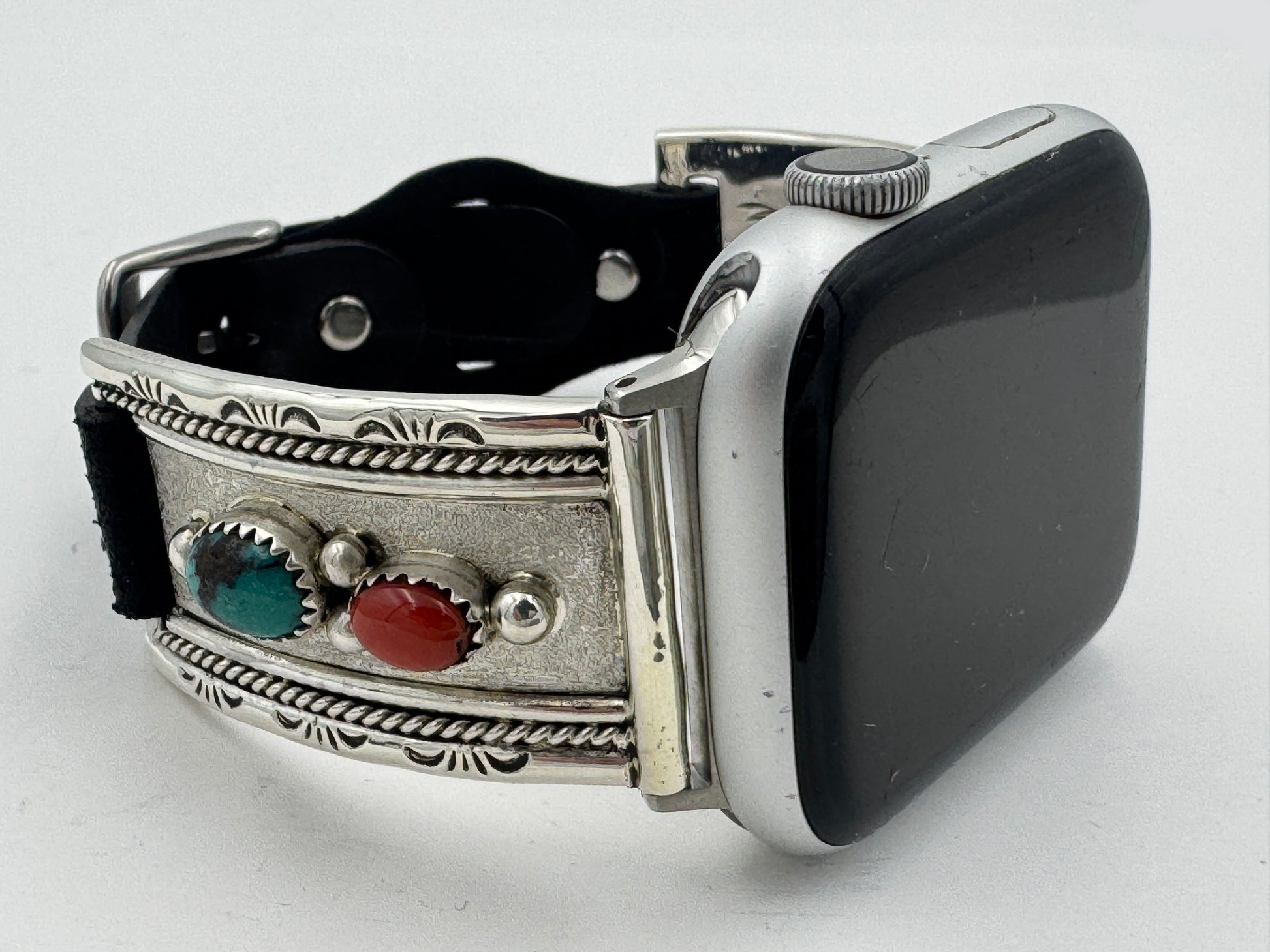 This purchase includes a Handcrafted Native American Sterling Silver Leather iBand for Apple WATCH Series 1 42mm thru Series 9 45mm. The Apple WATCH 42/44/45mm is not included. This band can also be readied for a Samsung Watch with 22mm adapters.