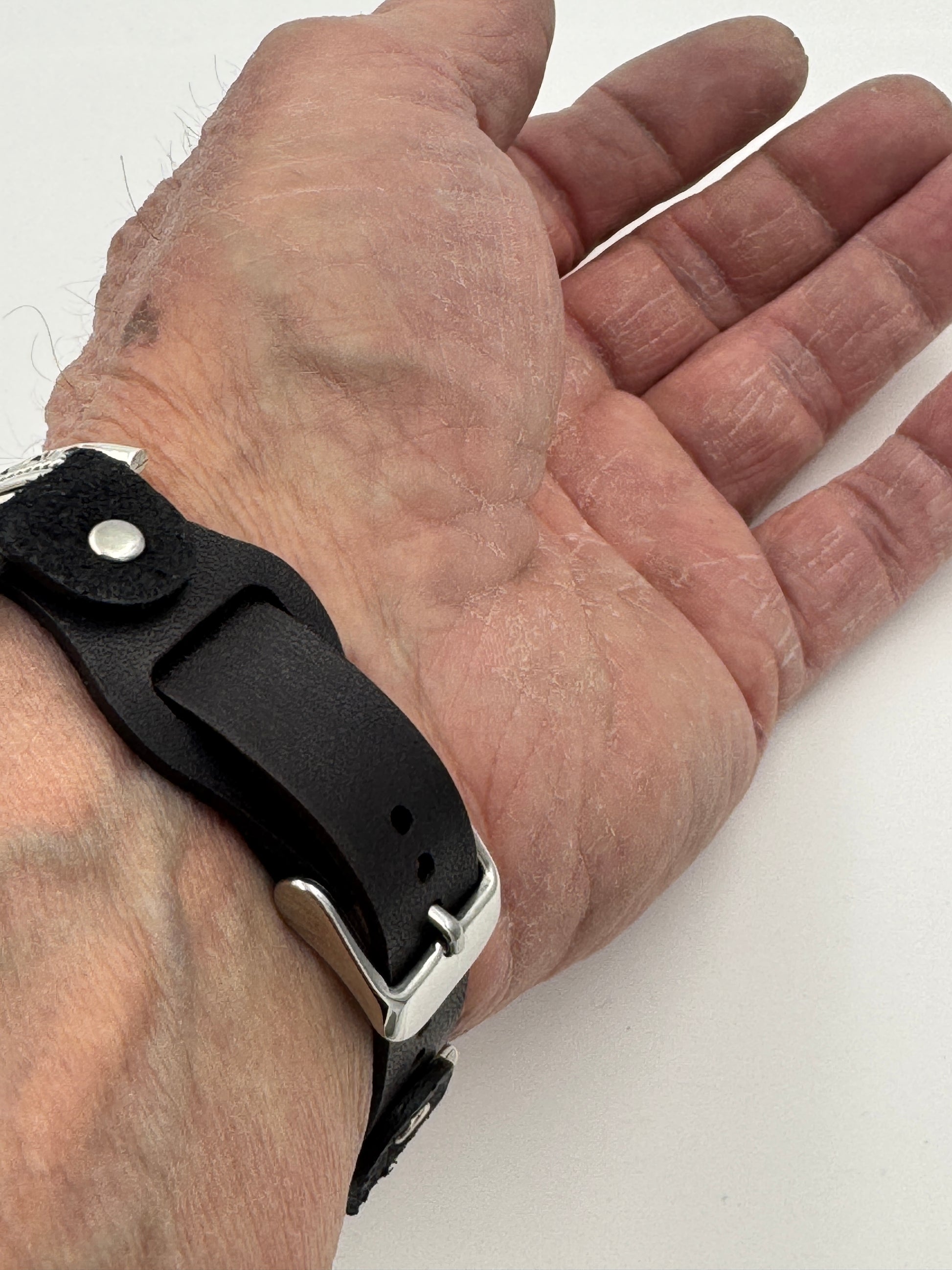 The iBand comes with our Laser Cut Riveted Universal Leather Buckle Band v6.0 as shown. The leather band comes in a variety of sizes from S/M to M/L. The iBand shown has a black colored S/M band attached. This is a great piece for a small to a large size wrist. We can size this band to fit virtually any wrist. Choose the available size at check out and we will contact you to assure a nice fit. We can also do the leather band in a variety of styles and colors including dark brown or black colors and loop or button styles. The iBand will seamlessly integrate with the Apple 42mm Series 1 thru Series 9 45mm WATCH. We can also make this band work with the 38/40/41/49mm Apple Watches by changing the adapters or Samsung Watches with 20mm pins. Great band for a medium to large wrist with a variety of watches.
