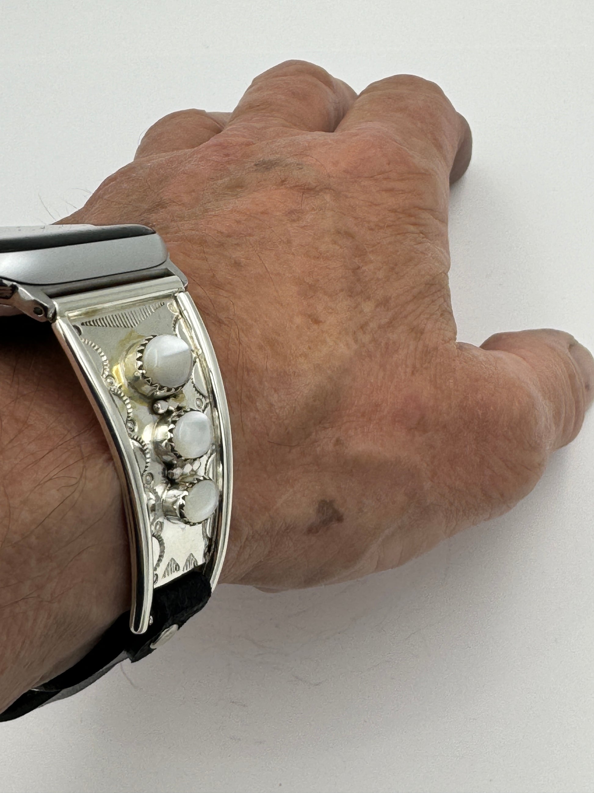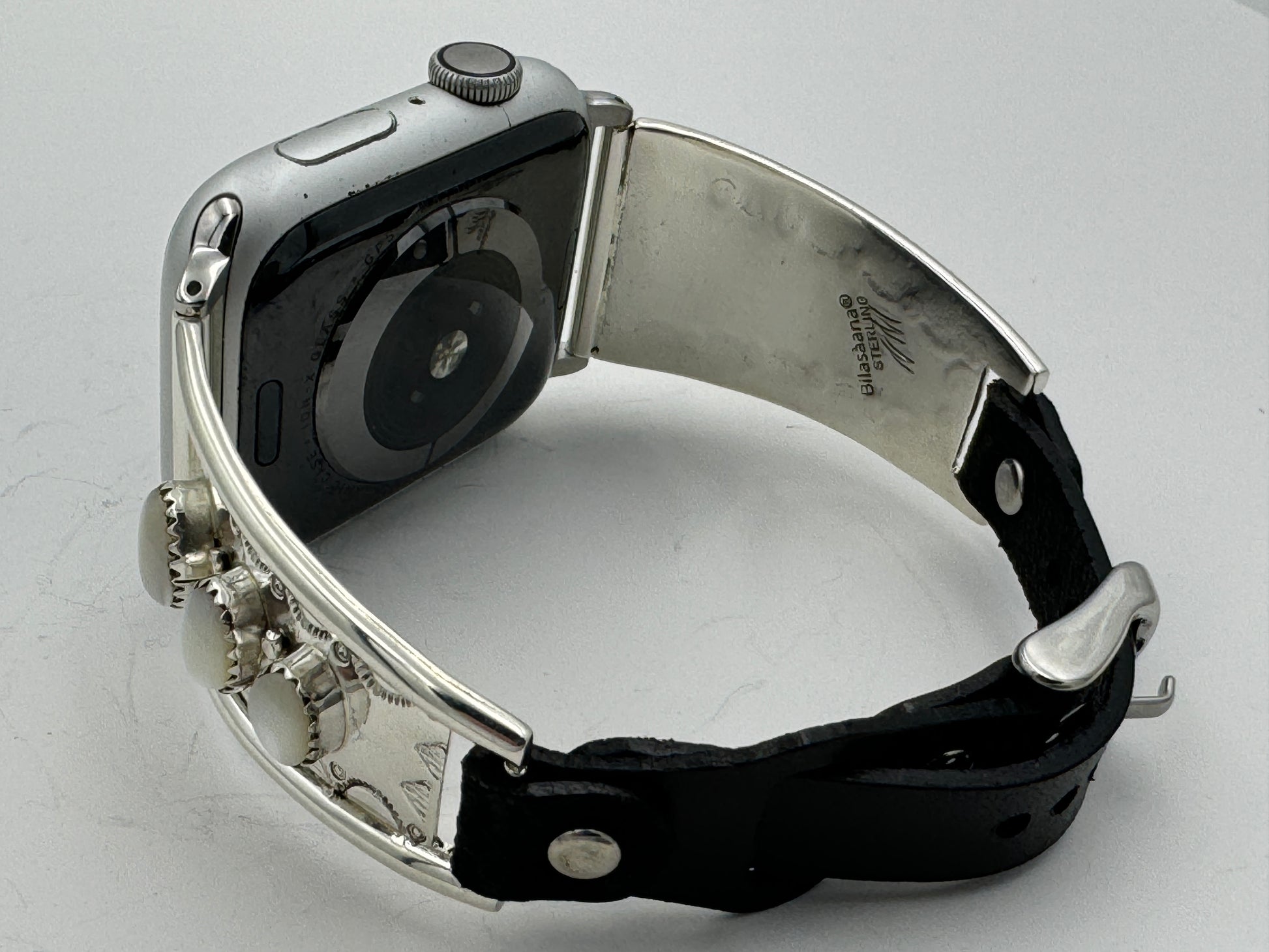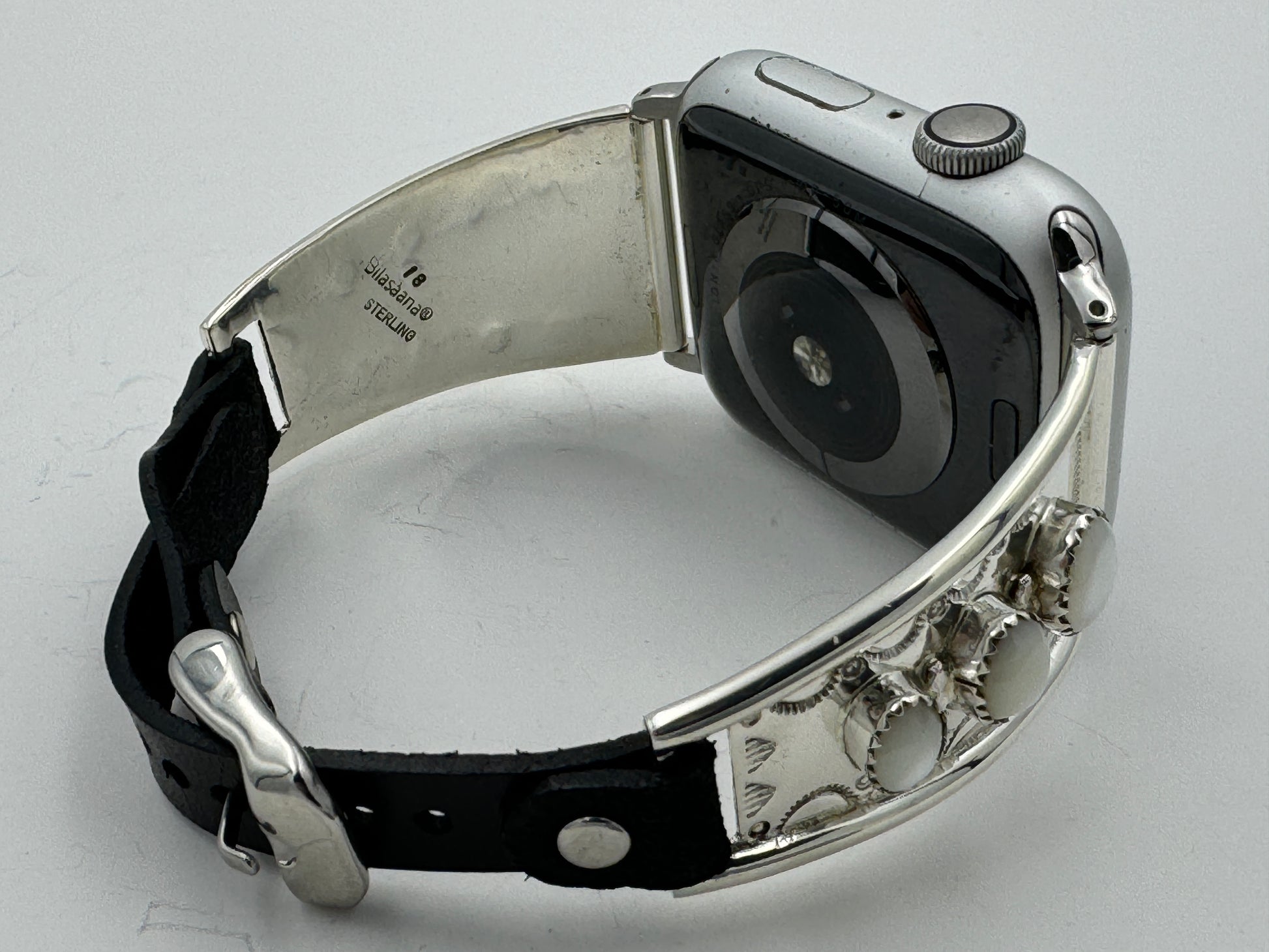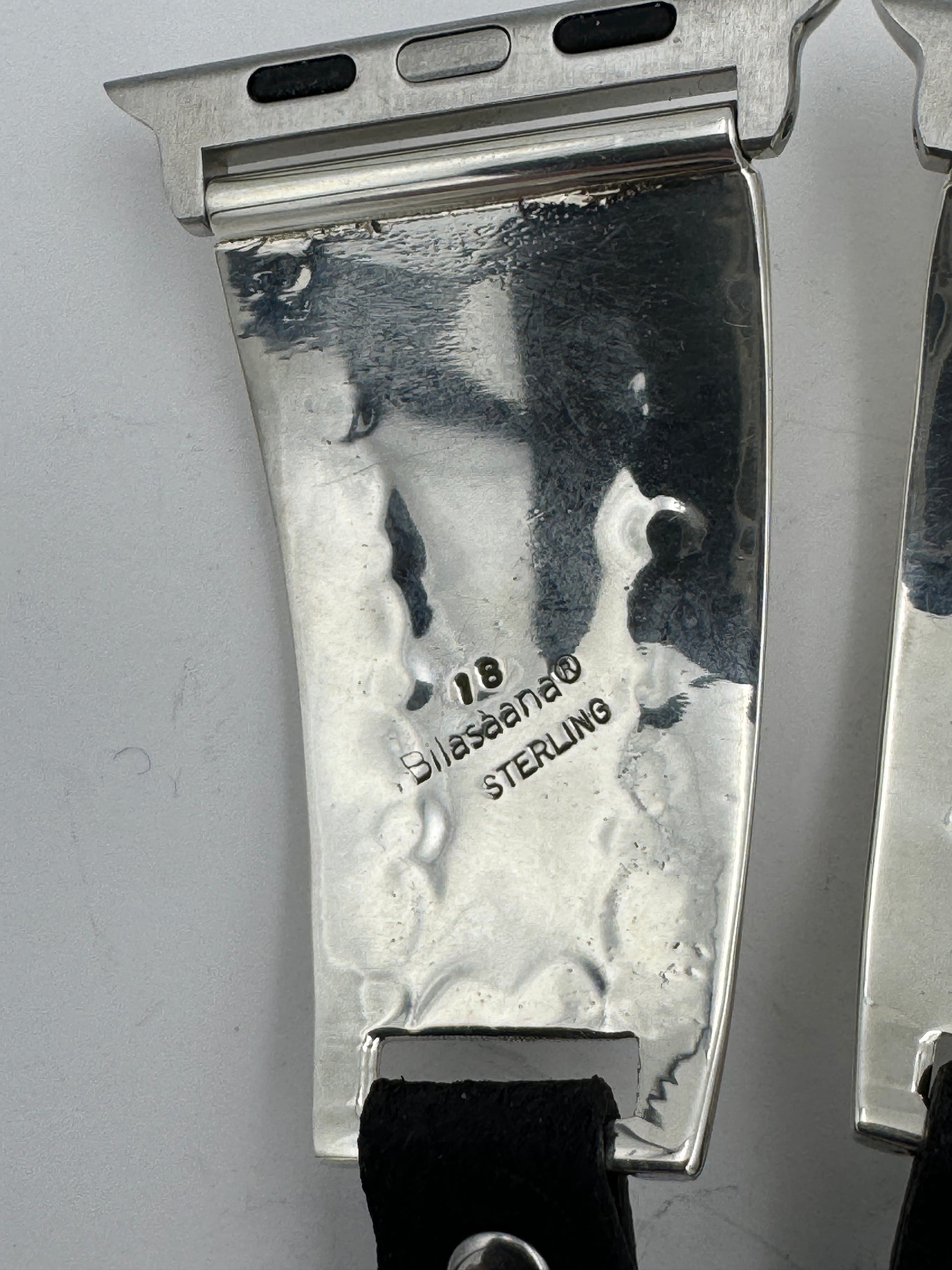 This is Nelson Morgan's 18th Bilasáana piece offered. The iBand consists of two Sterling Silver Tips with 42/44/45mm WATCH adapters and a Laser Cut Leather Band. The Sterling Silver Tips are Handcrafted by Nelson Morgan of the Navajo Nation and have an authentic Navajo Stamp and Bead Design with Mother of Pearl stones on each side. On the inside of one Tip is the official Bilasáana Trademark, the serial number 18 and Sterling mark. The other tip has Sterling, Bilasaana and Nelson's authenticity marks.