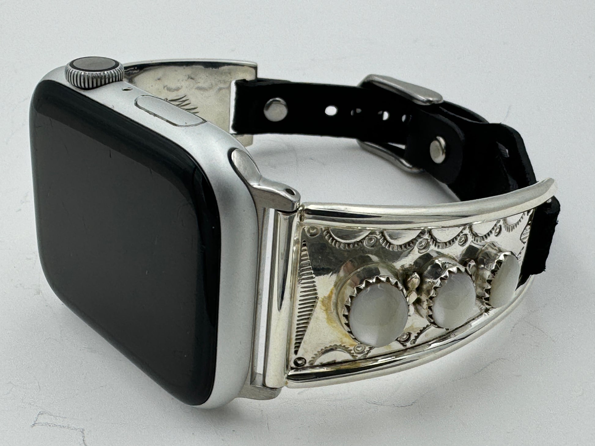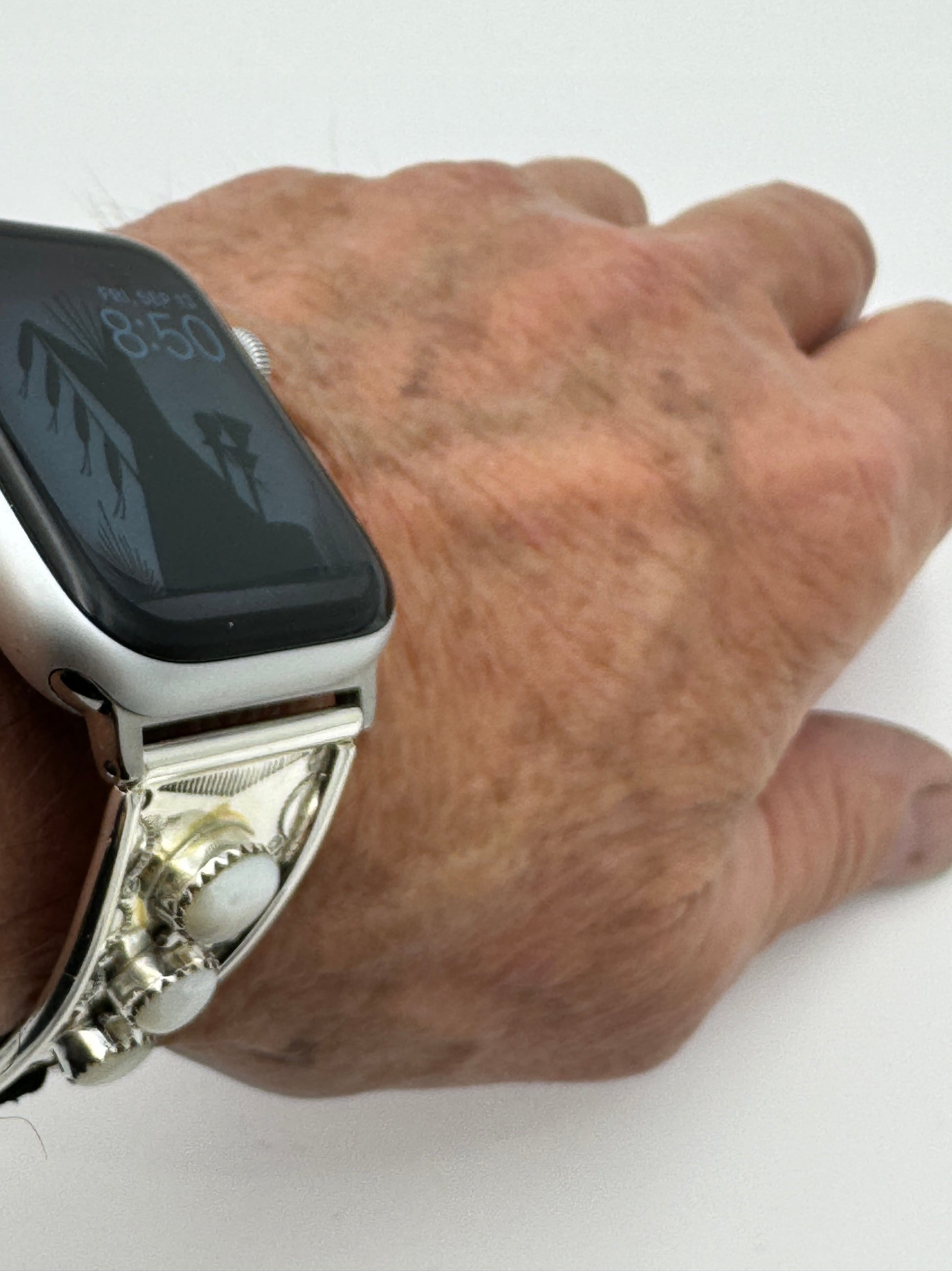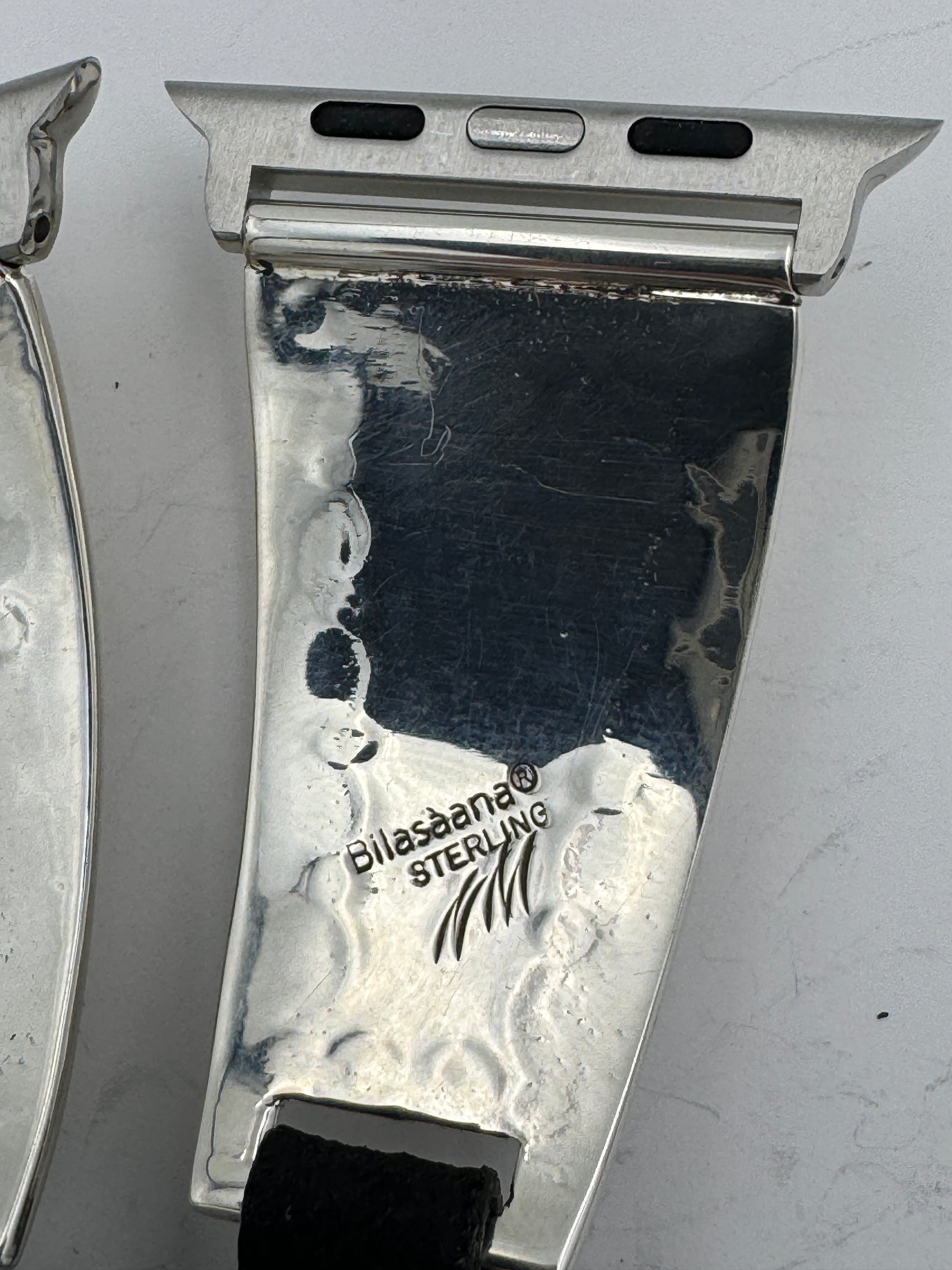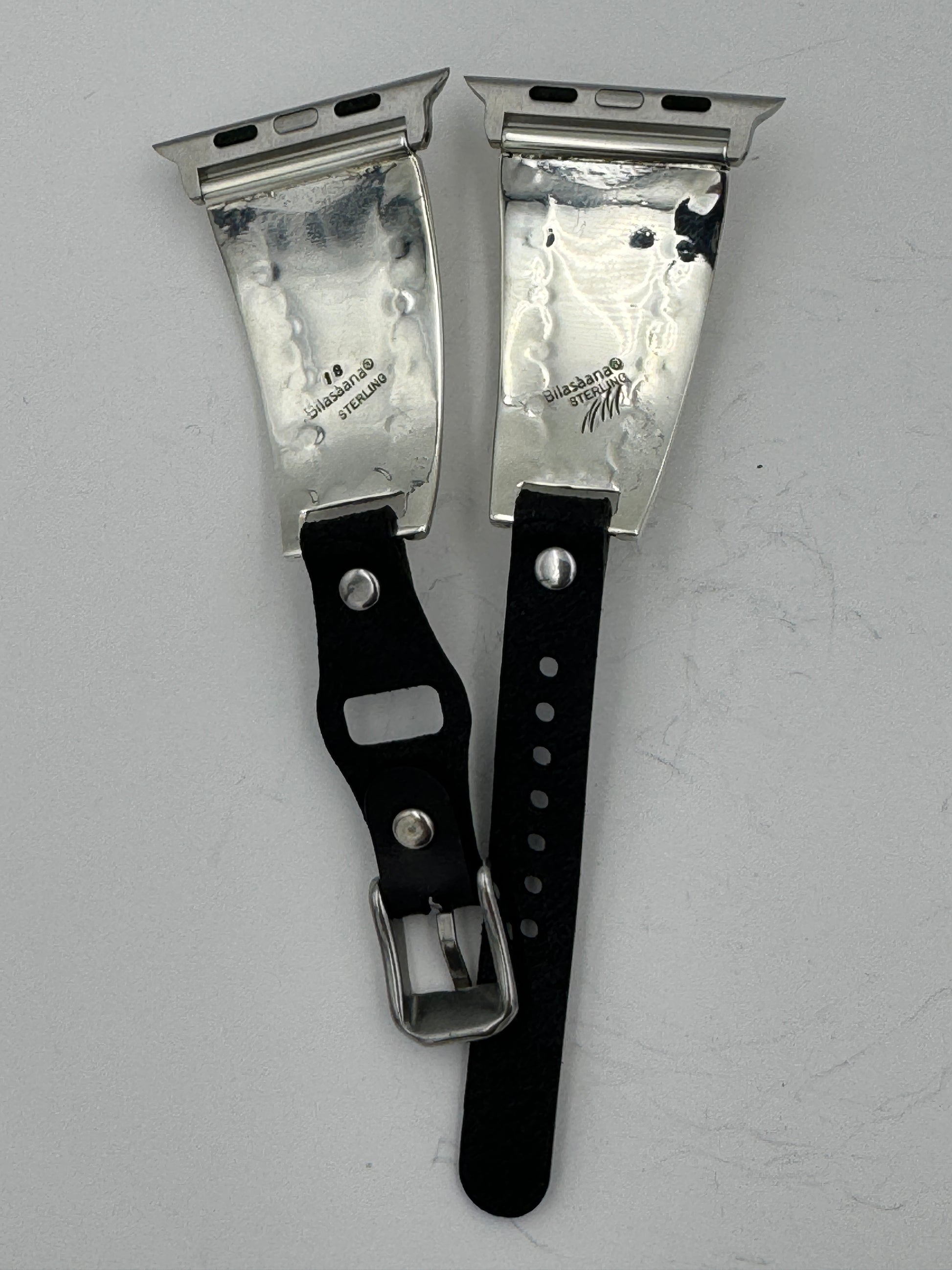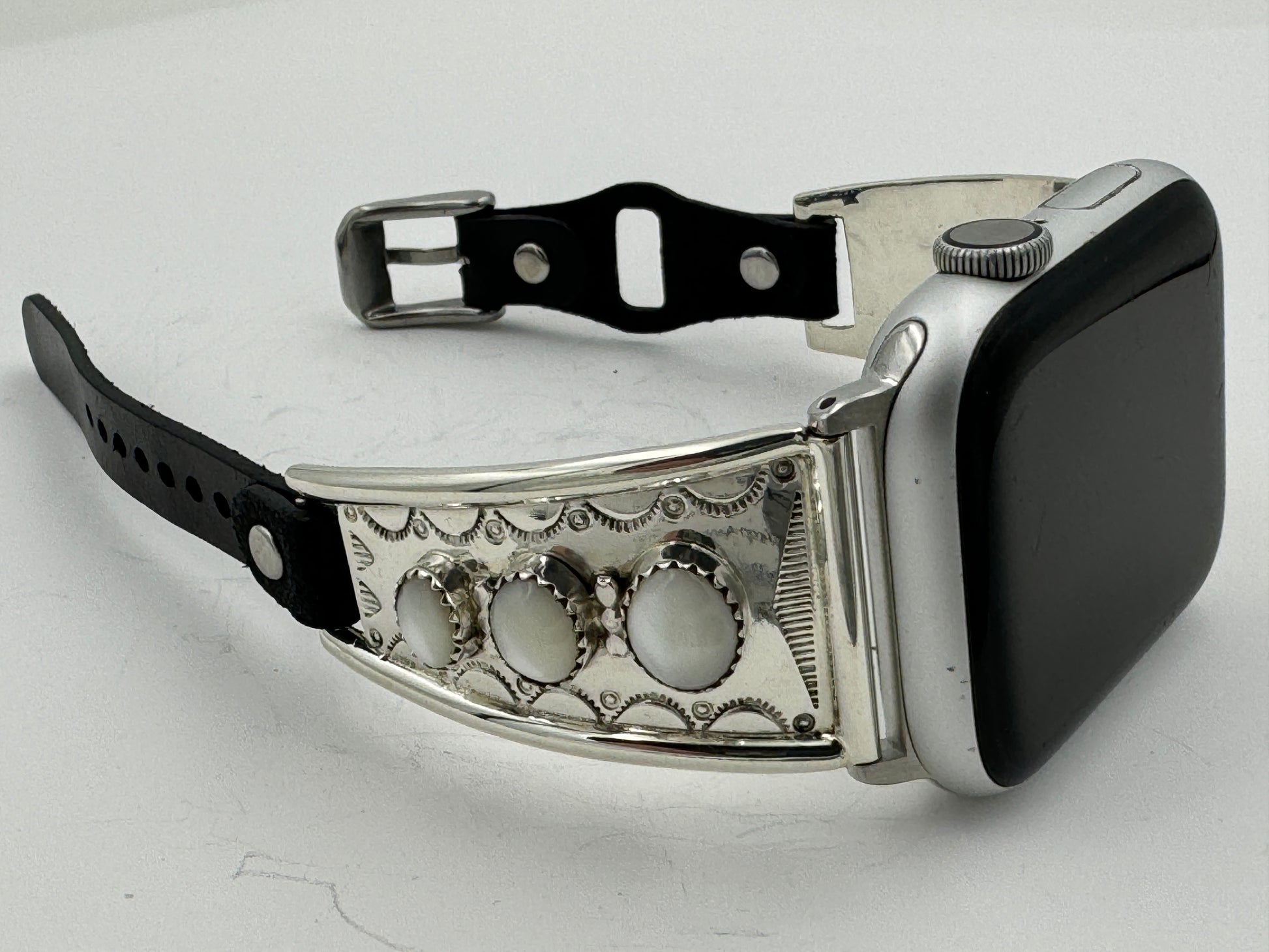 This is Nelson Morgan's 18th Bilasáana piece offered. The iBand consists of two Sterling Silver Tips with 42/44/45mm WATCH adapters and a Laser Cut Leather Band. The Sterling Silver Tips are Handcrafted by Nelson Morgan of the Navajo Nation and have an authentic Navajo Stamp and Bead Design with Mother of Pearl stones on each side. On the inside of one Tip is the official Bilasáana Trademark, the serial number 18 and Sterling mark. The other tip has Sterling, Bilasaana and Nelson's authenticity marks.