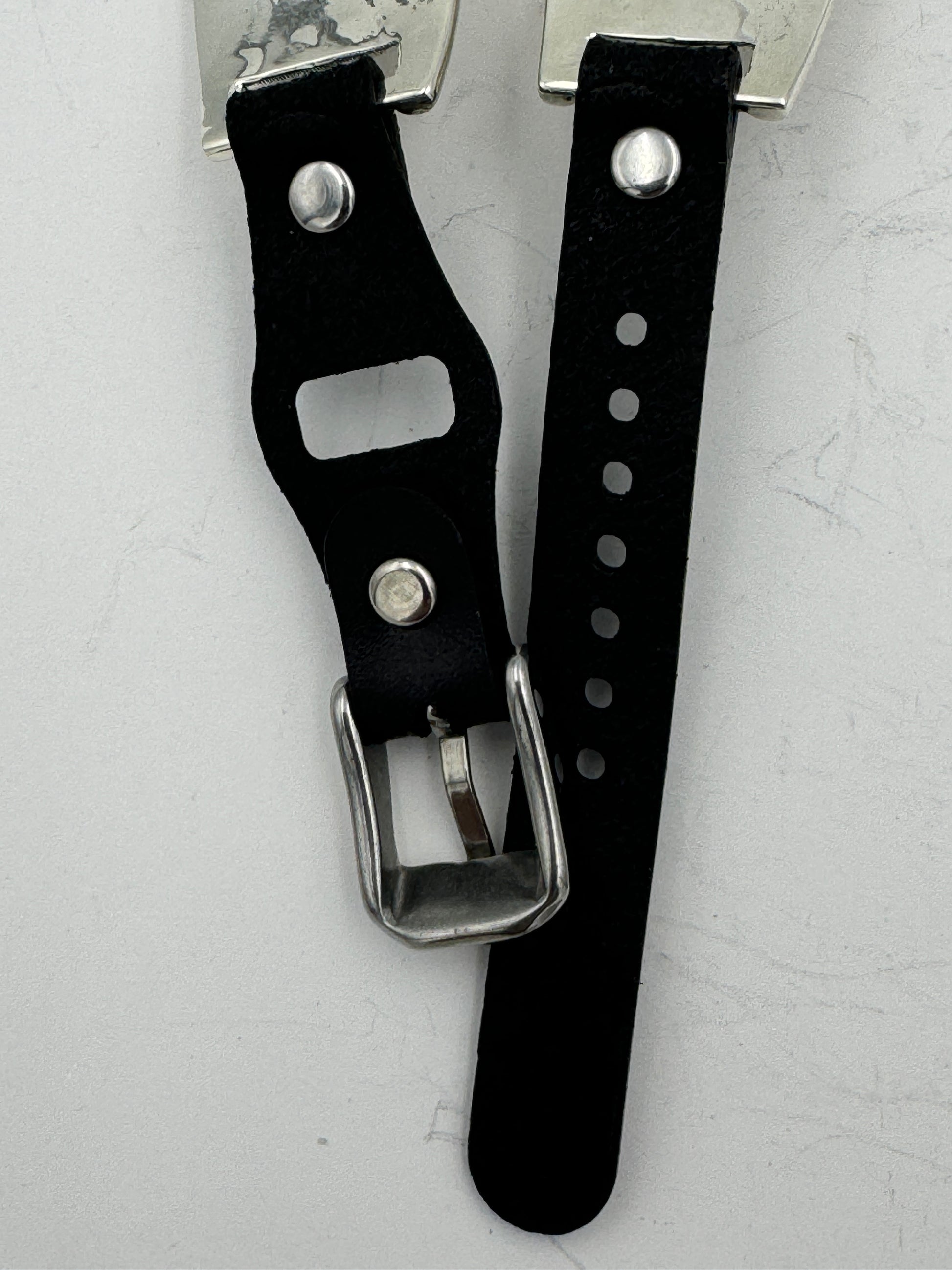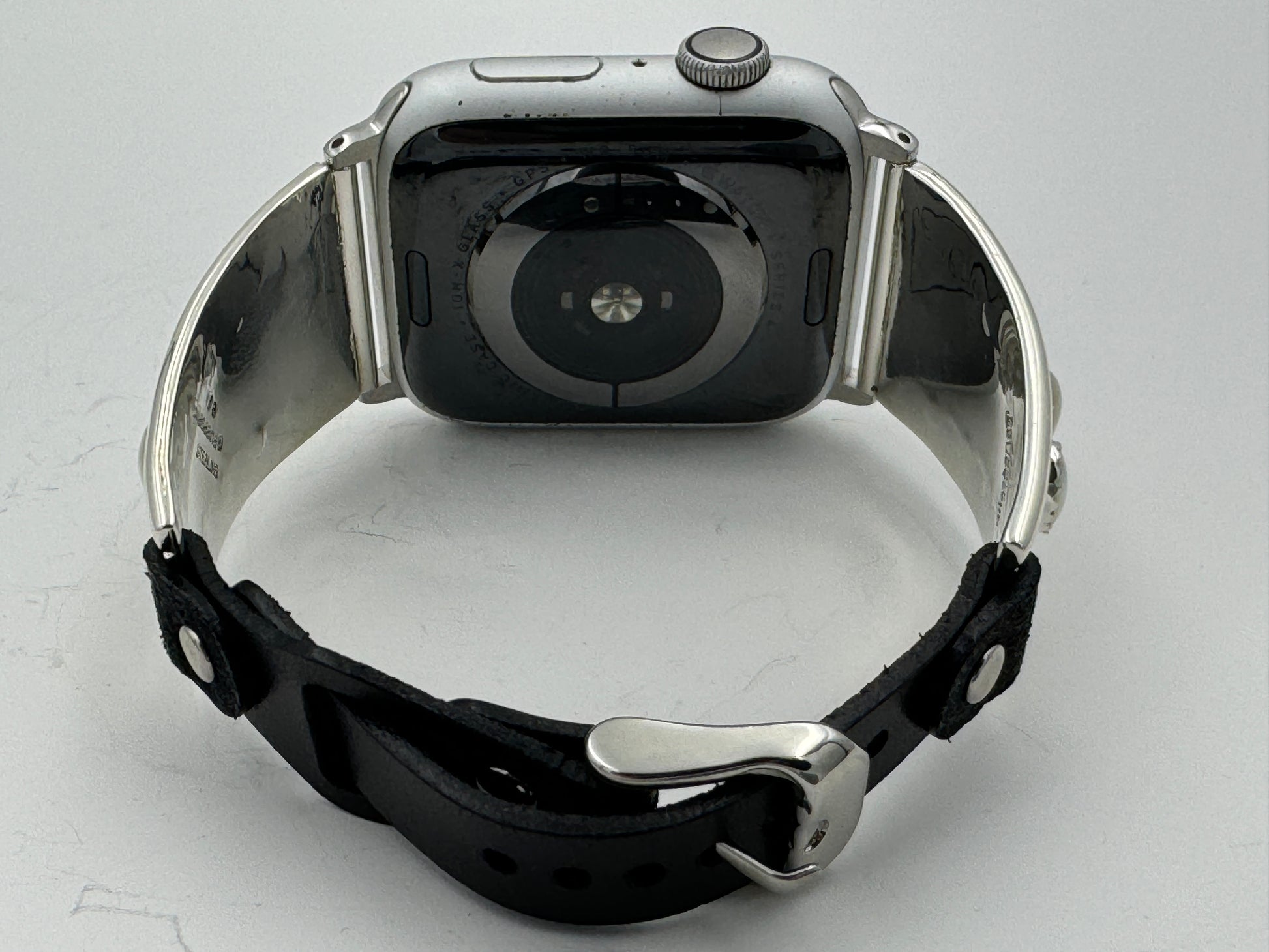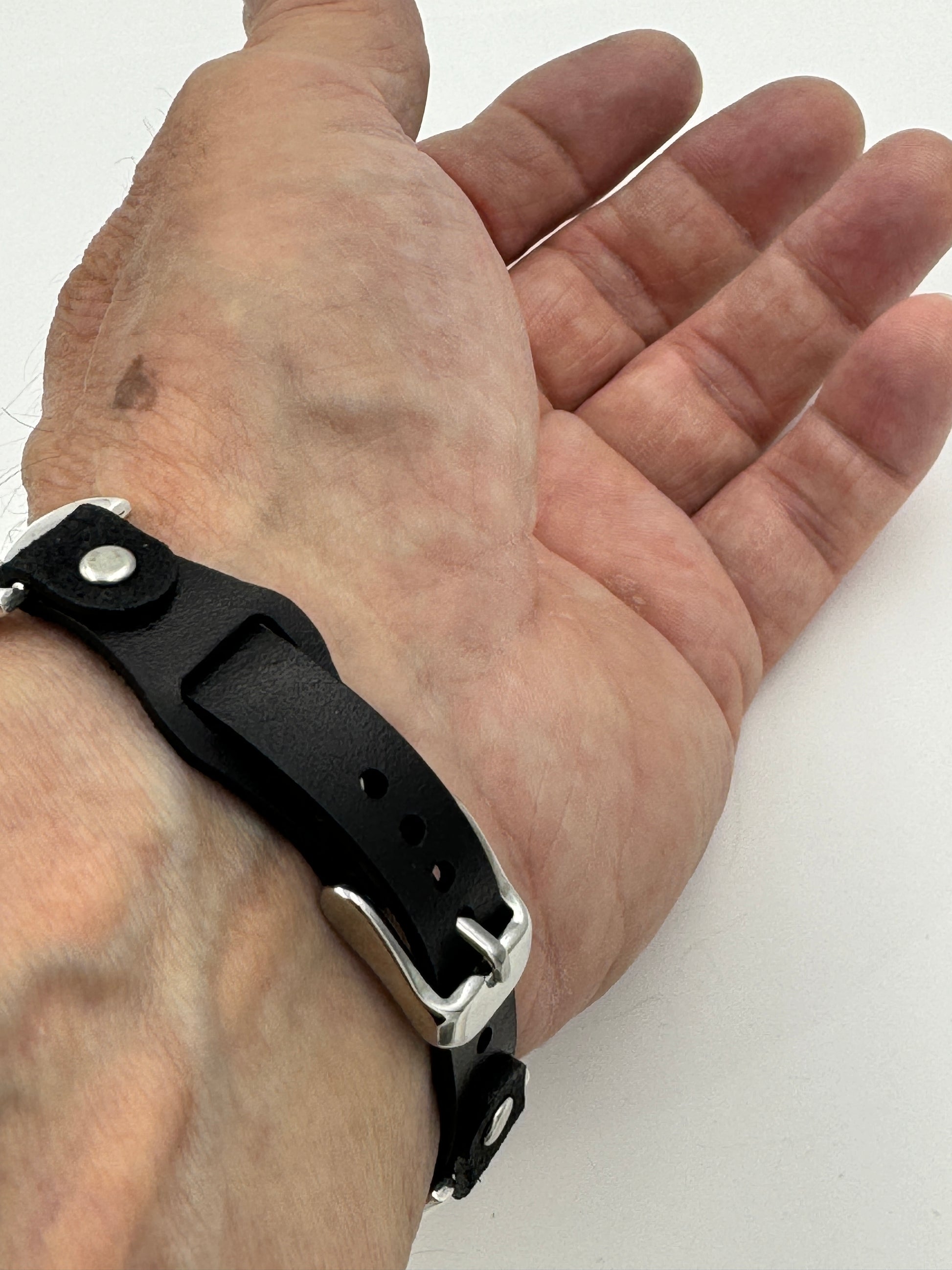The iBand comes with a choice of our new Laser Cut Riveted bands in a variety of colors and styles. We can do a button band or a buckle band in a variety of colors and sizes. This band shown has our latest ladies S/M black buckle no loop band v6.0 UB. This buckle band has smaller holes which should last longer and gives a more precise fit than previous bands. This is a great piece for a medium to large size wrist. By changing the leather band we can make this band fit virtually any wrist nicely. Choose your band size at checkout and we will contact you to assure a nice fit. The iBand will seamlessly integrate with the Apple 42mm Series 1 thru Series 9 45mm WATCH. We can also make this band work with the bigger 49mm Ultra Apple Watches by changing the adapters.
