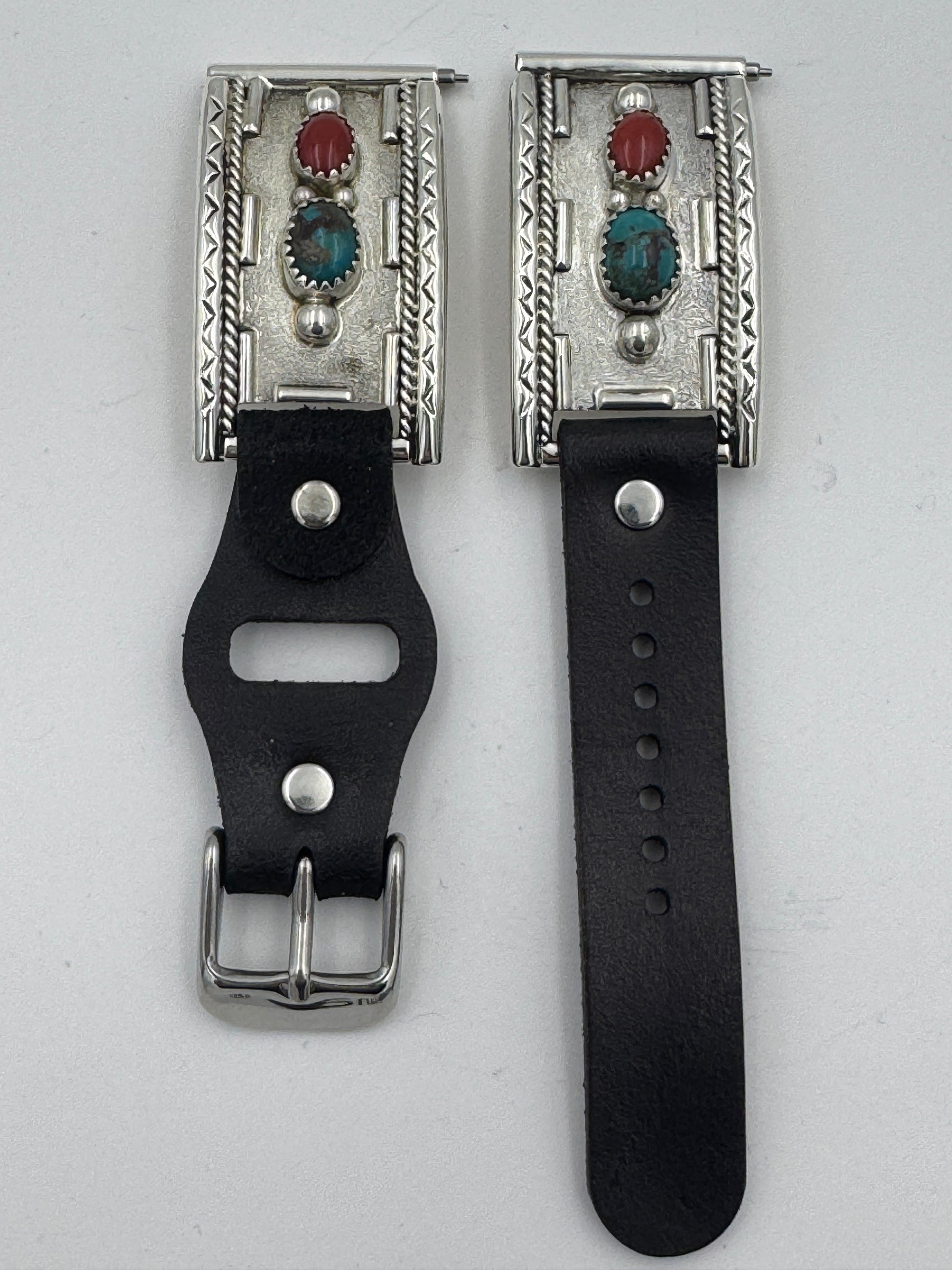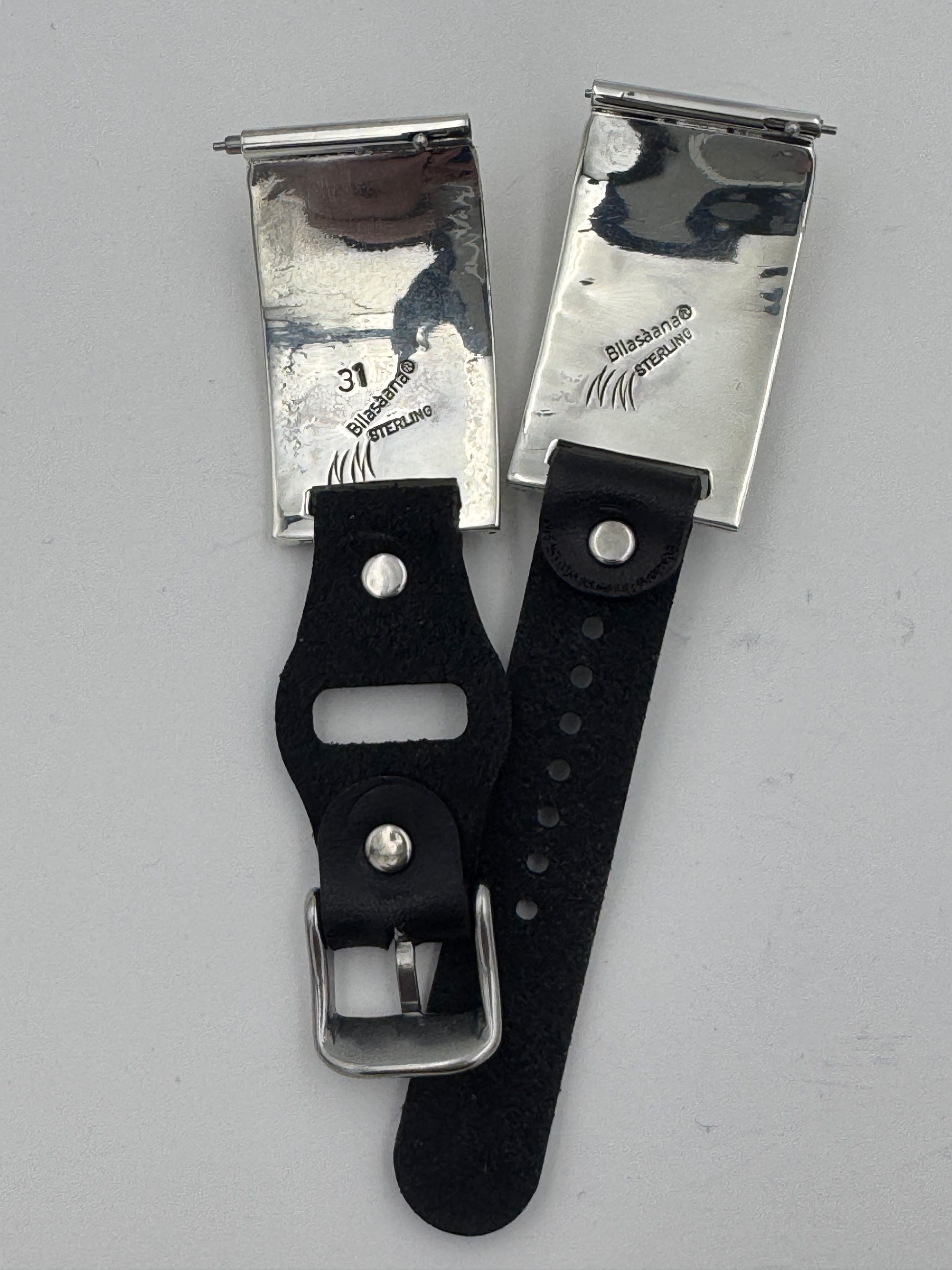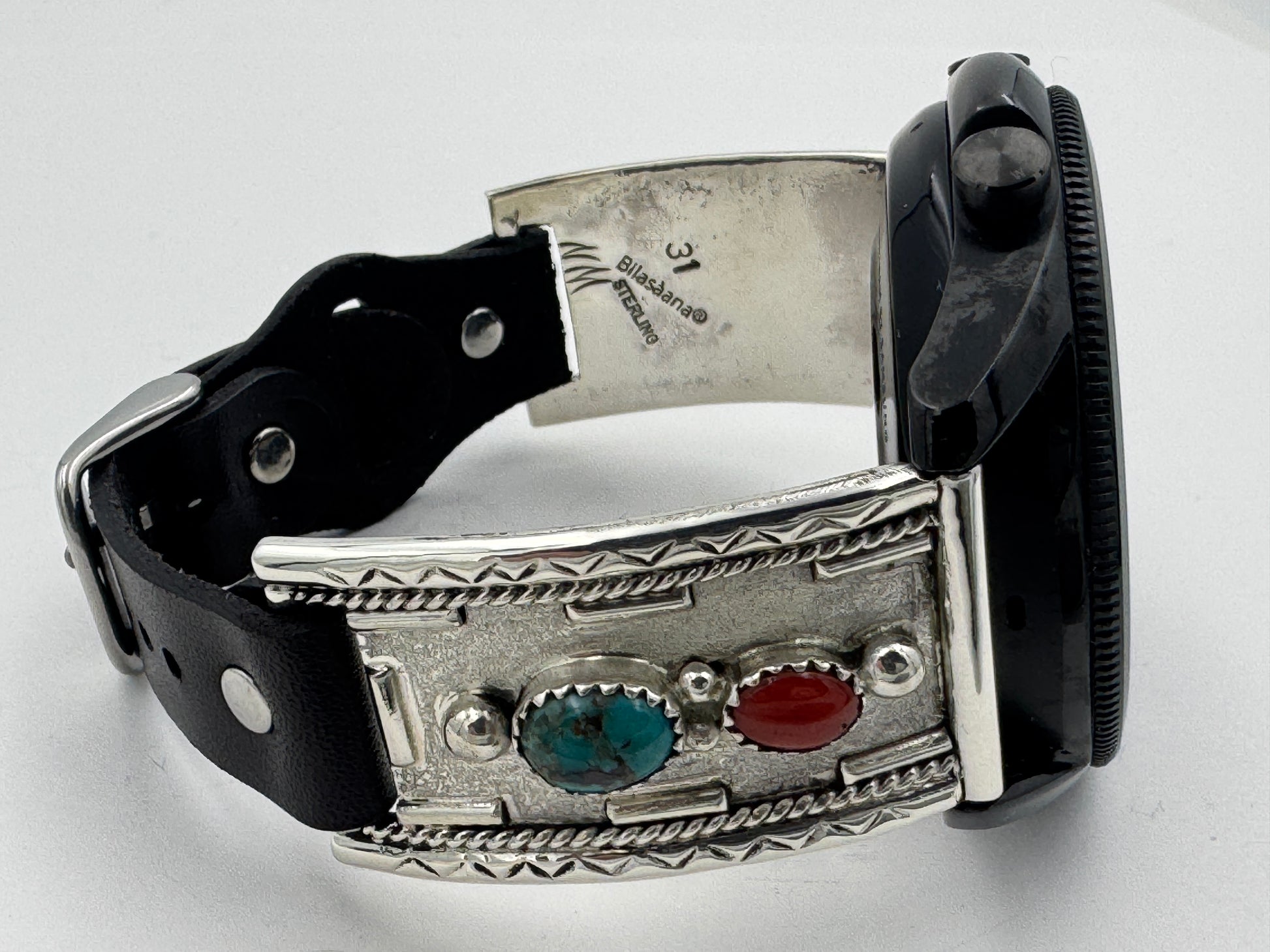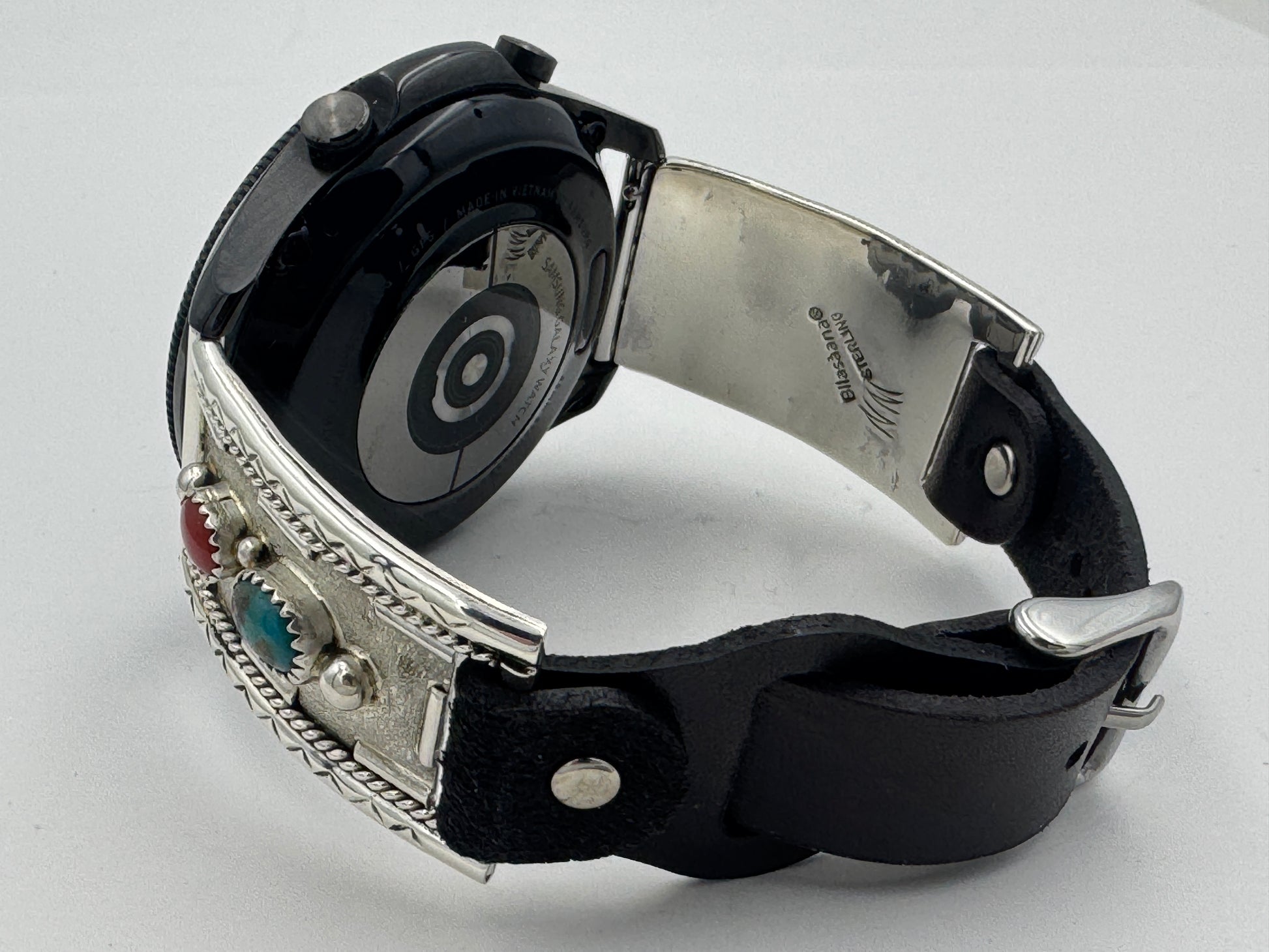 The iBand consists of two Sterling Silver Tips with 22mm Spring loaded Knob adapters and a Laser Cut Leather Band. The Sterling Silver Tips are Handcrafted by Nelson Morgan of the Navajo Nation and using a Twisted Wire, beads and stamp design with Kingman Turquoise and Coral on each side. The silver tips are specifically designed to work with the Samsung Galaxy 3 45mm watch or will work with other watches with 22mm spring bars. There are slots on the tubing to support the quick release knob pins. On the inside of one Tip is the official Bilasáana Trademark, the serial number 31, a Sterling mark and Nelson's mark. The other tip has Bilasaana, Sterling and Nelson marks.