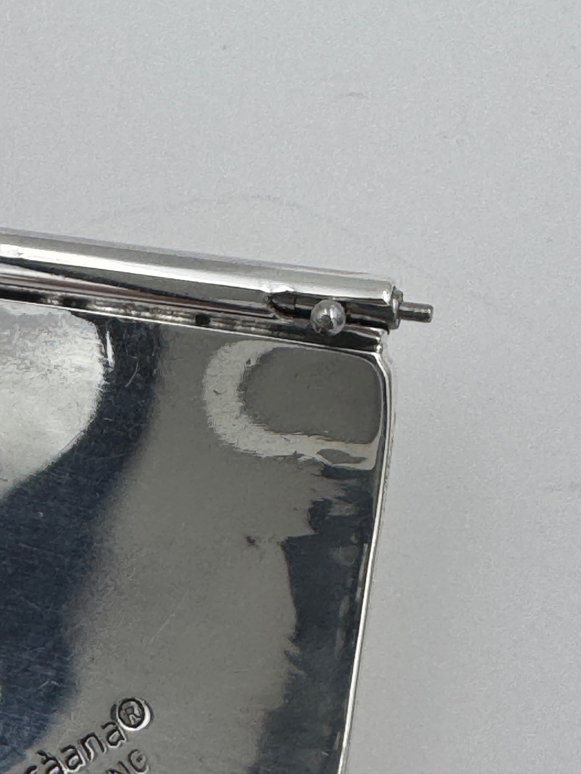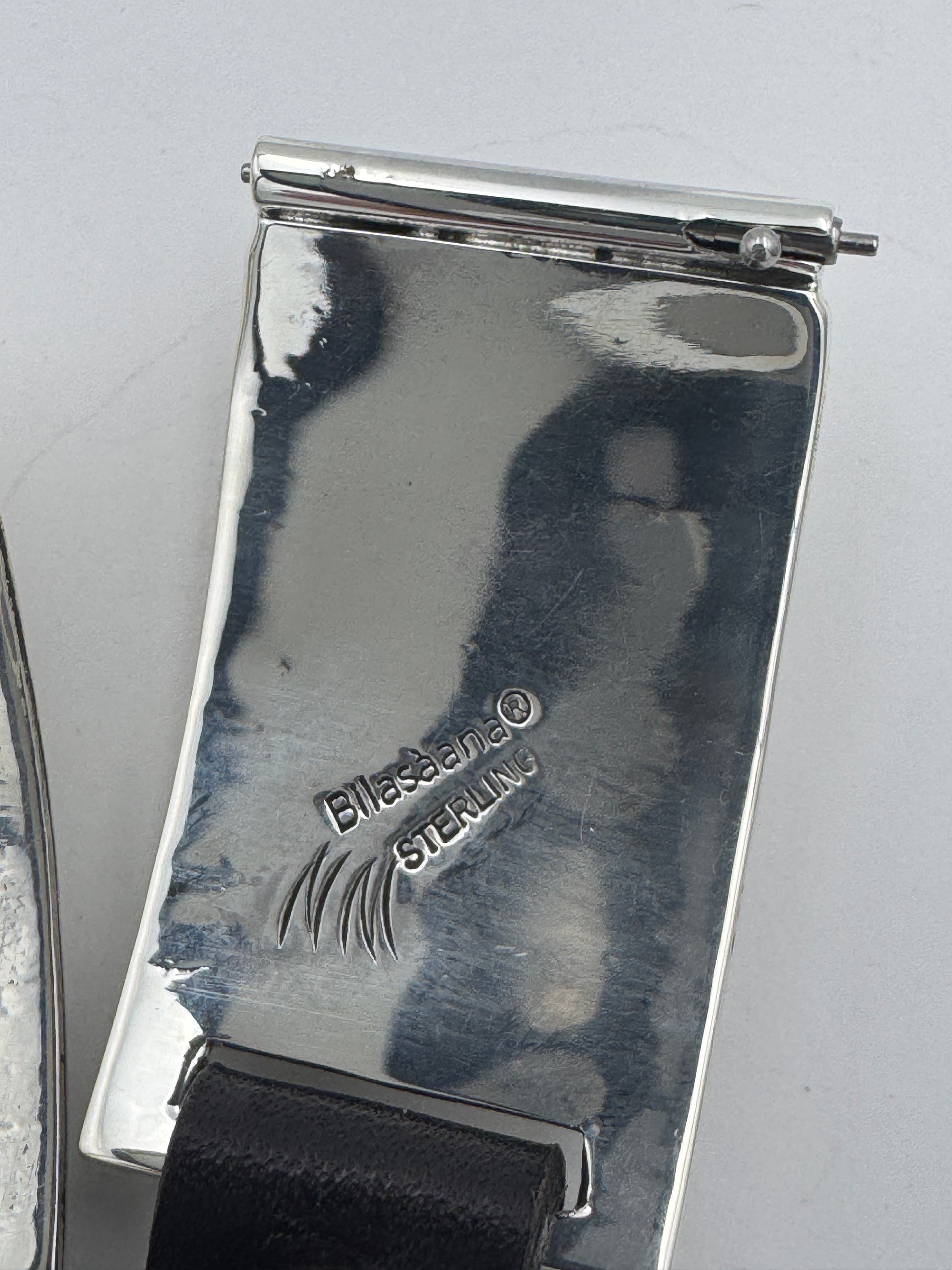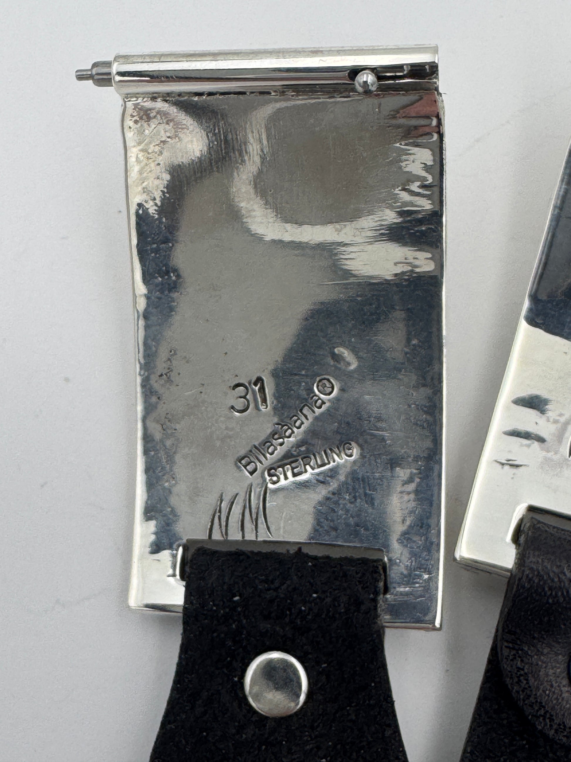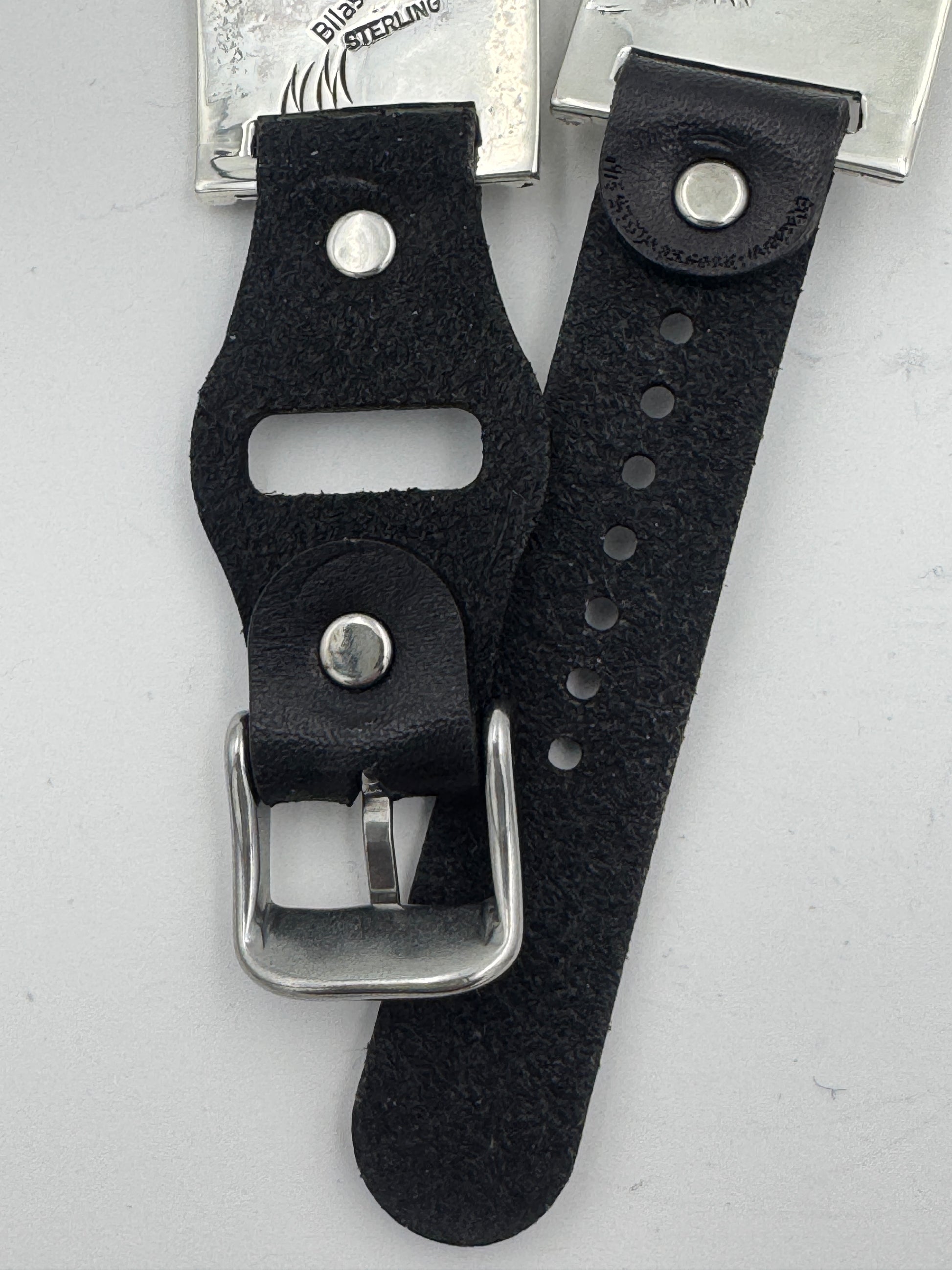 The iBand consists of two Sterling Silver Tips with 22mm Spring loaded Knob adapters and a Laser Cut Leather Band. The Sterling Silver Tips are Handcrafted by Nelson Morgan of the Navajo Nation and using a Twisted Wire, beads and stamp design with Kingman Turquoise and Coral on each side. The silver tips are specifically designed to work with the Samsung Galaxy 3 45mm watch or will work with other watches with 22mm spring bars. There are slots on the tubing to support the quick release knob pins. On the inside of one Tip is the official Bilasáana Trademark, the serial number 31, a Sterling mark and Nelson's mark. The other tip has Bilasaana, Sterling and Nelson marks.