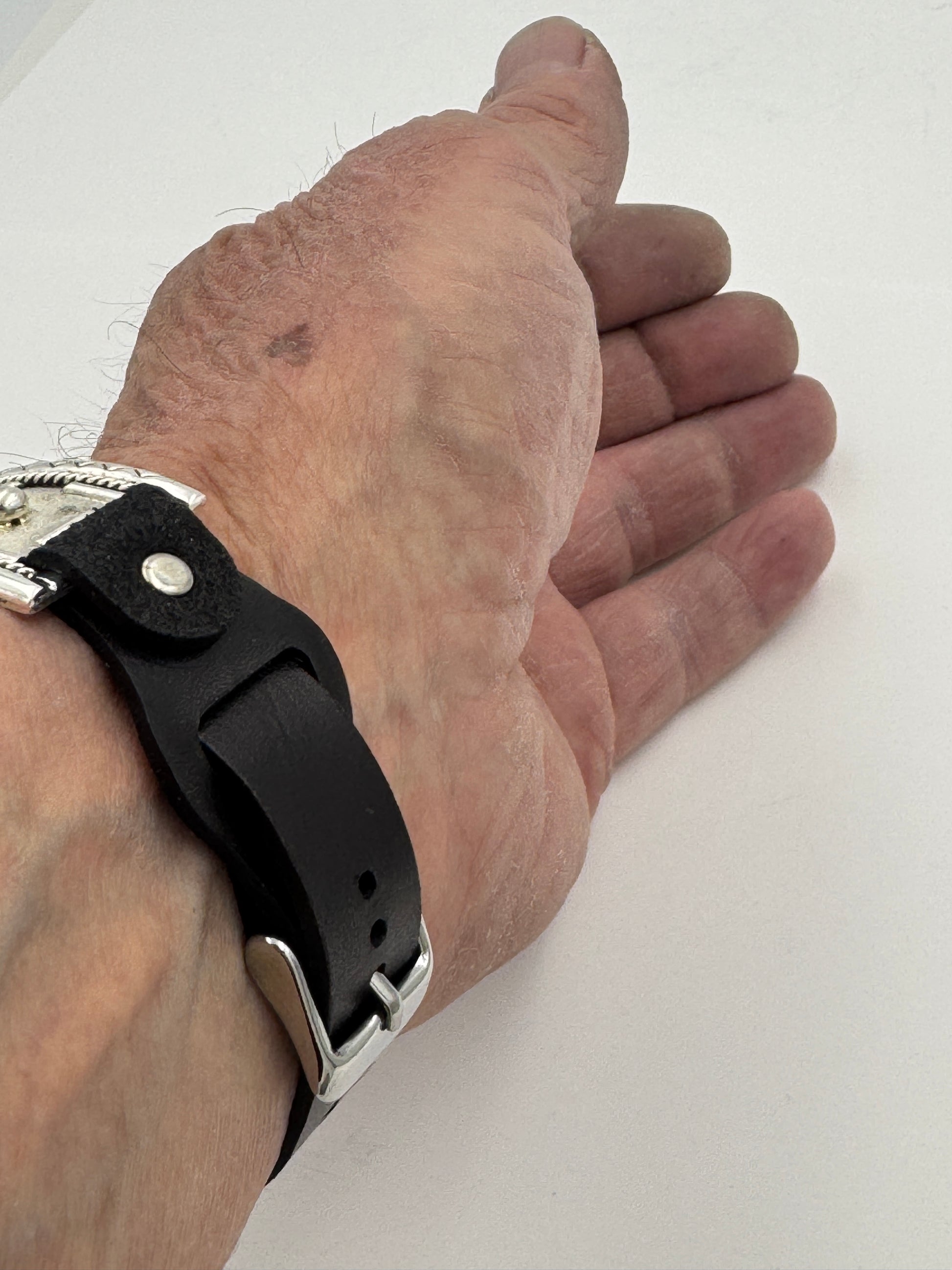 The iBand comes with a choice of our new Laser Cut Riveted bands in a variety of colors and styles. We can do a button band or a buckle band in a variety of colors and sizes. This band shown has our latest buckle band v6.0 UBB. This new buckle band has smaller holes which should last longer and gives a more precise fit. This is a great piece for a small to large size wrist. By changing the leather band we can make this band fit virtually any wrist nicely. Choose your band size at checkout and we will contact you to assure a nice fit. The iBand will seamlessly integrate with the Samsung Galaxy 45mm Watch and other watches with 22mm spring bars.