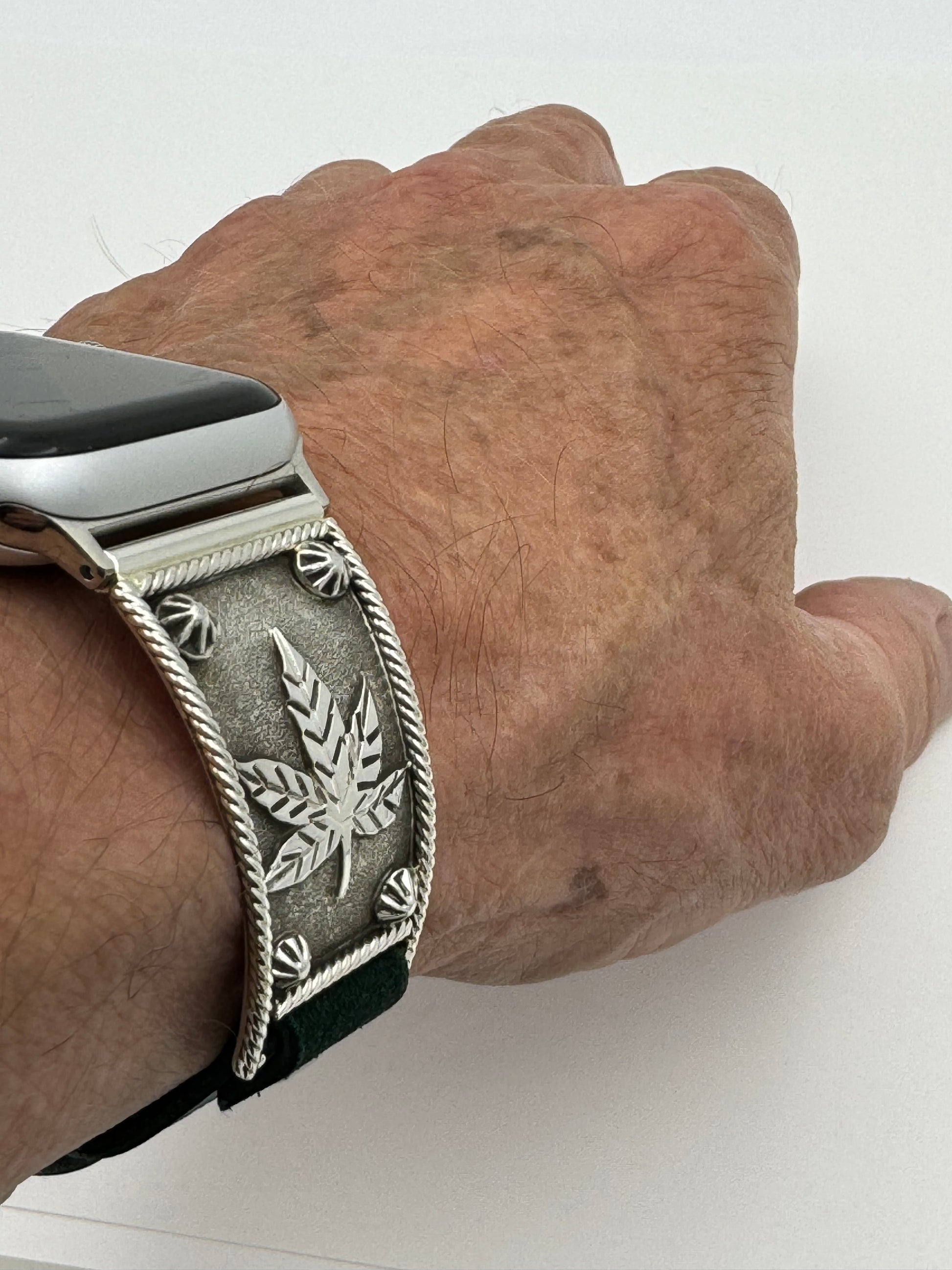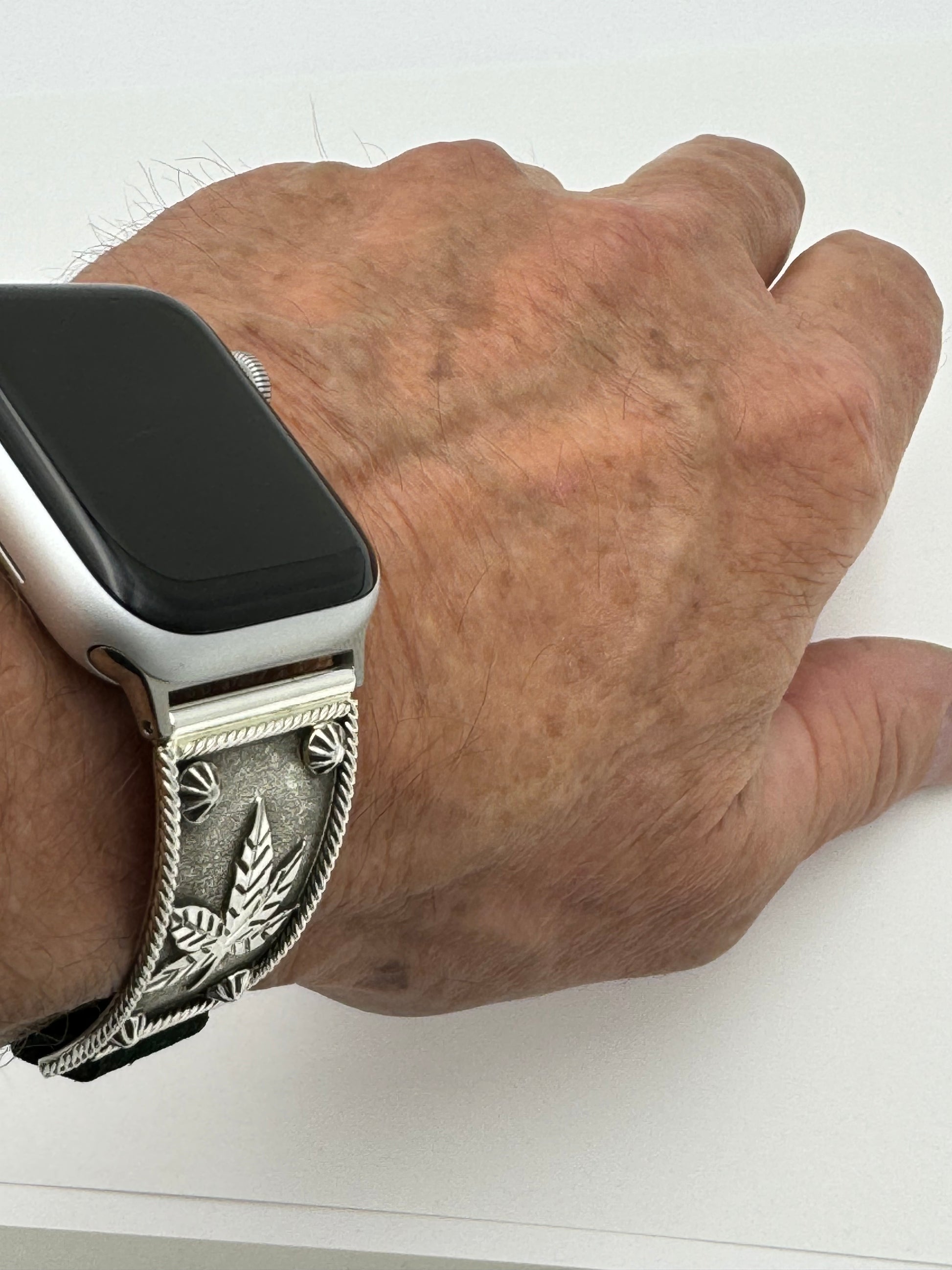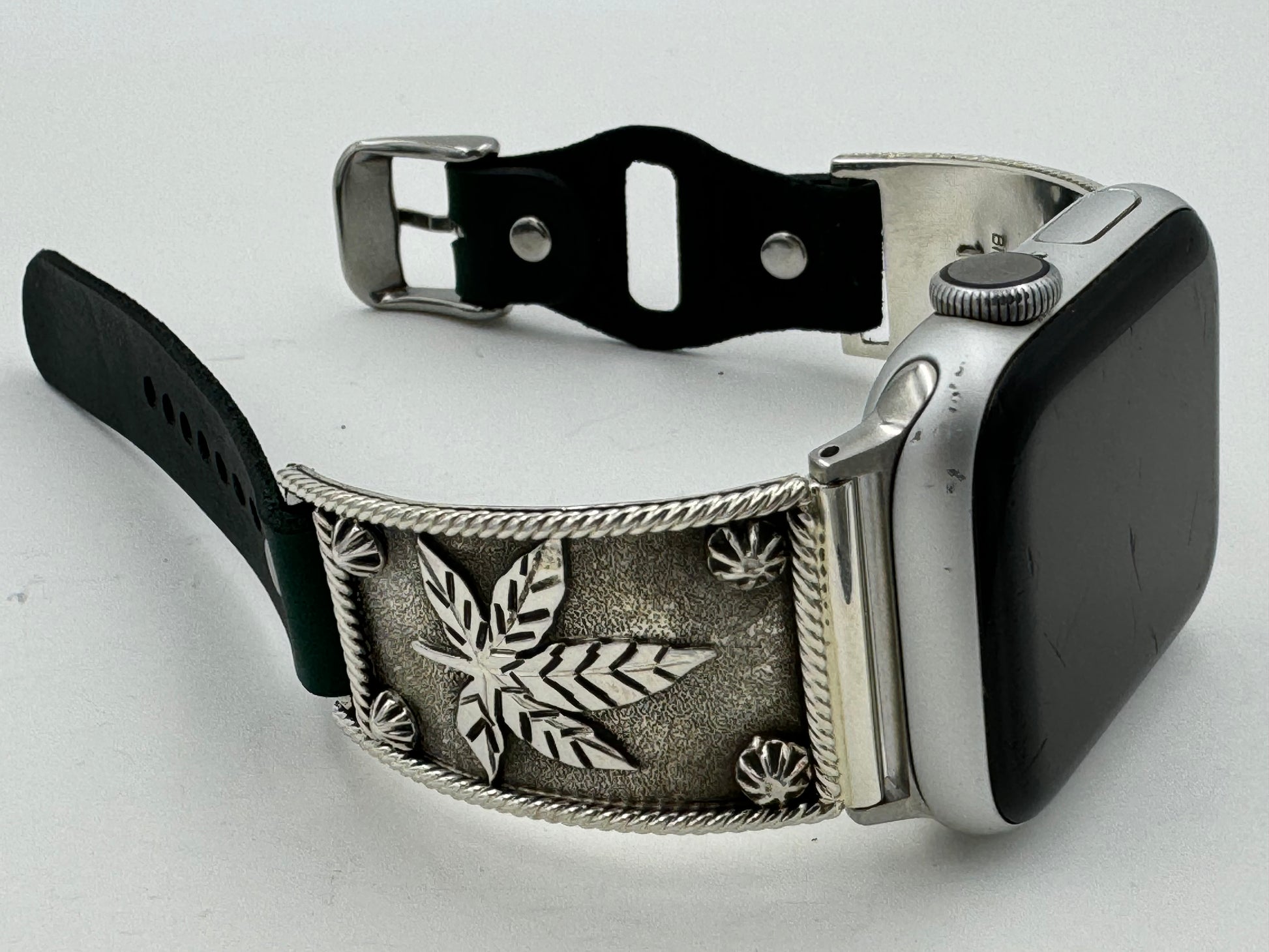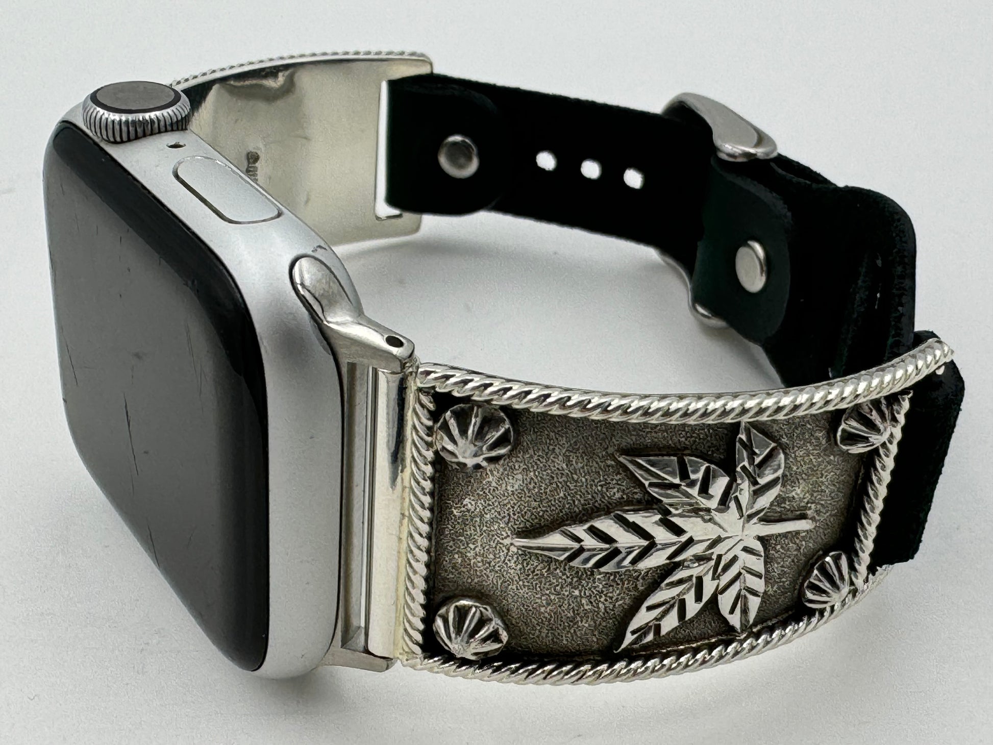 This is Ronnie Spencer's 160th Bilasáana piece offered. The iBand consists of two Sterling Silver Tips with 38/40/41mm WATCH adapters and a Laser Cut Leather Band. The Sterling Silver Tips are Handcrafted by Ronnie Spencer of the Navajo Nation and have an authentic Cannabis design with a handmade leaf. On the inside of one Tip is the official Bilasáana Trademark, the serial number 160, a Sterling mark and Ronnie's *RS* authenticity mark. The other tip has a Sterling mark.