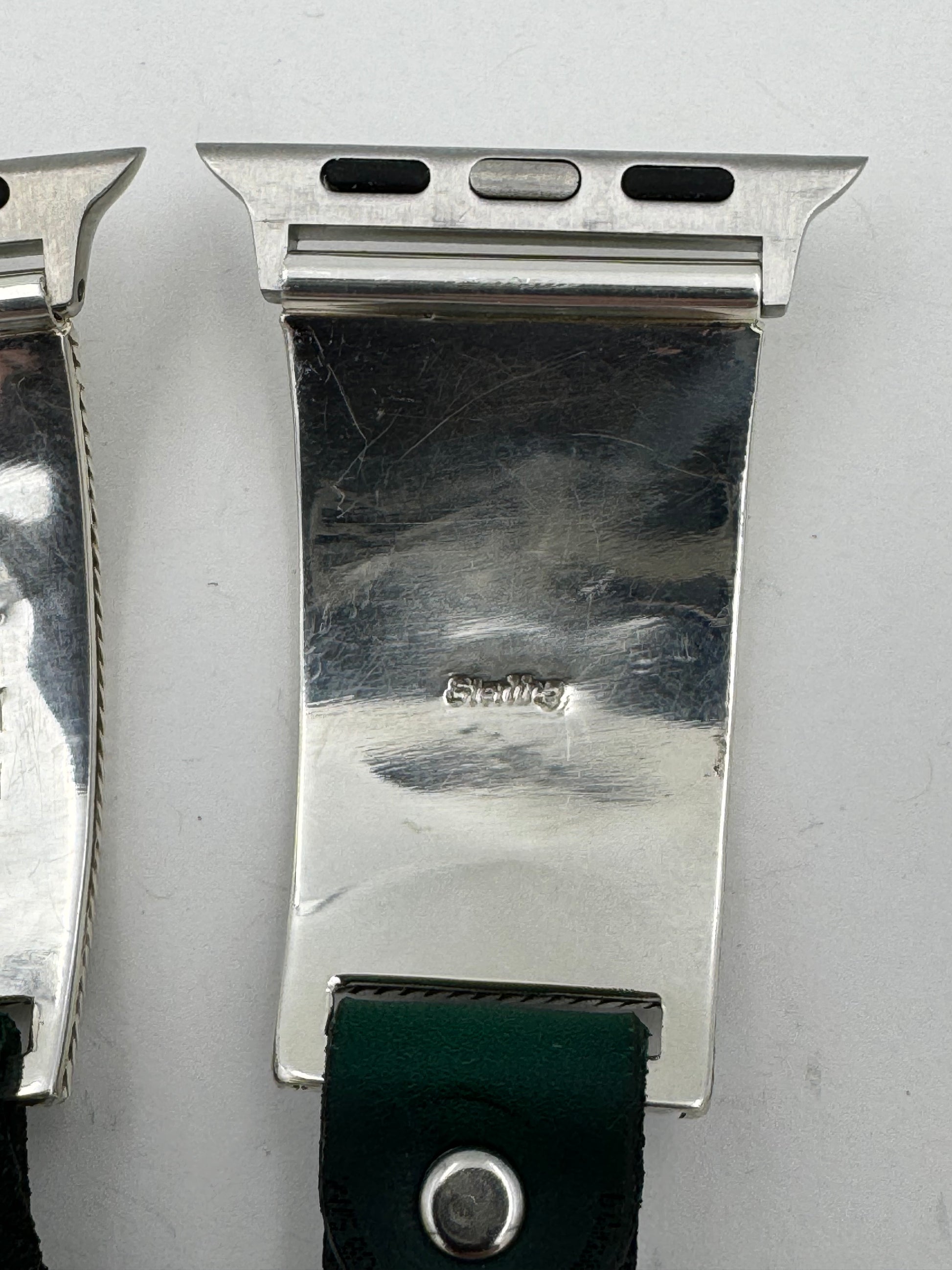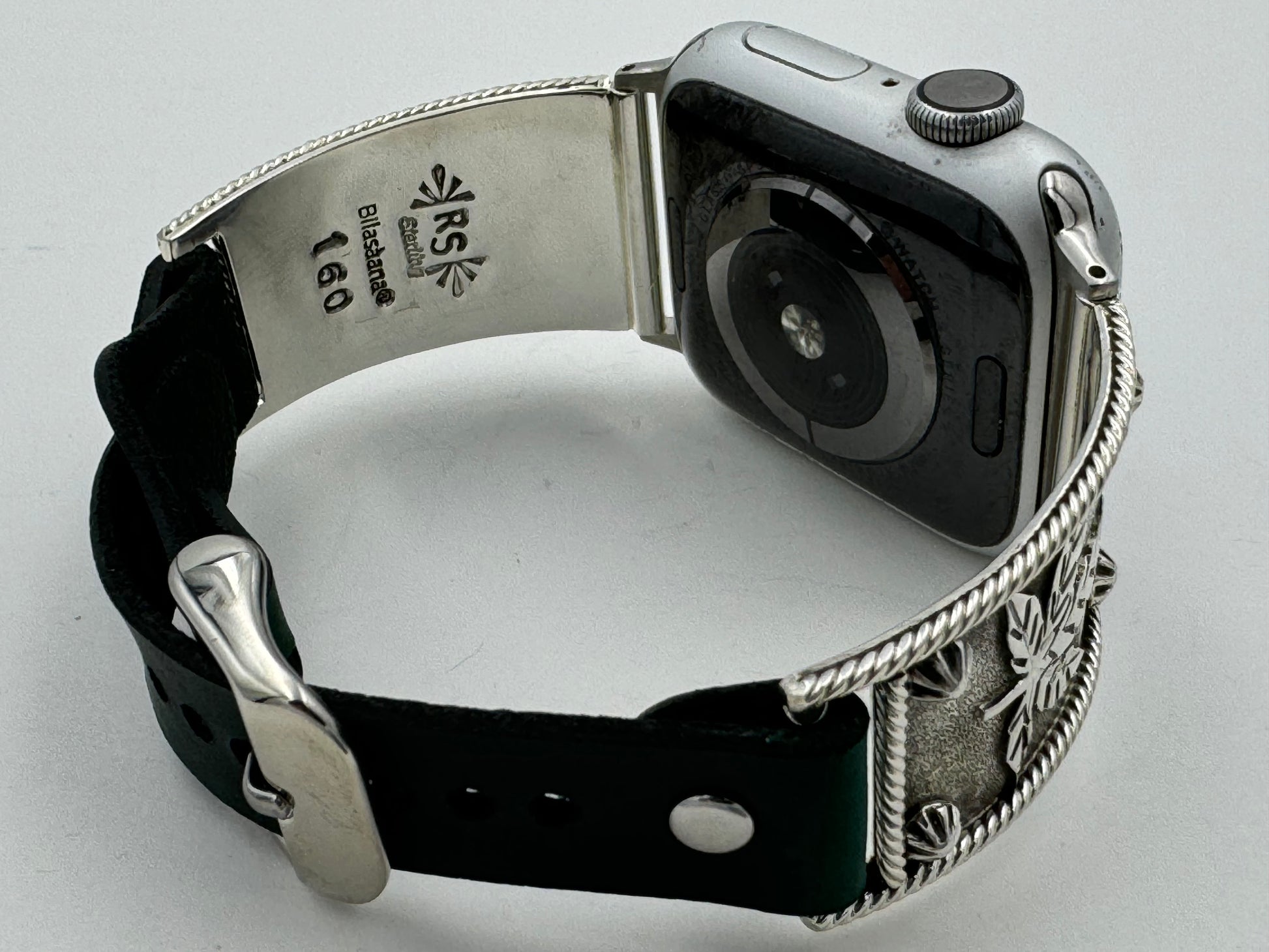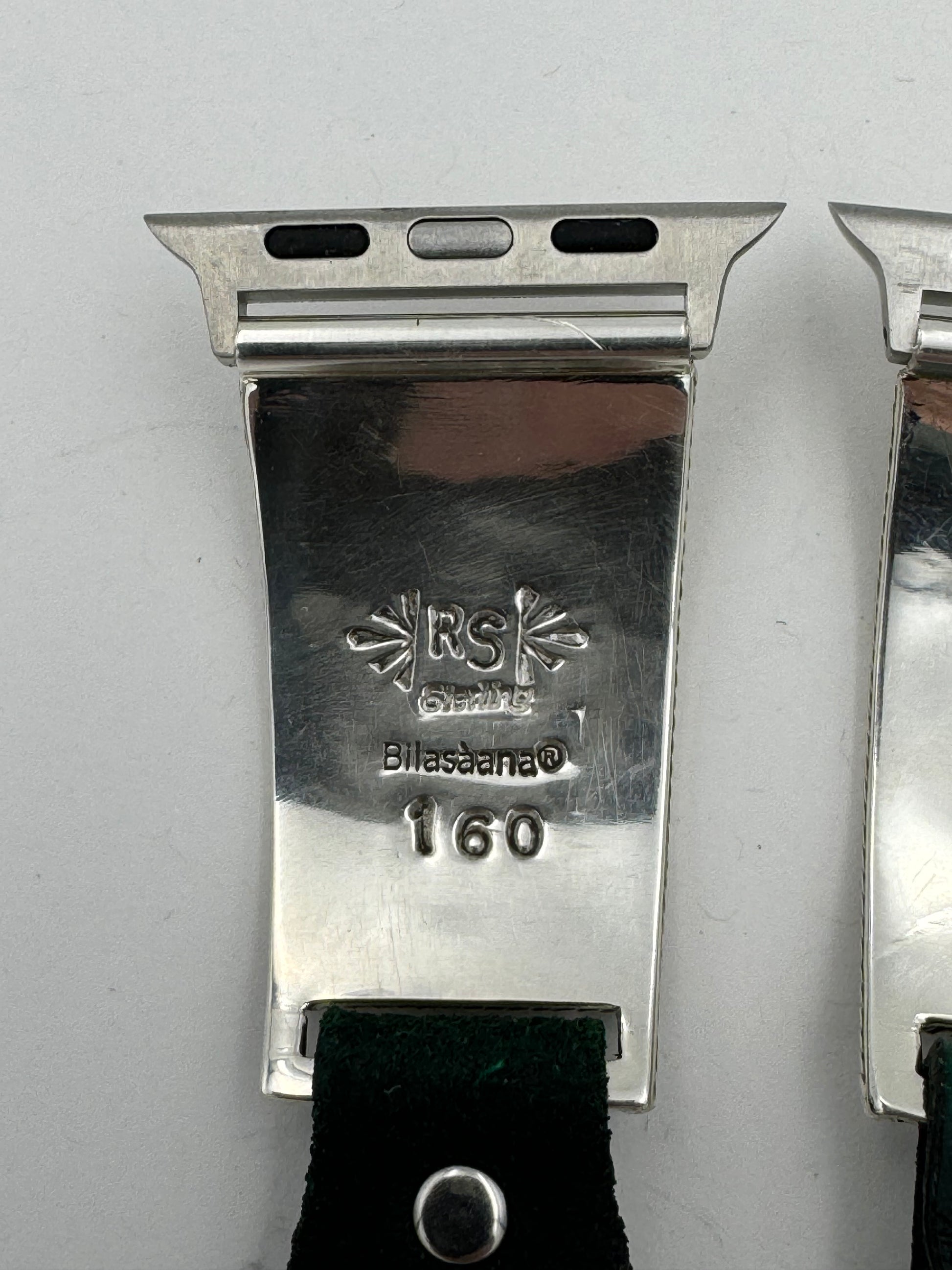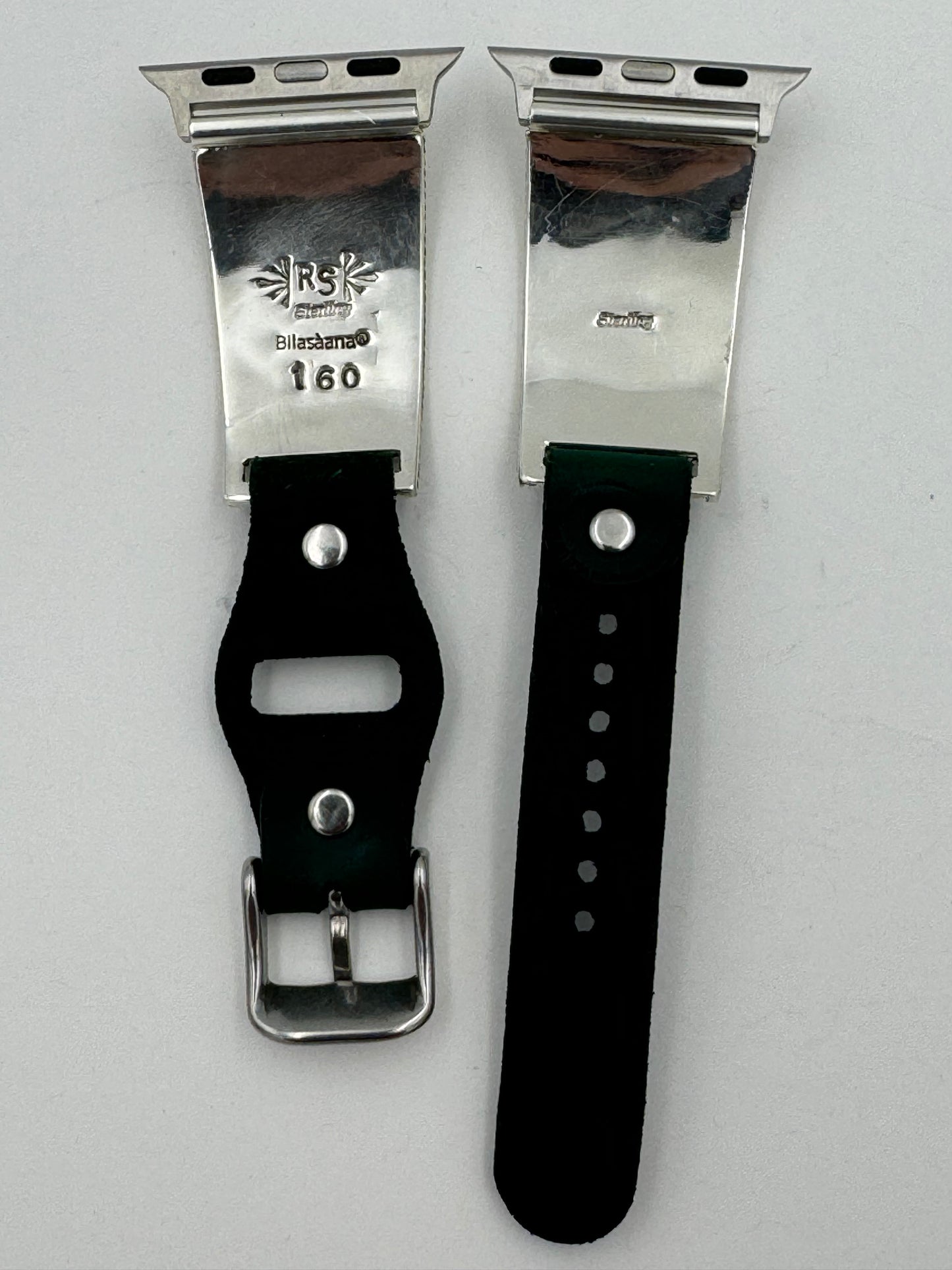 This is Ronnie Spencer's 160th Bilasáana piece offered. The iBand consists of two Sterling Silver Tips with 38/40/41mm WATCH adapters and a Laser Cut Leather Band. The Sterling Silver Tips are Handcrafted by Ronnie Spencer of the Navajo Nation and have an authentic Cannabis design with a handmade leaf. On the inside of one Tip is the official Bilasáana Trademark, the serial number 160, a Sterling mark and Ronnie's *RS* authenticity mark. The other tip has a Sterling mark.