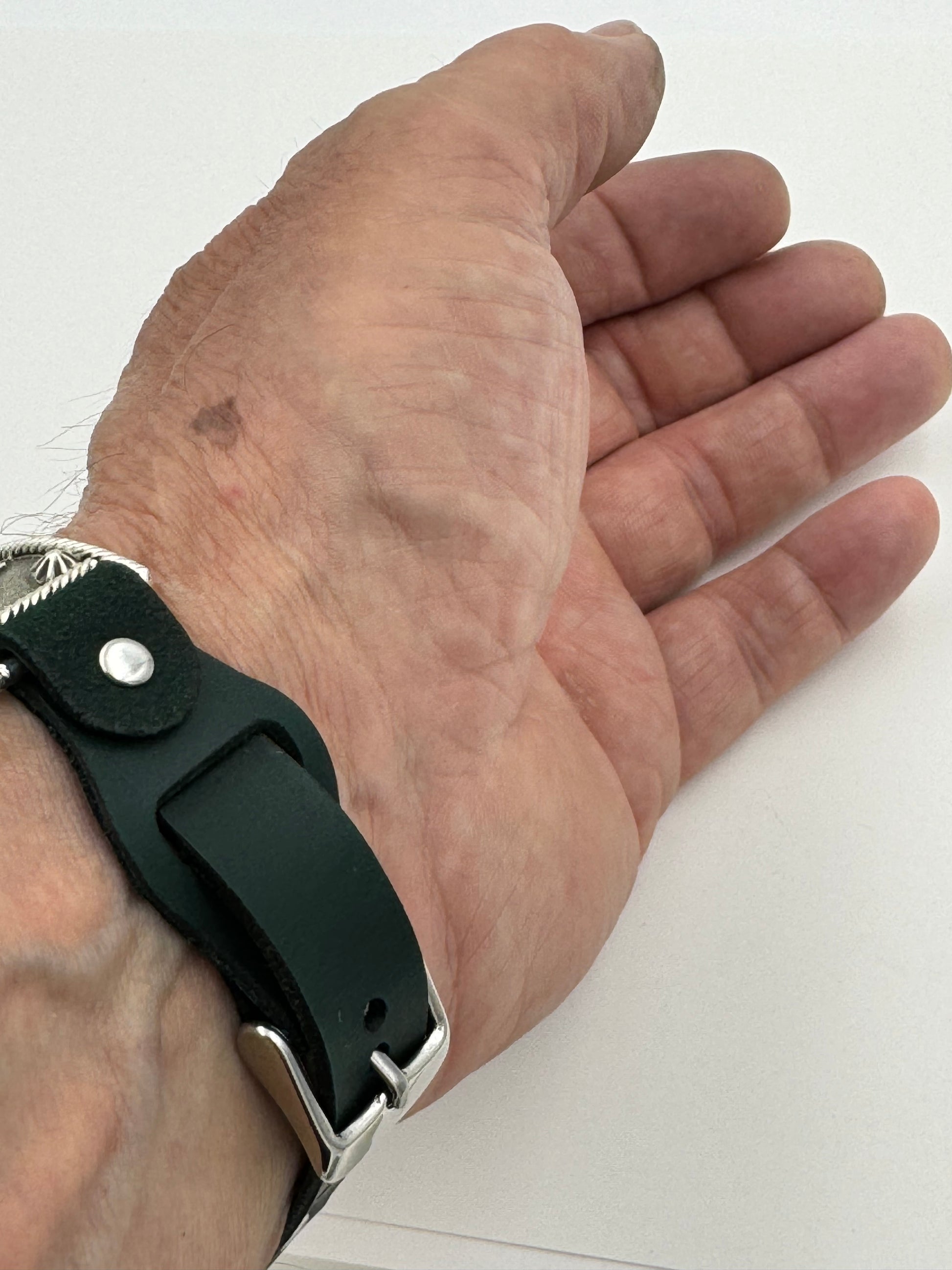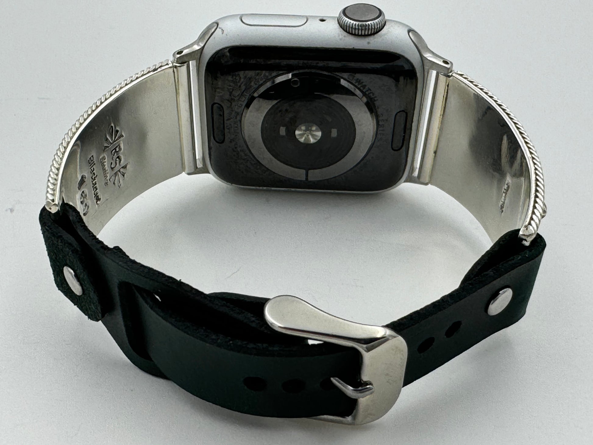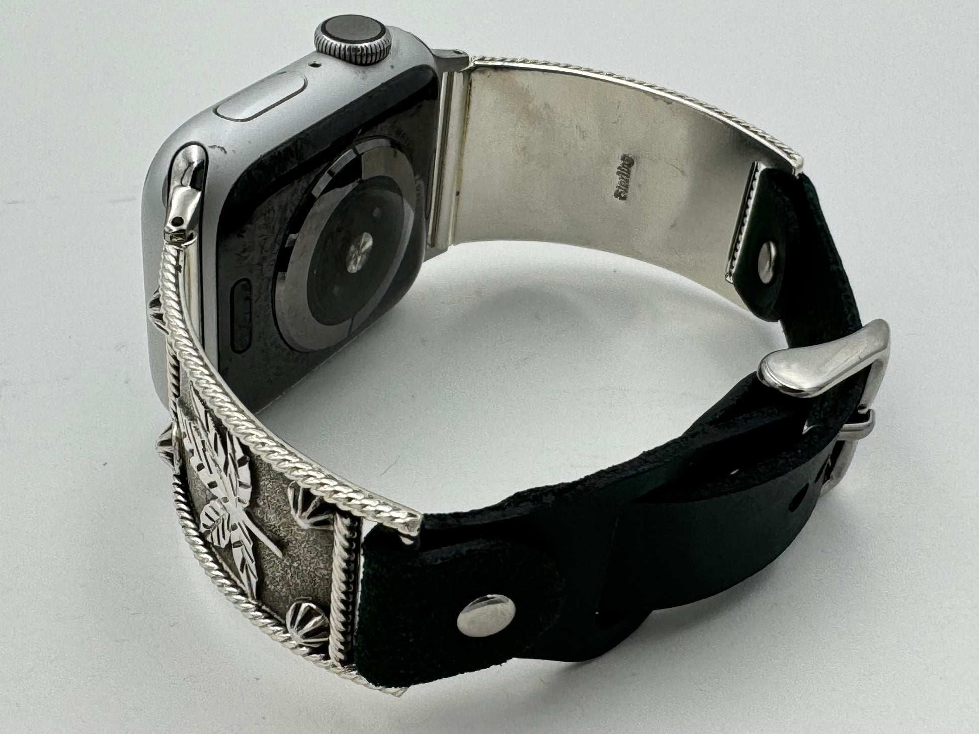 This purchase includes a Handcrafted Native American Sterling Silver Leather iBand for Apple WATCH Series 1 38mm thru Series 9 41mm. The Apple WATCH 38/40/41mm is not included.