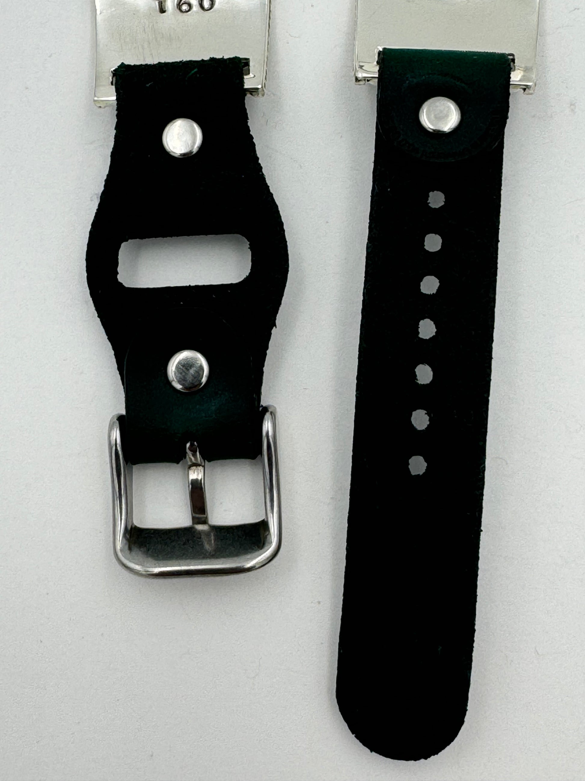 The iBand comes with a choice of our new Laser Cut Riveted bands in a variety of colors and styles. We can do a button band or a buckle band in a variety of colors and sizes. This band shown has our latest buckle band v6.0 UBB done in green. This new buckle band has smaller holes which should last longer and gives a more precise fit. This is a great piece for a small to medium size wrist. By changing the leather band we can make this band fit virtually any wrist nicely. Choose your band size at checkout and we will contact you to assure a nice fit. The iBand will seamlessly integrate with the 38mm Series 1 thru 41mm Series 9 Apple WATCH. We can also adapt this band to the 42/44/45 and 49mm Ultra or Ultra 2 Apple Watch making it a great band for a small wrist with the big Watch.