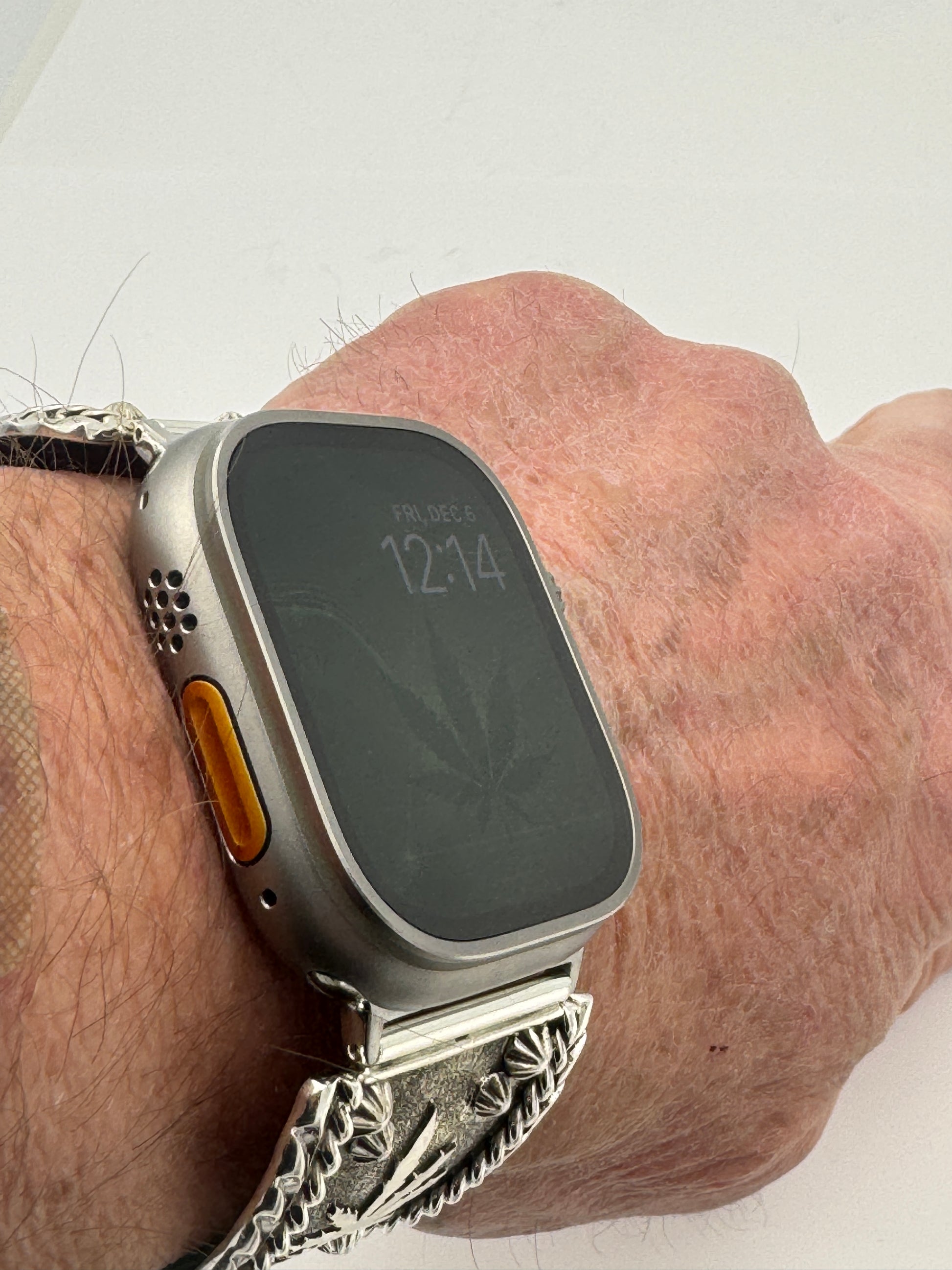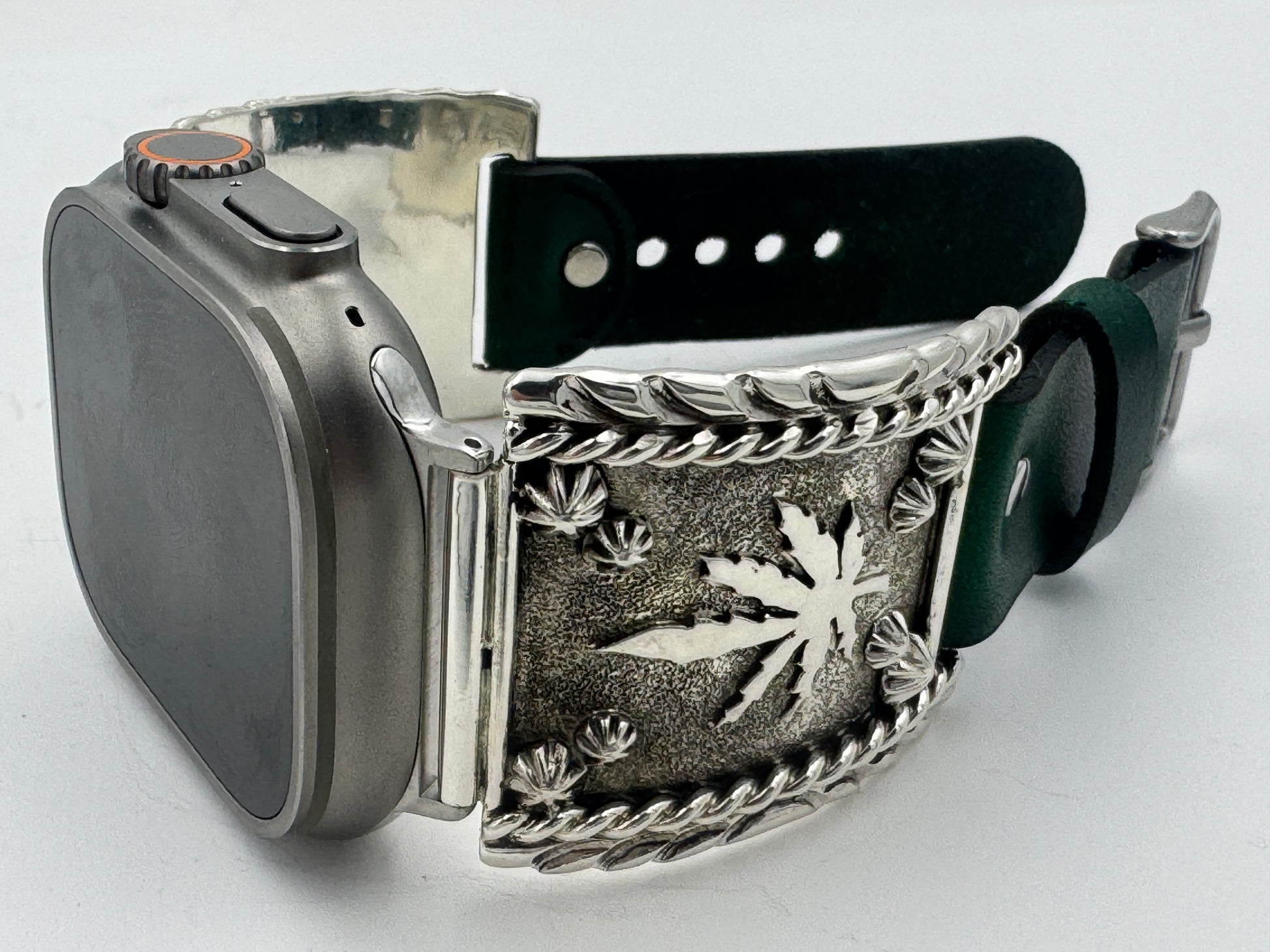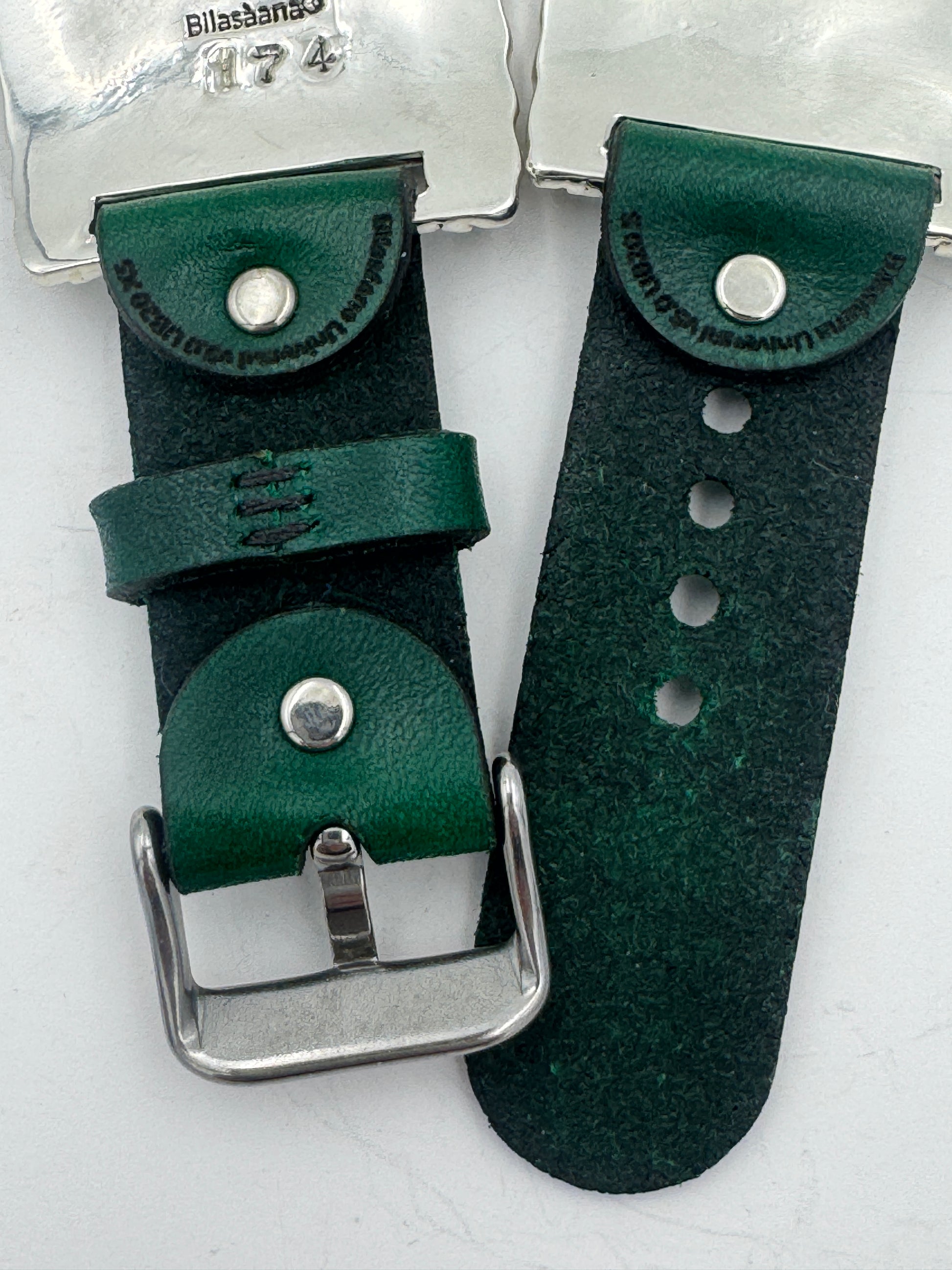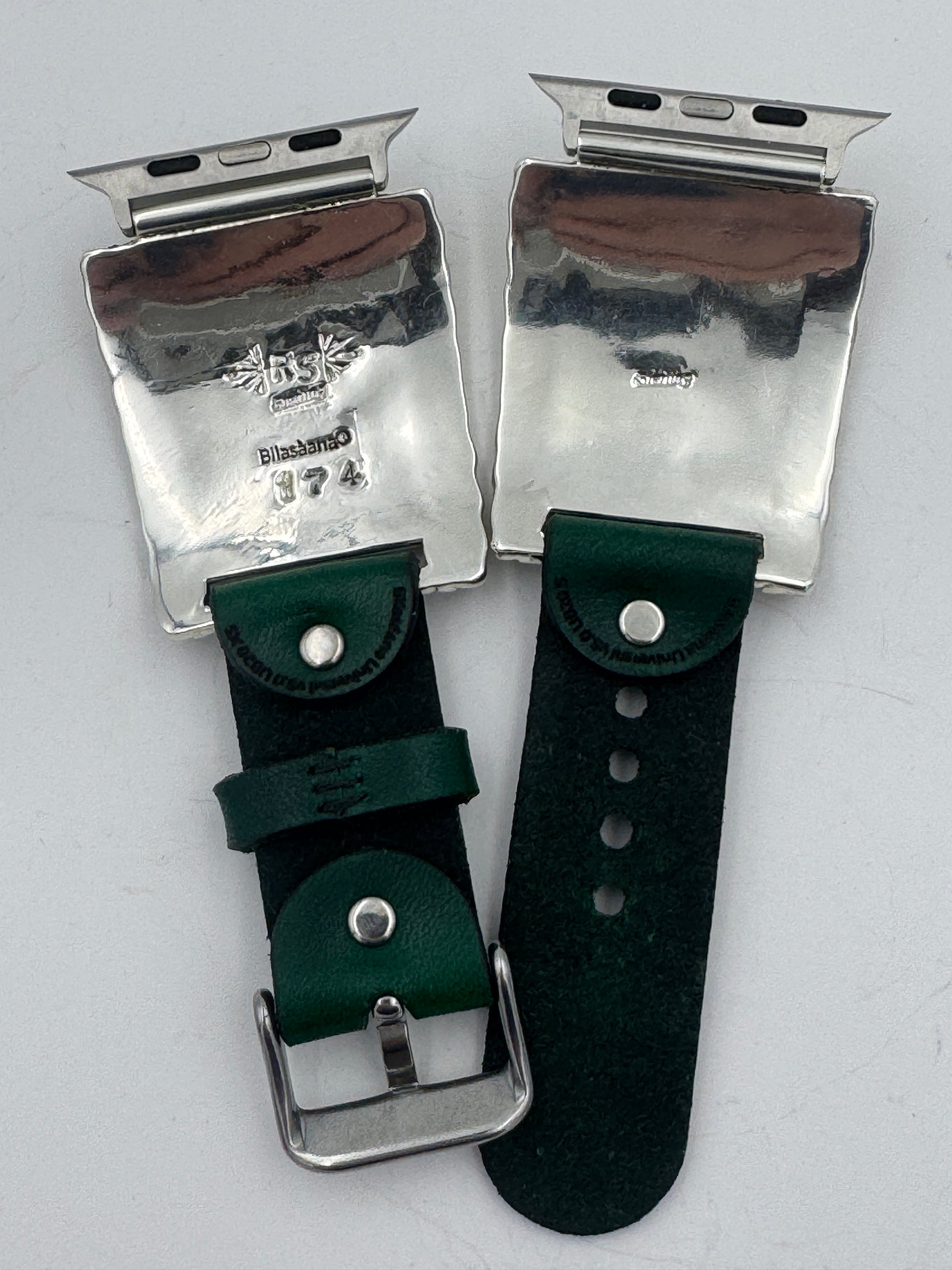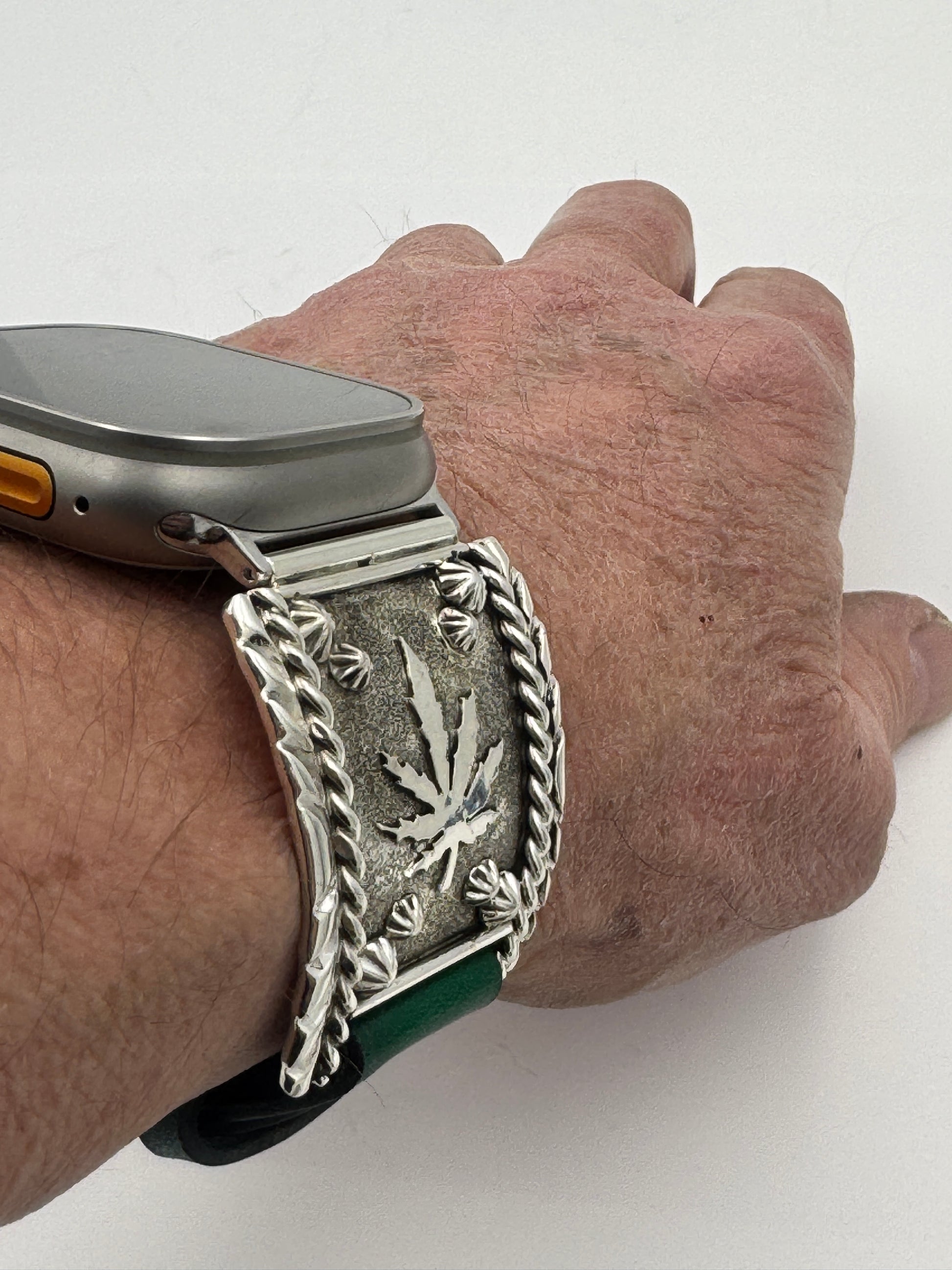 This is Ronnie Spencer's 174th Bilasáana piece offered. The iBand consists of two Sterling Silver Tips with 42/44/45/46/49mm WATCH adapters and a Laser Cut Leather Band. The Sterling Silver Tips are Handcrafted by Ronnie Spencer of the Navajo Nation and have an authentic Cannabis Leaf design. On the inside of one Tip is the official Bilasáana Trademark, the serial number 174, a Sterling mark and Ronnie's *RS* authenticity mark. The other tip has a Sterling mark.
