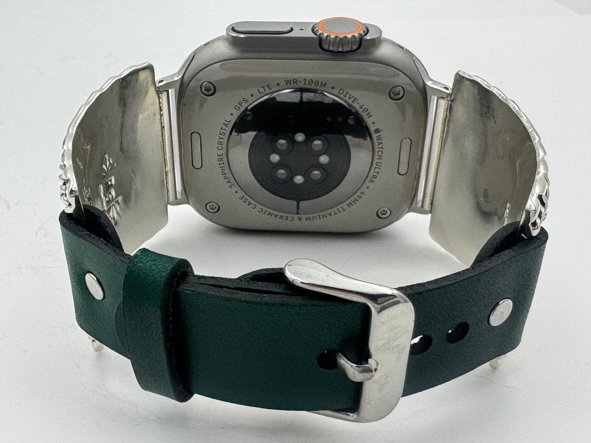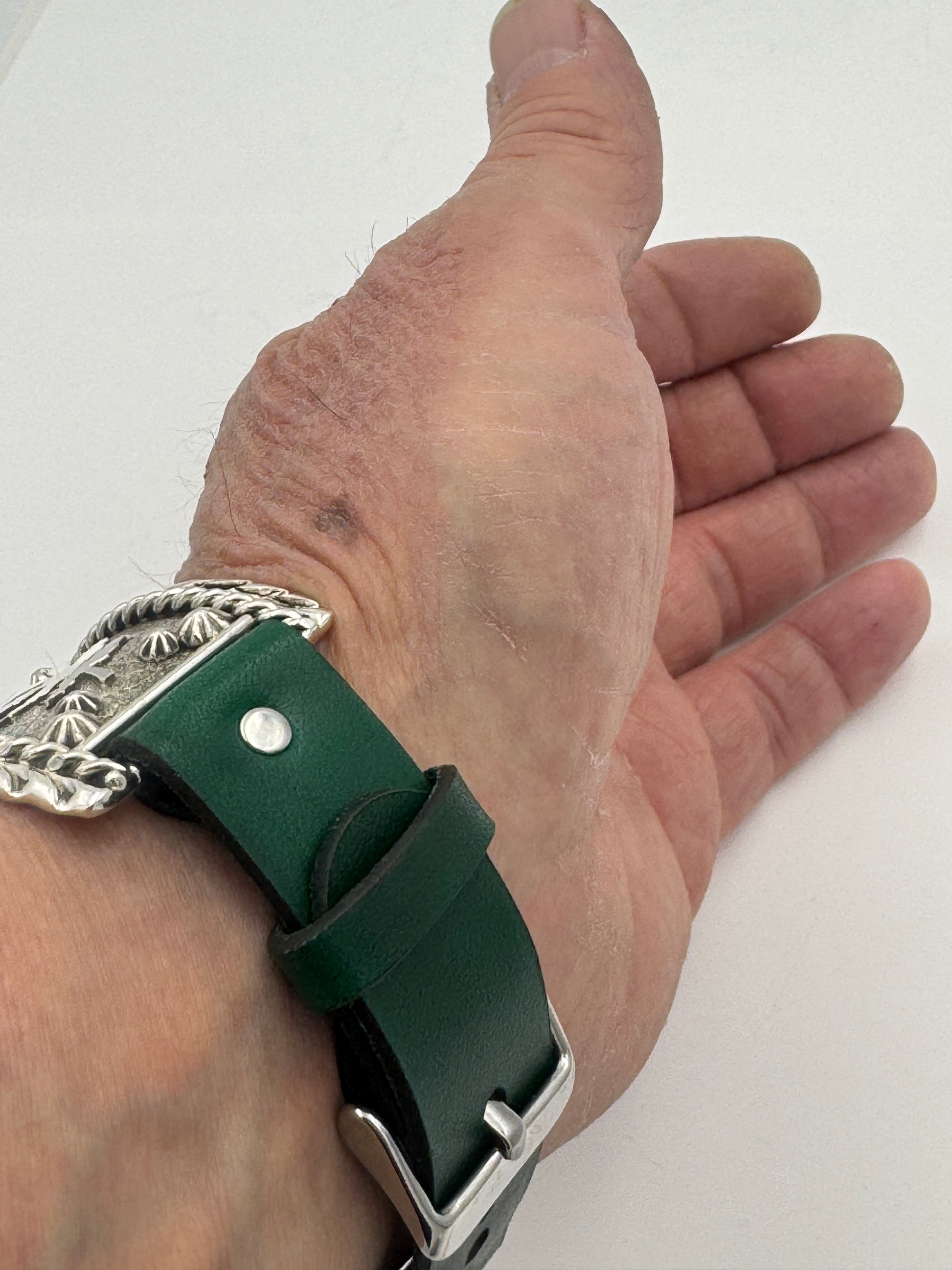 The iBand comes with a choice of our new Laser Cut Riveted bands in a variety of colors. The iBand shown has our XS-4 Universal 20mm Green Leather Buckle Band v5.0 with hand sewn loop attached. This is a wider band from previous versions and is a great piece for a medium to large size wrist. By changing the leather we can make this band fit virtually any wrist nicely. Black, Buckskin and other leather band colors available. Choose your band size at checkout and we will contact you to assure a nice fit. The iBand will seamlessly integrate with the Apple 42mm Series 1 thru Series 10 46mm WATCH. This band will also work nicely with the New Apple Watch 49mm Ultra series I or II.