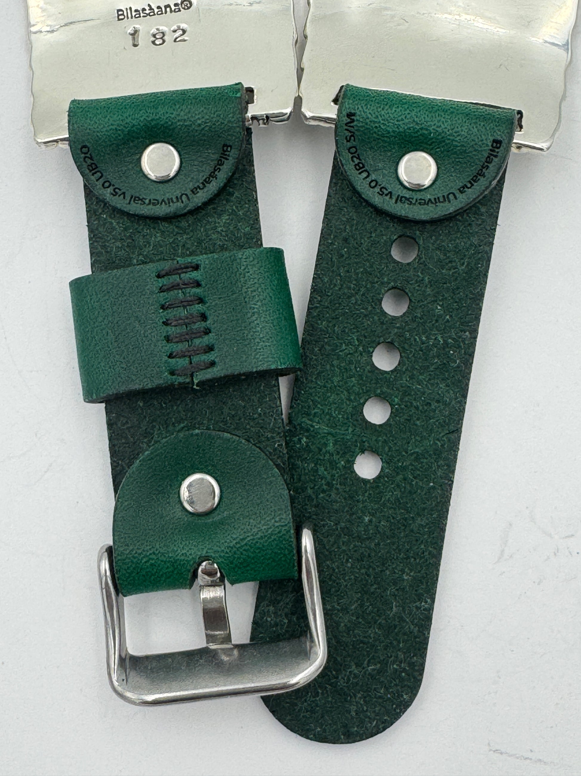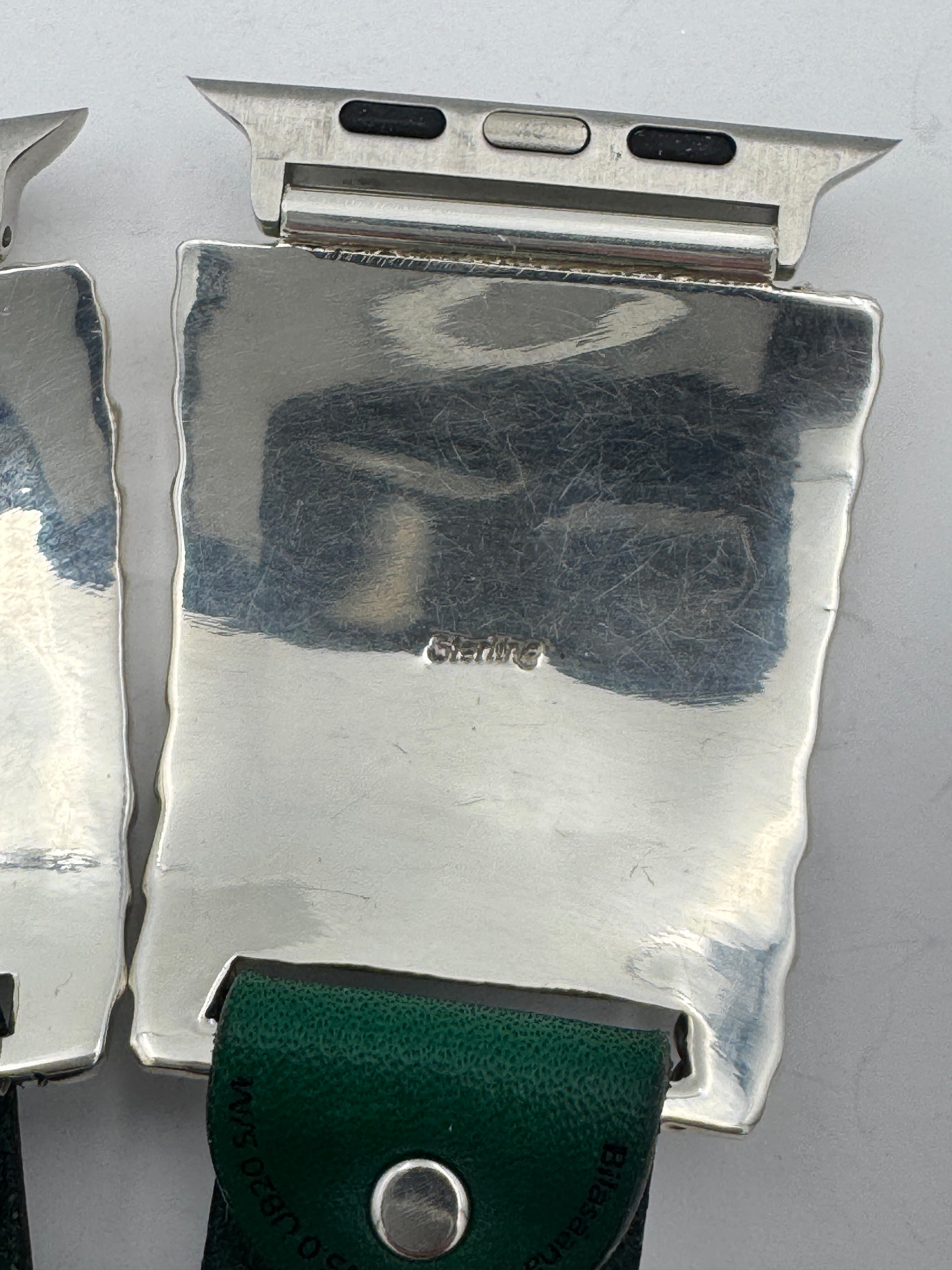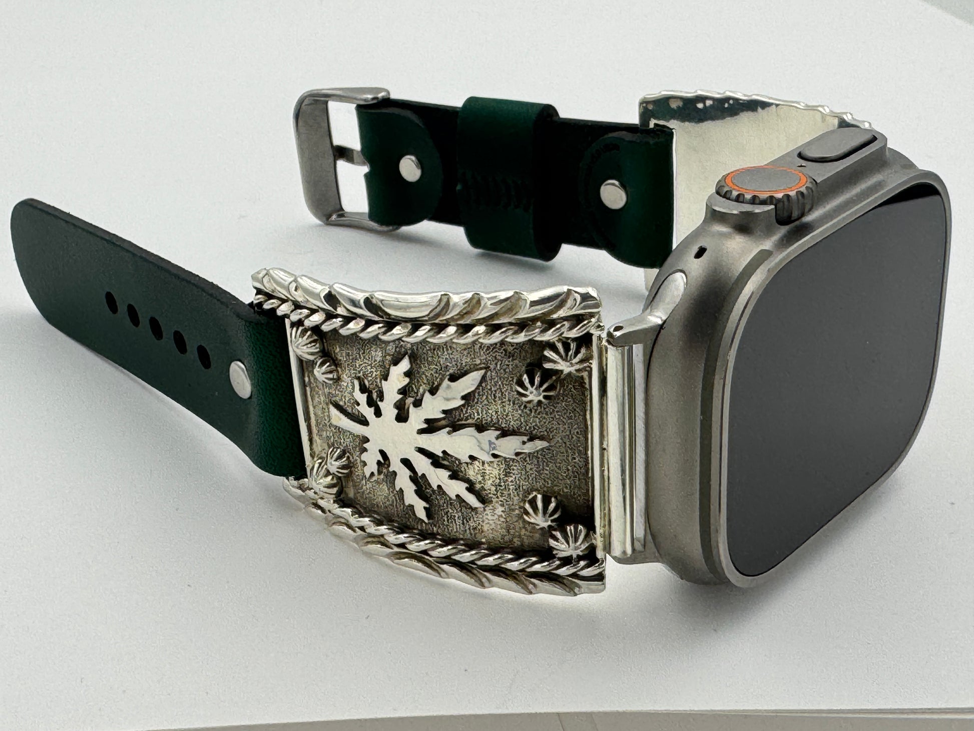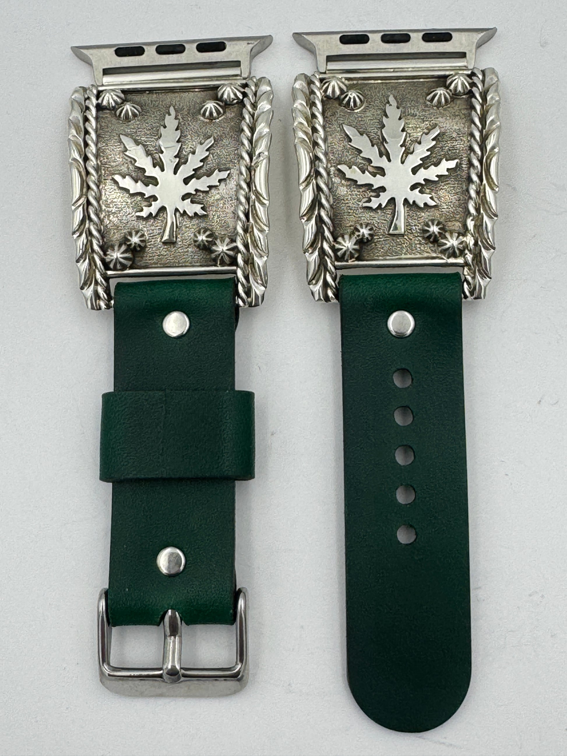 This is Ronnie Spencer's 182nd Bilasáana piece offered. The iBand consists of two Sterling Silver Tips with 42/44/45/46/49mm WATCH adapters and a Laser Cut Leather Band. The Sterling Silver Tips are Handcrafted by Ronnie Spencer of the Navajo Nation and have an authentic Cannabis Leaf design. On the inside of one Tip is the official Bilasáana Trademark, the serial number 182, a Sterling mark and Ronnie's *RS* authenticity mark. The other tip has a Sterling mark.