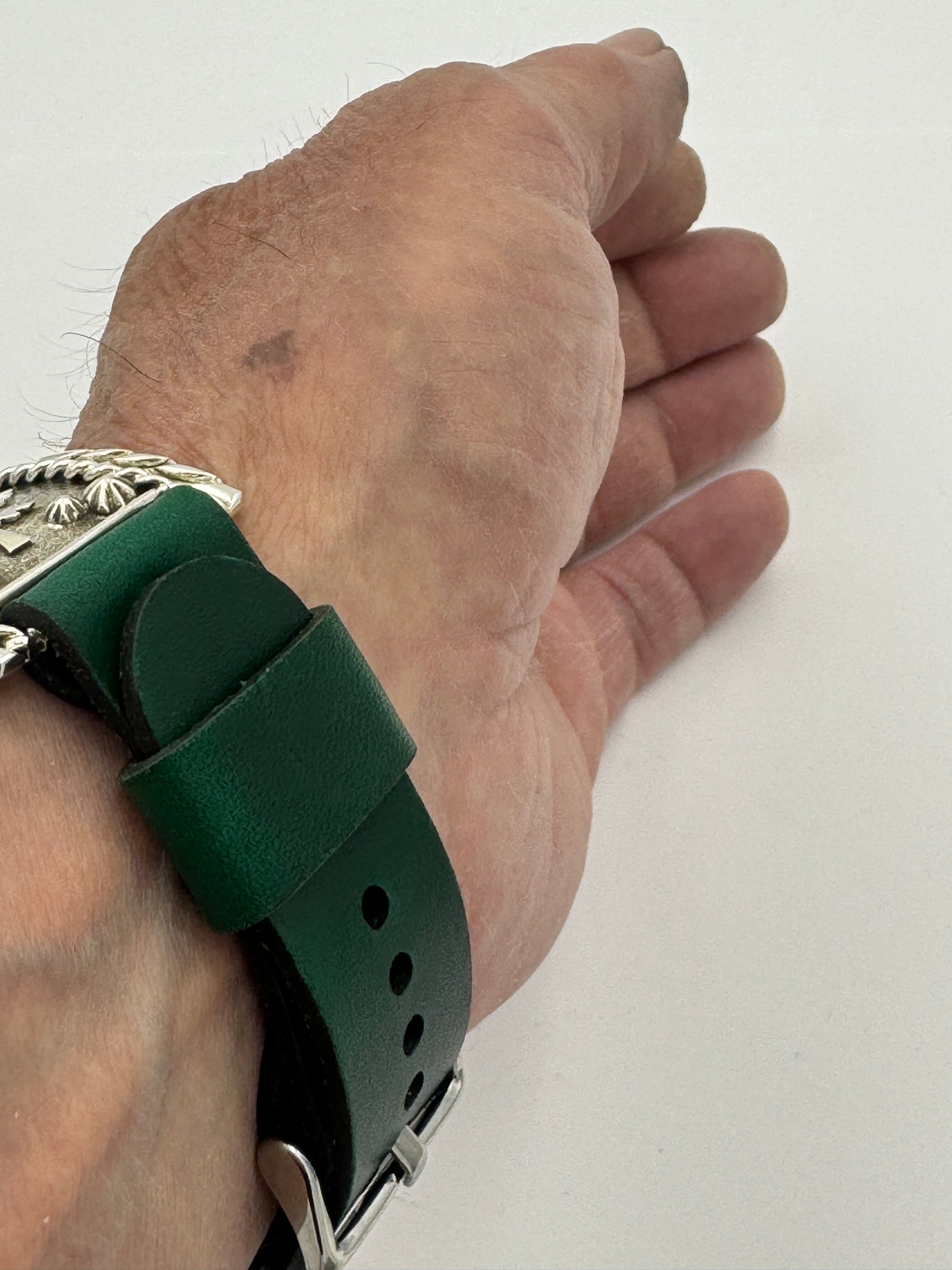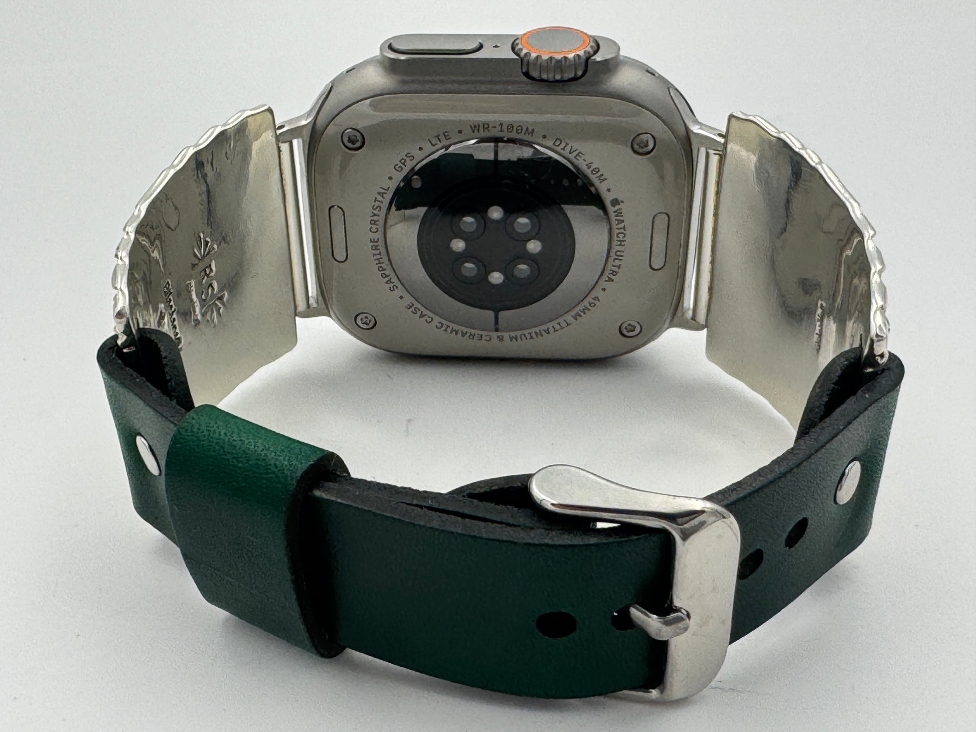 The iBand comes with a choice of our new Laser Cut Riveted bands in a variety of colors. The iBand shown has our ML-5 Universal 20mm Green Leather Buckle Band v5.0 with a wide hand sewn loop attached. This is a wider band from previous versions and is a great piece for a medium to large size wrist. By changing the leather we can make this band fit virtually any wrist nicely. Black, Buckskin and other leather band colors available. Choose your band size at checkout and we will contact you to assure a nice fit. The iBand will seamlessly integrate with the Apple 42mm Series 1 thru Series 10 46mm WATCH. This band will also work nicely with the New Apple Watch 49mm Ultra series I or II.