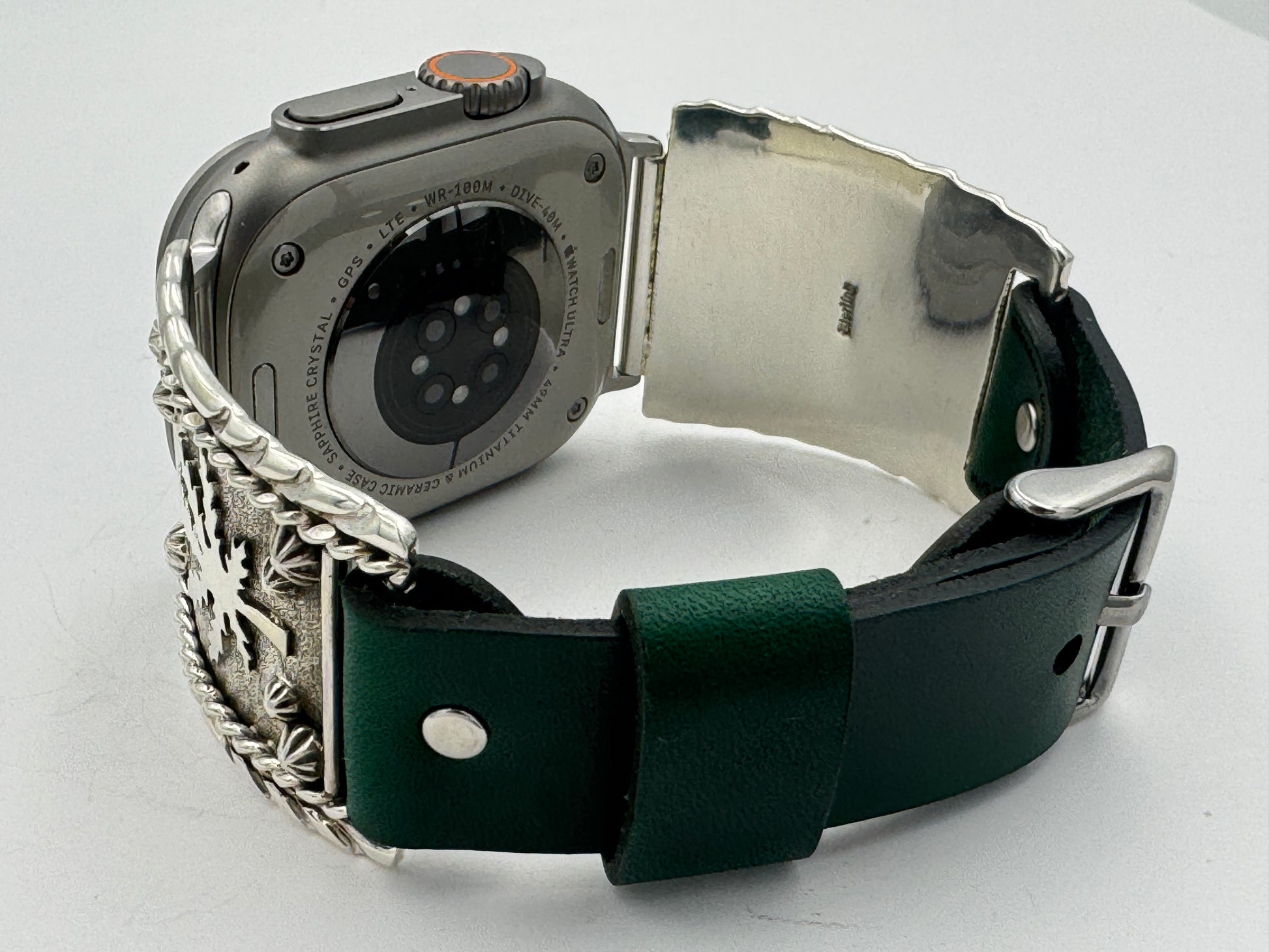 This purchase includes a Handcrafted Native American Sterling Silver Leather iBand for Apple WATCH Series 1 42mm thru Series 10 46mm. This watch band has a wider leather band that was also designed to work with the new Apple Watch 49mm Ultra. The Apple WATCH is not included.