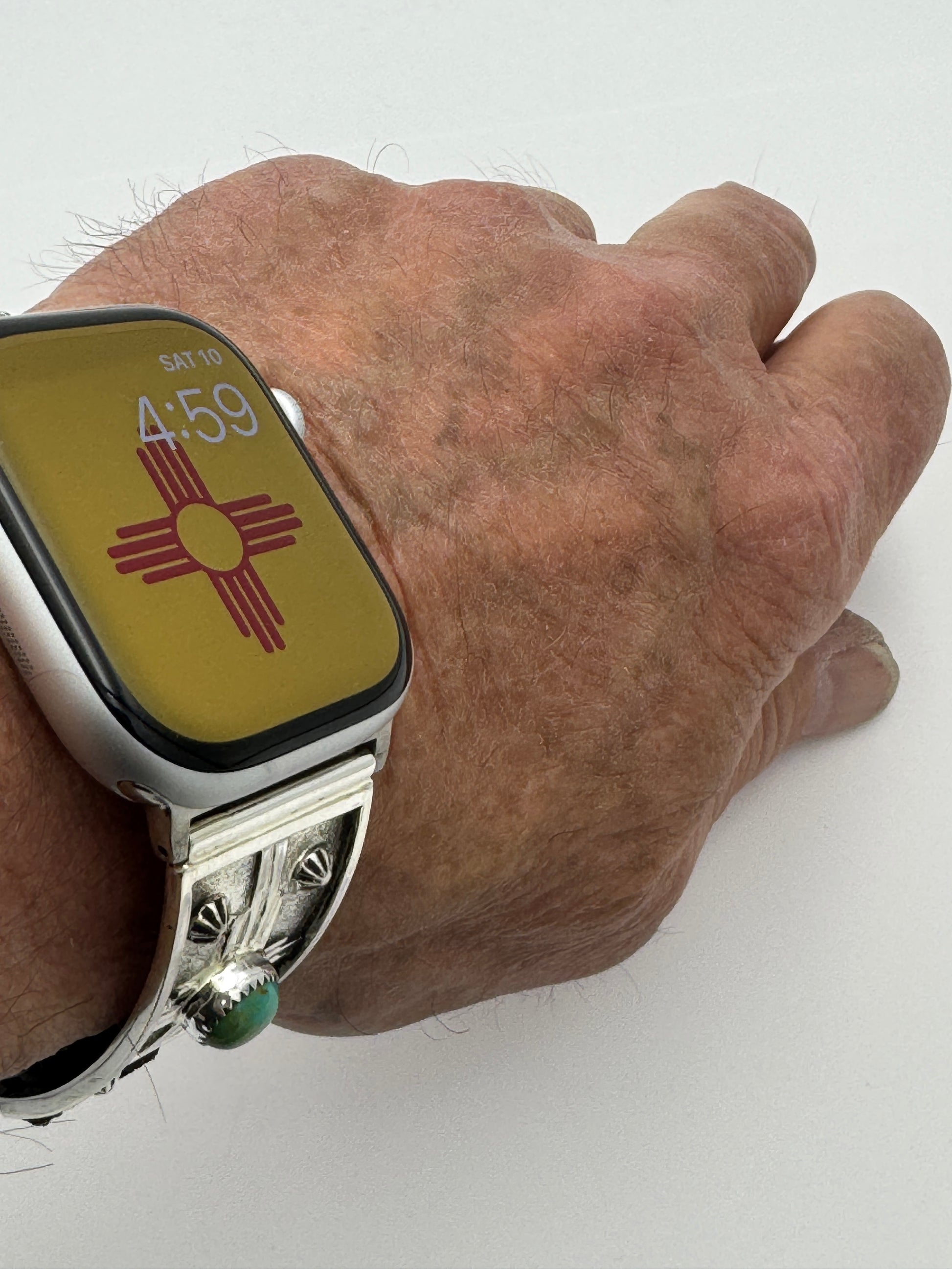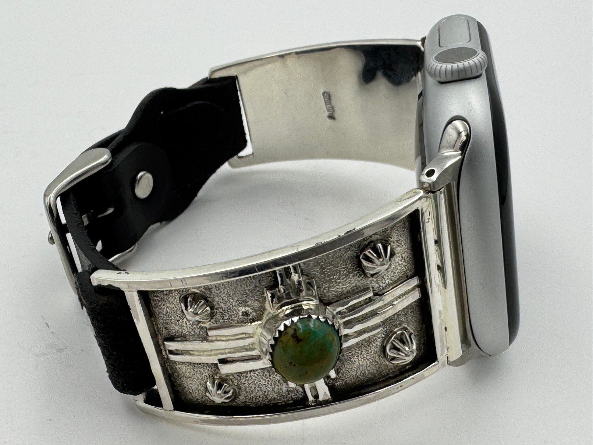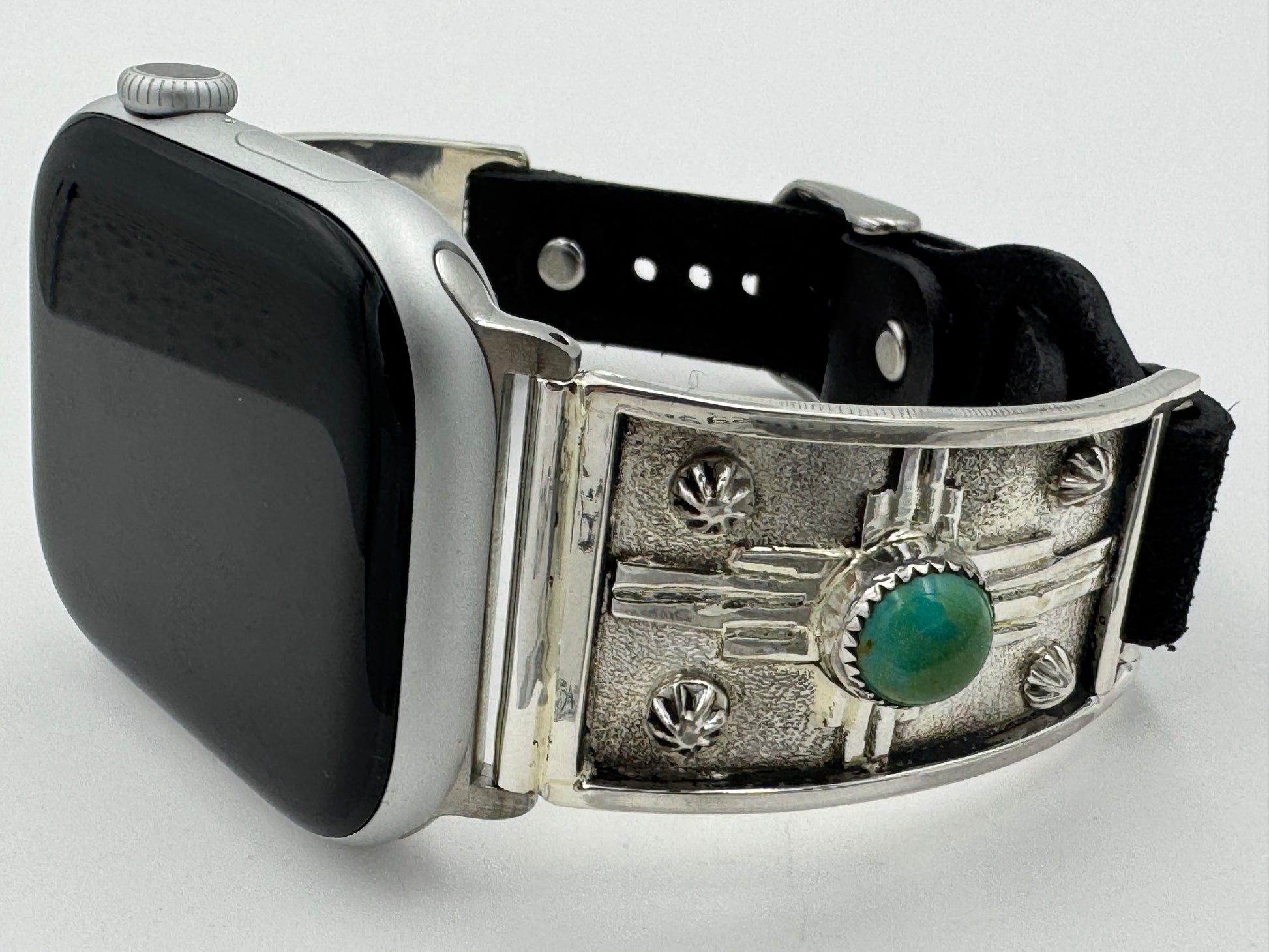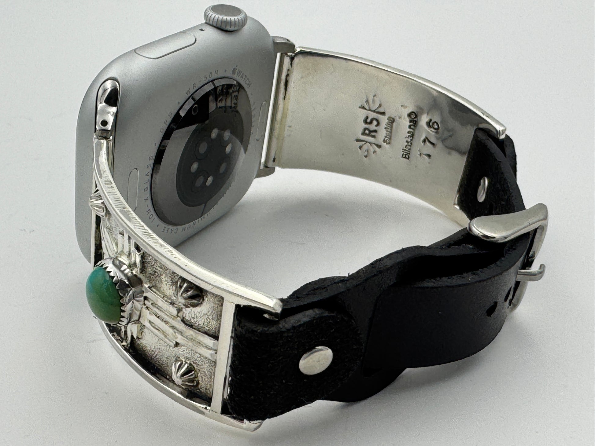 This is Ronnie Spencer's 176th Bilasáana piece offered. The iBand consists of two Sterling Silver Tips with 42/44/45mm WATCH adapters and a Laser Cut Leather Band. The Sterling Silver Tips are Handcrafted by Ronnie Spencer of the Navajo Nation and have a Nex Mexico Zia Design with Turquoise stones on each side. On the inside of one Tip is the official Bilasáana Trademark, the serial number 176, a Sterling mark and Ronnie's *RS* authenticity mark. The other tip has a Sterling mark.