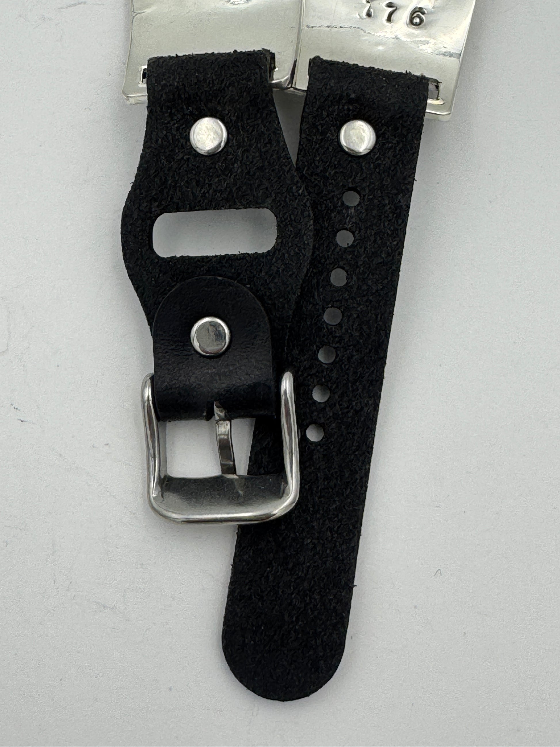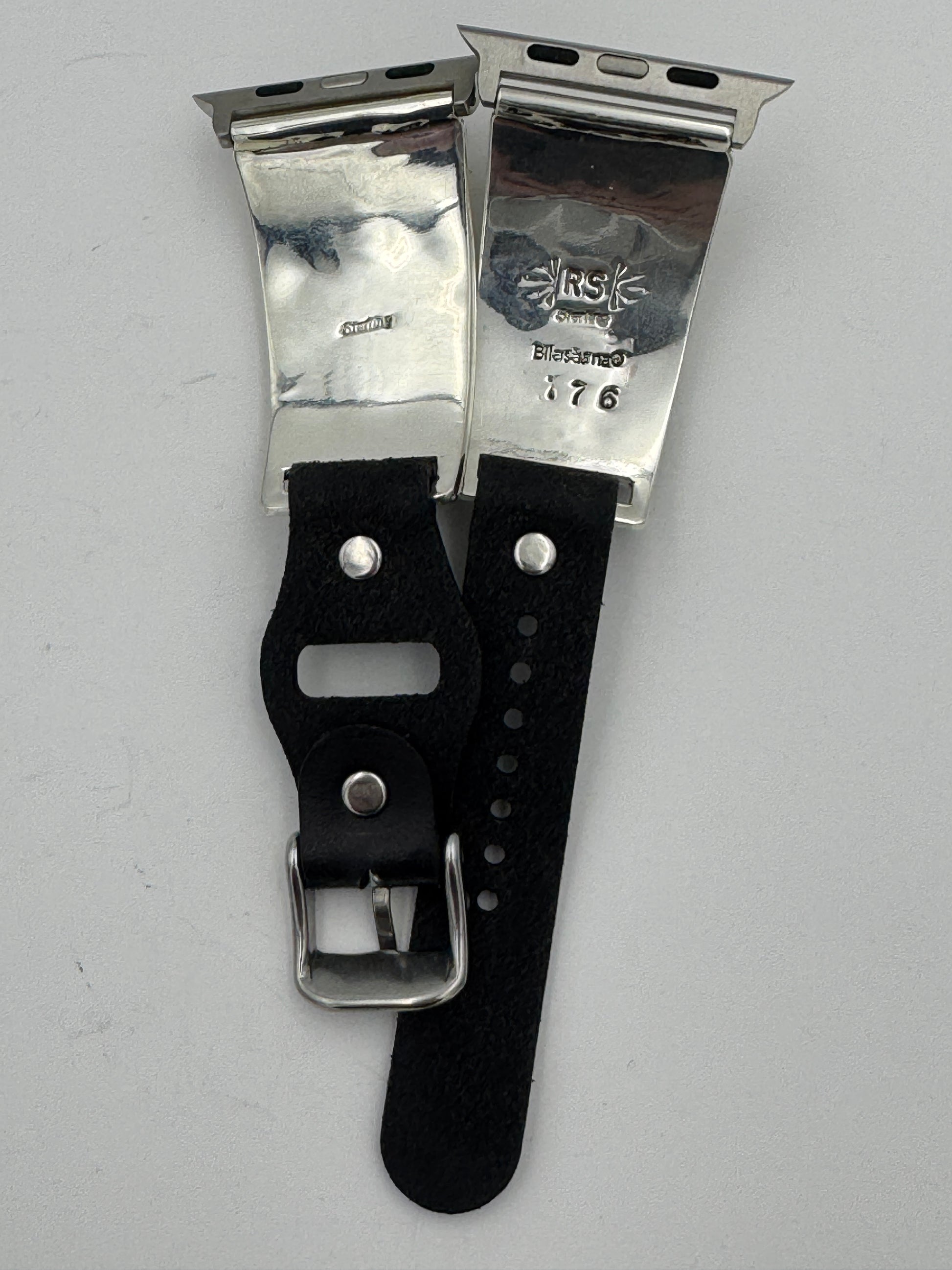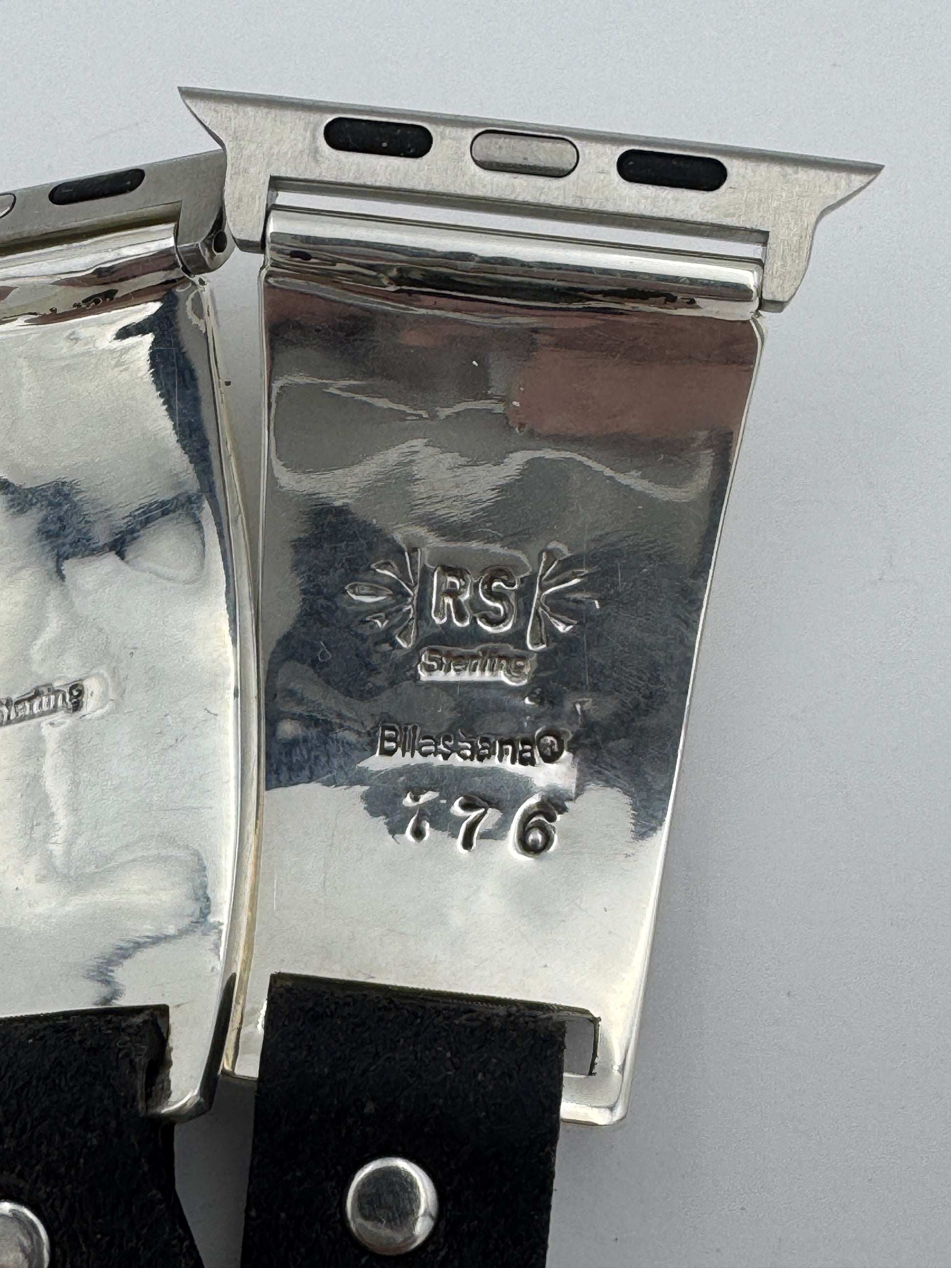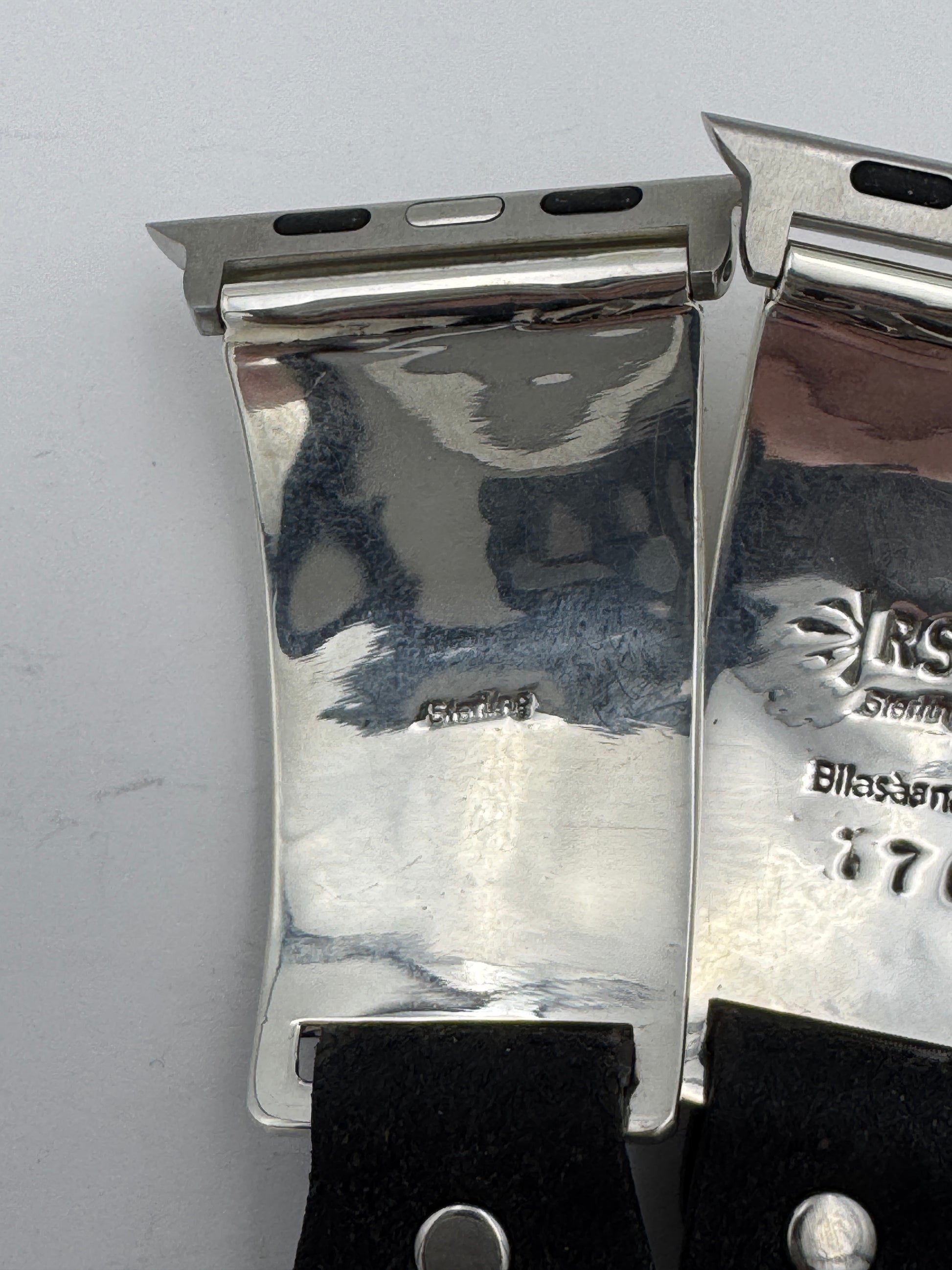 This is Ronnie Spencer's 176th Bilasáana piece offered. The iBand consists of two Sterling Silver Tips with 42/44/45mm WATCH adapters and a Laser Cut Leather Band. The Sterling Silver Tips are Handcrafted by Ronnie Spencer of the Navajo Nation and have a Nex Mexico Zia Design with Turquoise stones on each side. On the inside of one Tip is the official Bilasáana Trademark, the serial number 176, a Sterling mark and Ronnie's *RS* authenticity mark. The other tip has a Sterling mark.