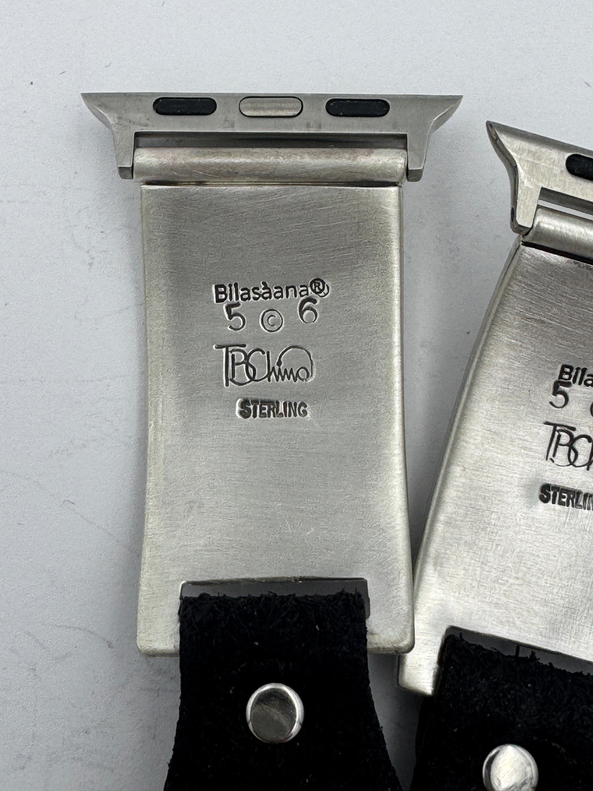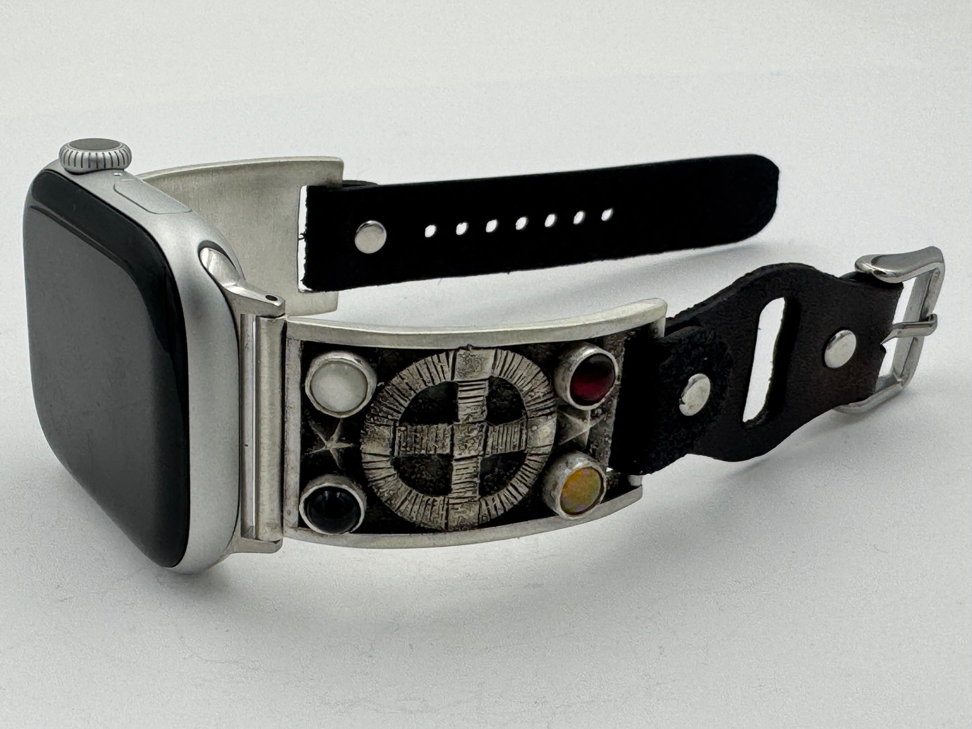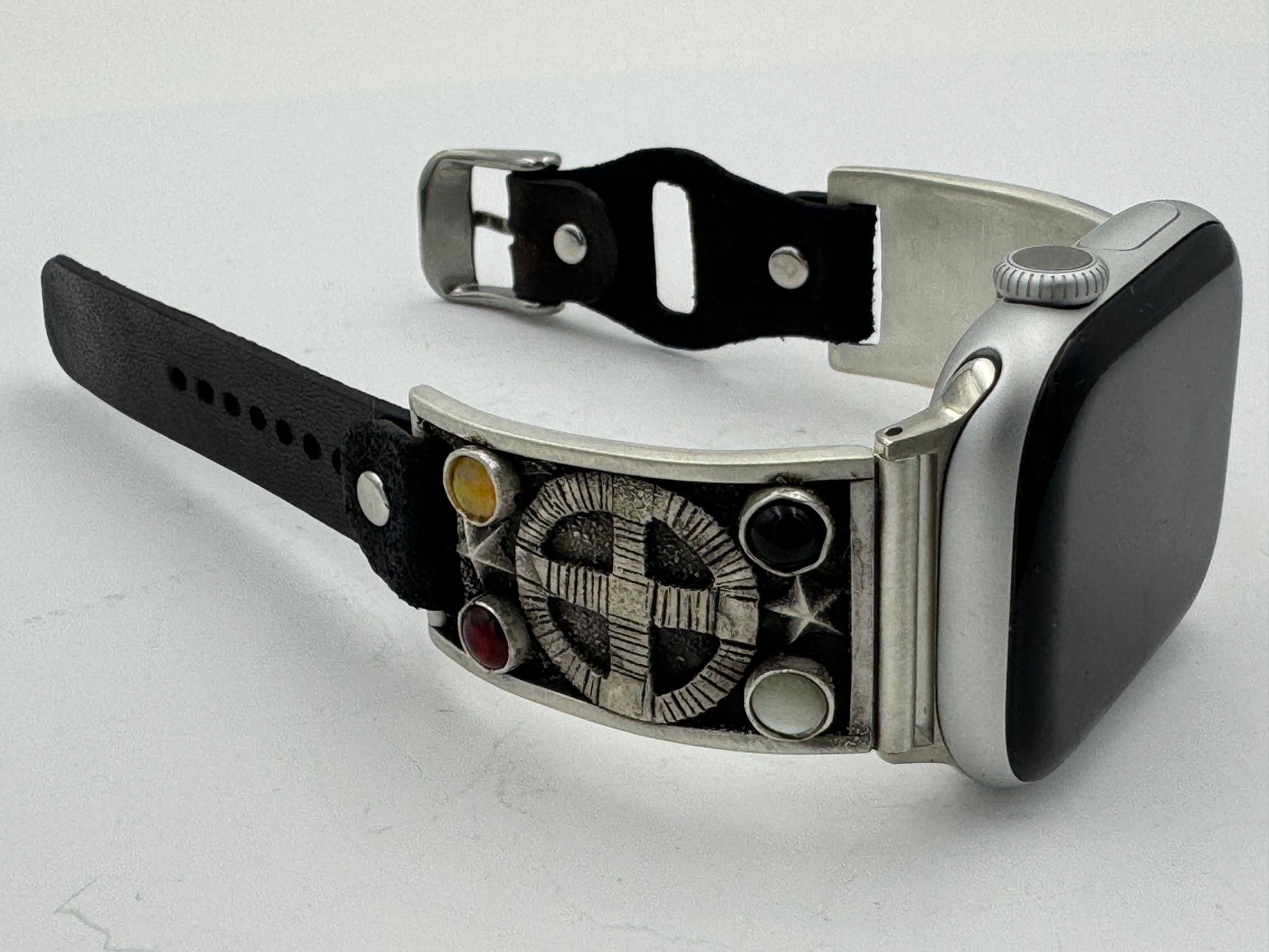 This is Tony Chino's 56th Bilasaana piece offered. The iBand consists of two Sterling Silver Tips with 38/40/41/42mm Apple Watch adapters and a leather expansion band. The Sterling Silver Tips are Handcrafted by Tony Chino of Acoma Pueblo heritage and have a unique Sterling Silver design. Every one of Tony's bands is unique. The base design has Medicine wheel cutouts with two stars and four multicolored stones. On the inside of each Tip is the official Bilasáana Trademark, a Sterling stamp, the serial number 56 and Tony's official hallmark.