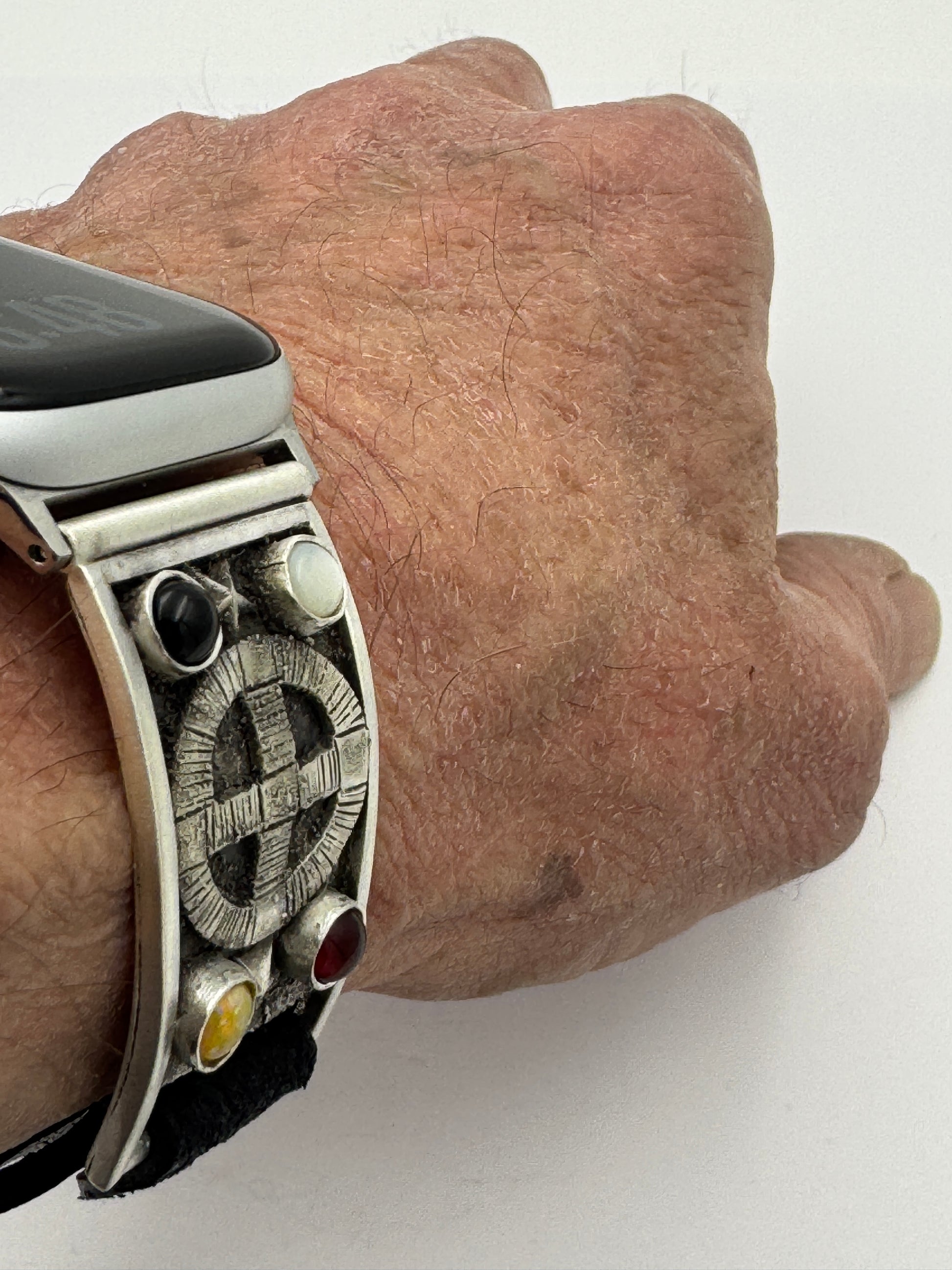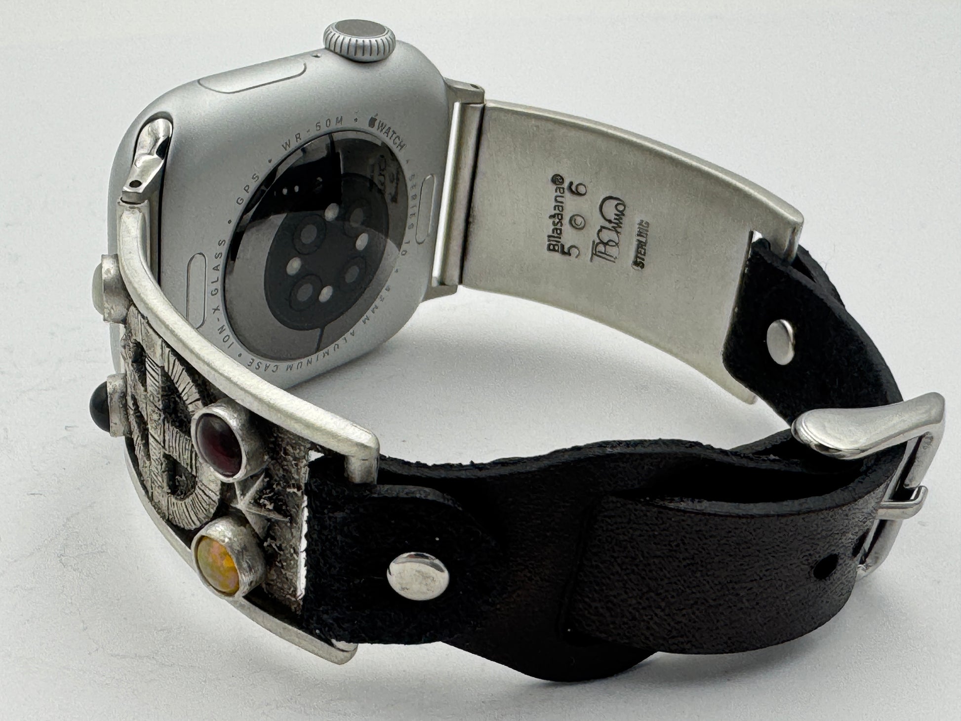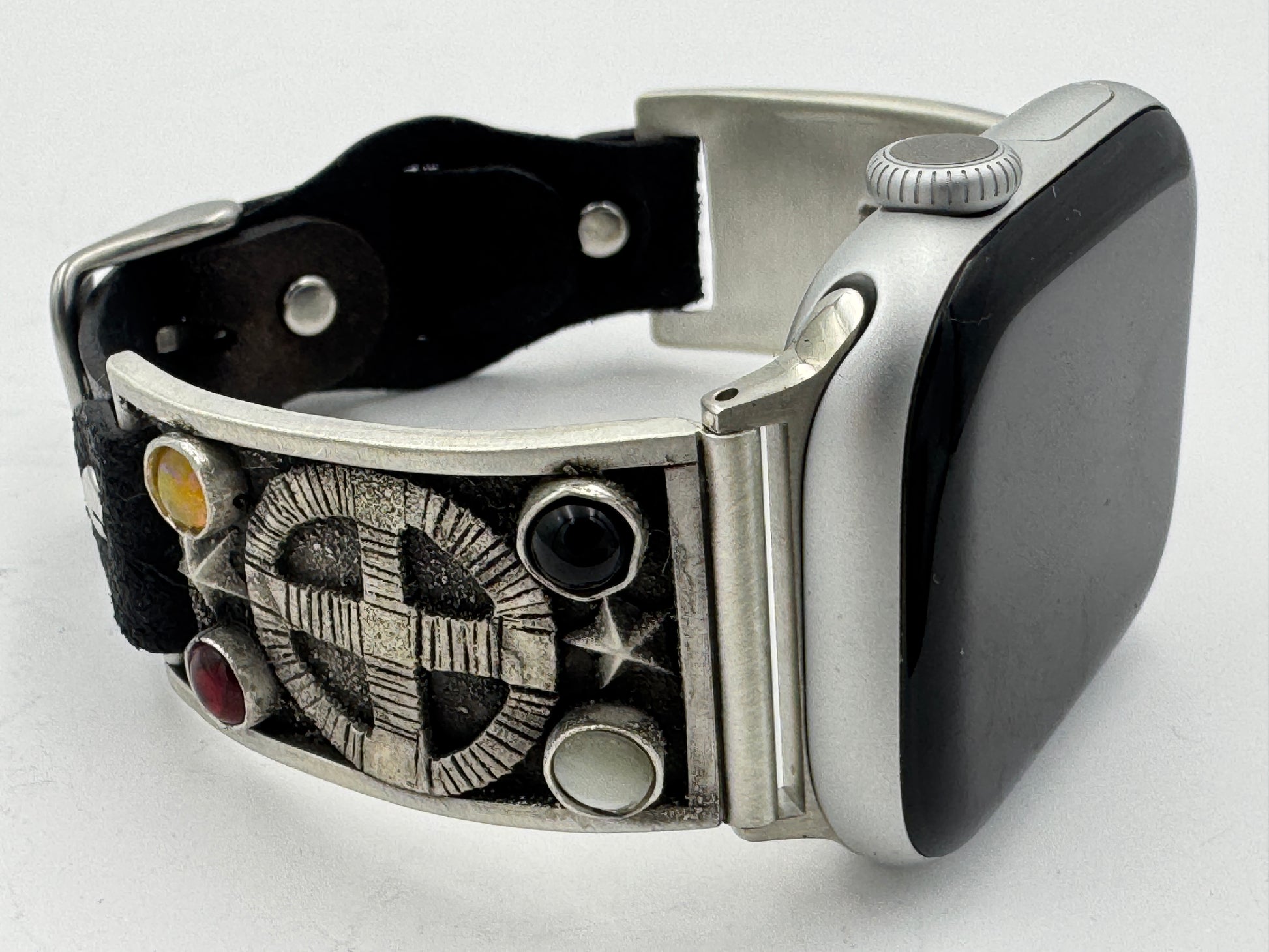 This is Tony Chino's 56th Bilasaana piece offered. The iBand consists of two Sterling Silver Tips with 38/40/41/42mm Apple Watch adapters and a leather expansion band. The Sterling Silver Tips are Handcrafted by Tony Chino of Acoma Pueblo heritage and have a unique Sterling Silver design. Every one of Tony's bands is unique. The base design has Medicine wheel cutouts with two stars and four multicolored stones. On the inside of each Tip is the official Bilasáana Trademark, a Sterling stamp, the serial number 56 and Tony's official hallmark.