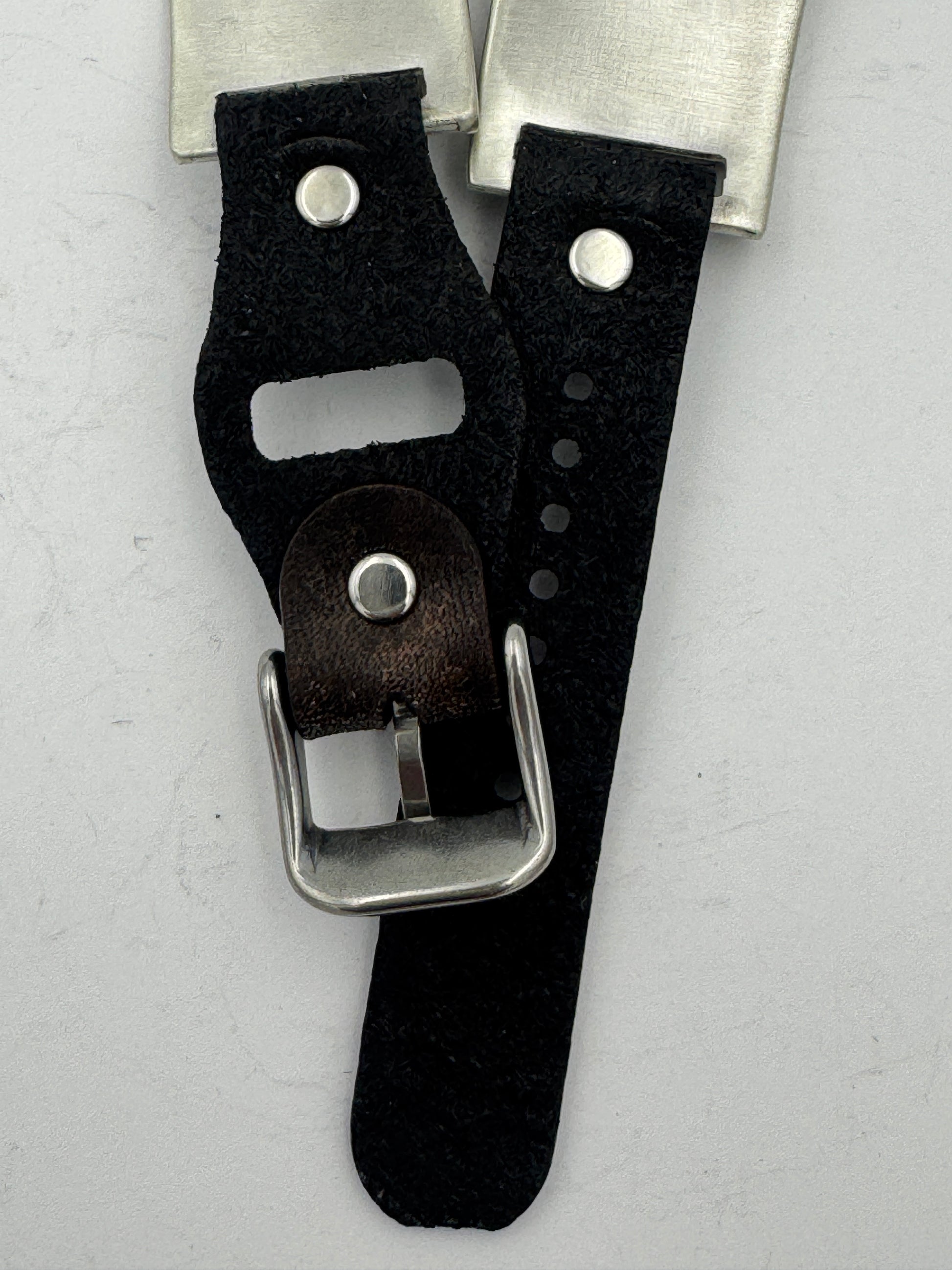 The iBand comes with our Laser Cut Riveted Universal buckle Leather Band v6.0 with no loop as shown. The leather band comes in two sizes S/M and M/L. The iBand shown has a Brownish Black colored S/M band attached. This is a great piece for a small to a medium size wrist. We can size this band to fit virtually any wrist. Buckskin, Dark brown, other colors and a buckle with loop style leather band also available. Choose your band size at checkout and we will contact you to assure a nice fit. Be sure and leave us valid contact information. The iBand will seamlessly integrate with the Apple 38mm Series 1 thru Series 9 41mm Watch. This band also works with the new Series 10 42mm which is the latest smaller Apple Watch. We can also make this band fit the bigger Watches which works nicely for small wrists with the Bigger 42/44/45/46 and Ultra and Ultra 2 Watches.