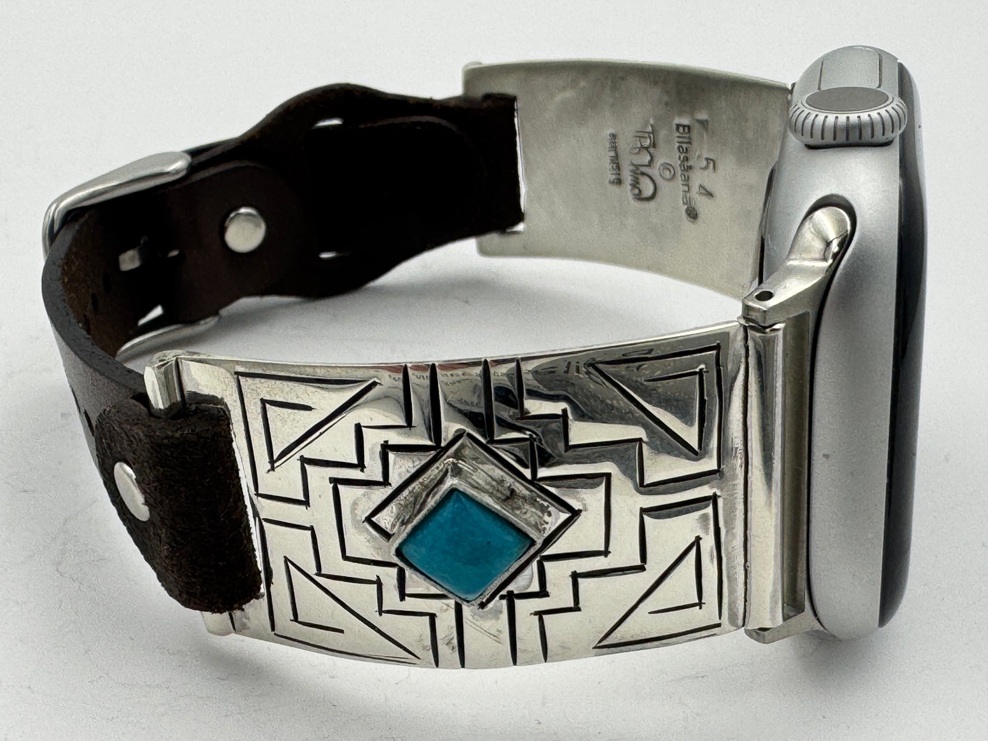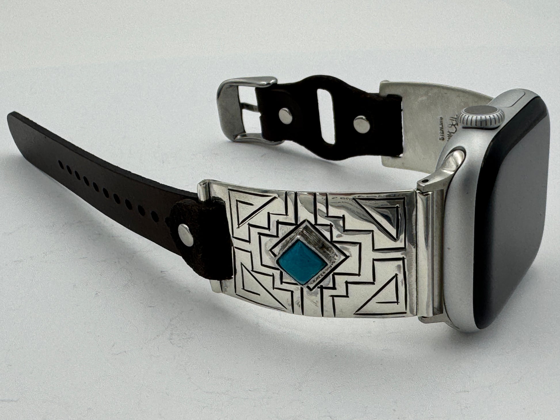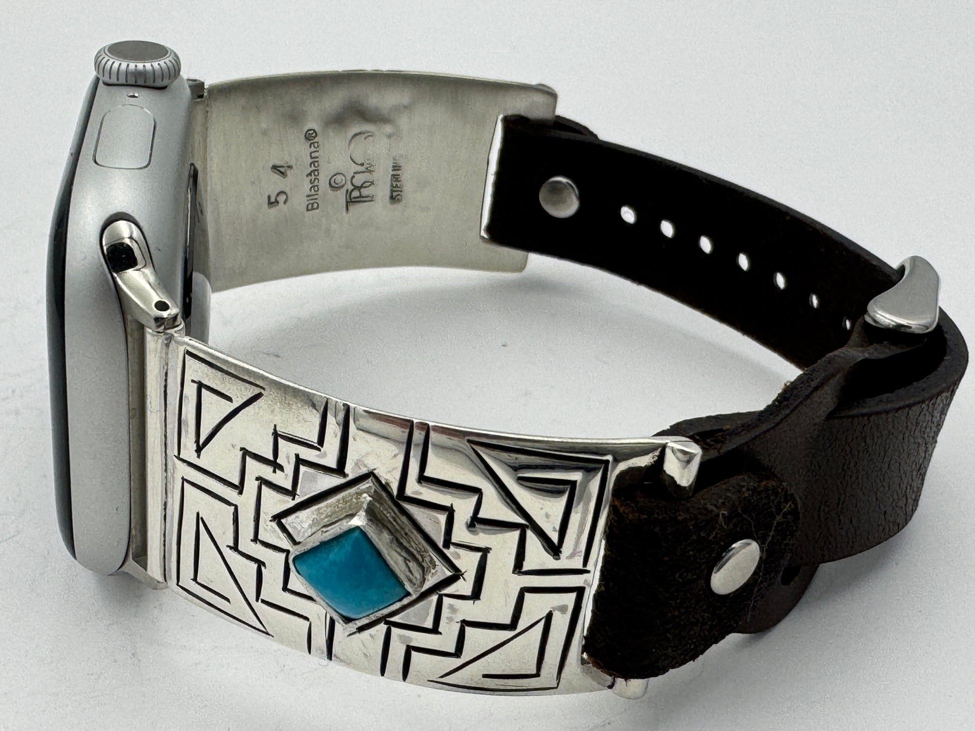 This is Tony Chino's 54th Bilasaana piece offered. The iBand consists of two Sterling Silver Tips with 38/40/41/42mm Apple WATCH adapters and a leather expansion band. The Sterling Silver Tips are Handcrafted by Tony Chino of Acoma Pueblo heritage and have a unique Sterling Silver design. Each tip has silver stamped in the shape of a Zia with square diamond turquoise stones in the center. On the inside of each Tip is the official Bilasáana® Trademark, a Sterling stamp, the serial number 54 and Tony's official hallmark stamp.