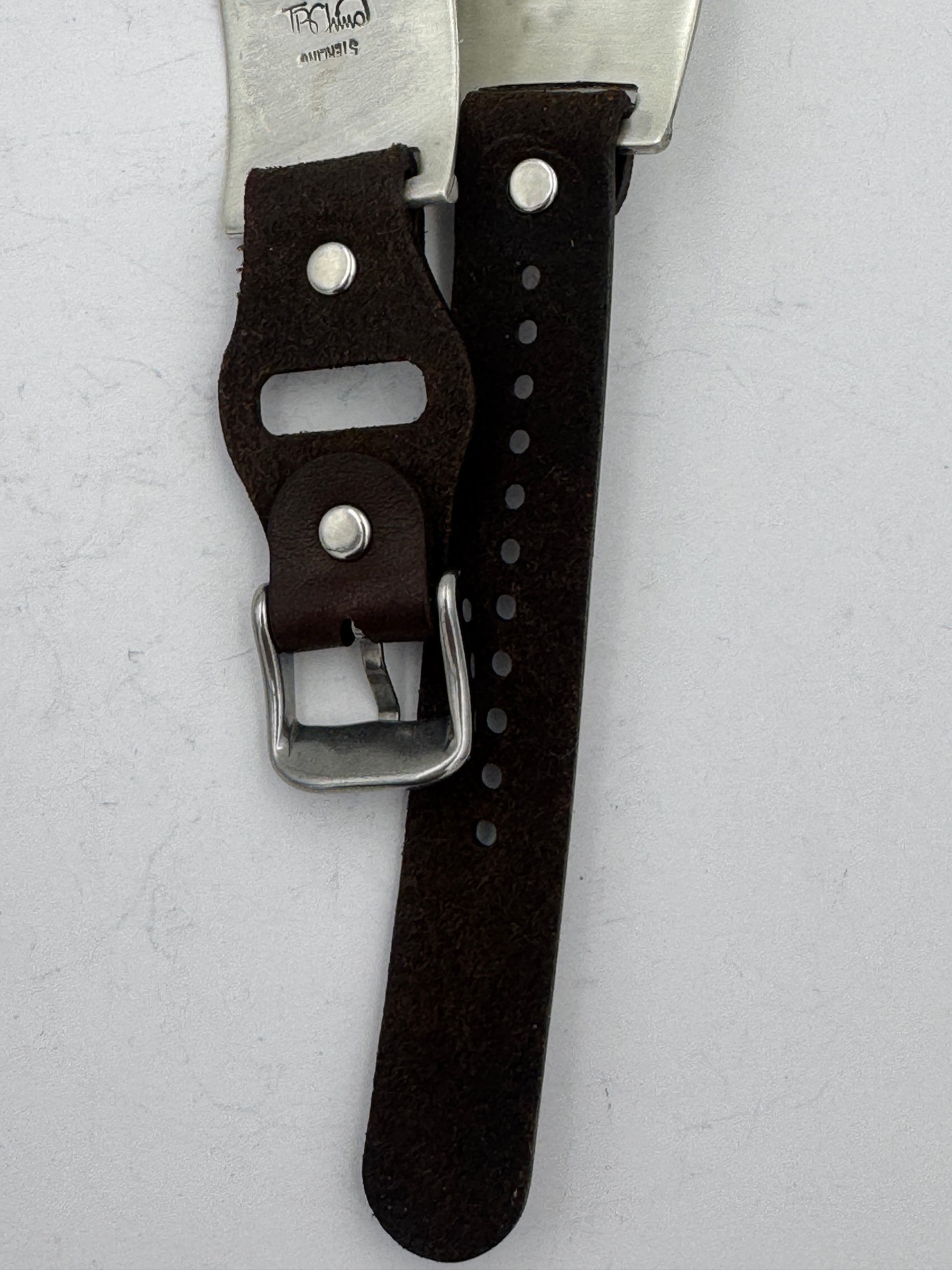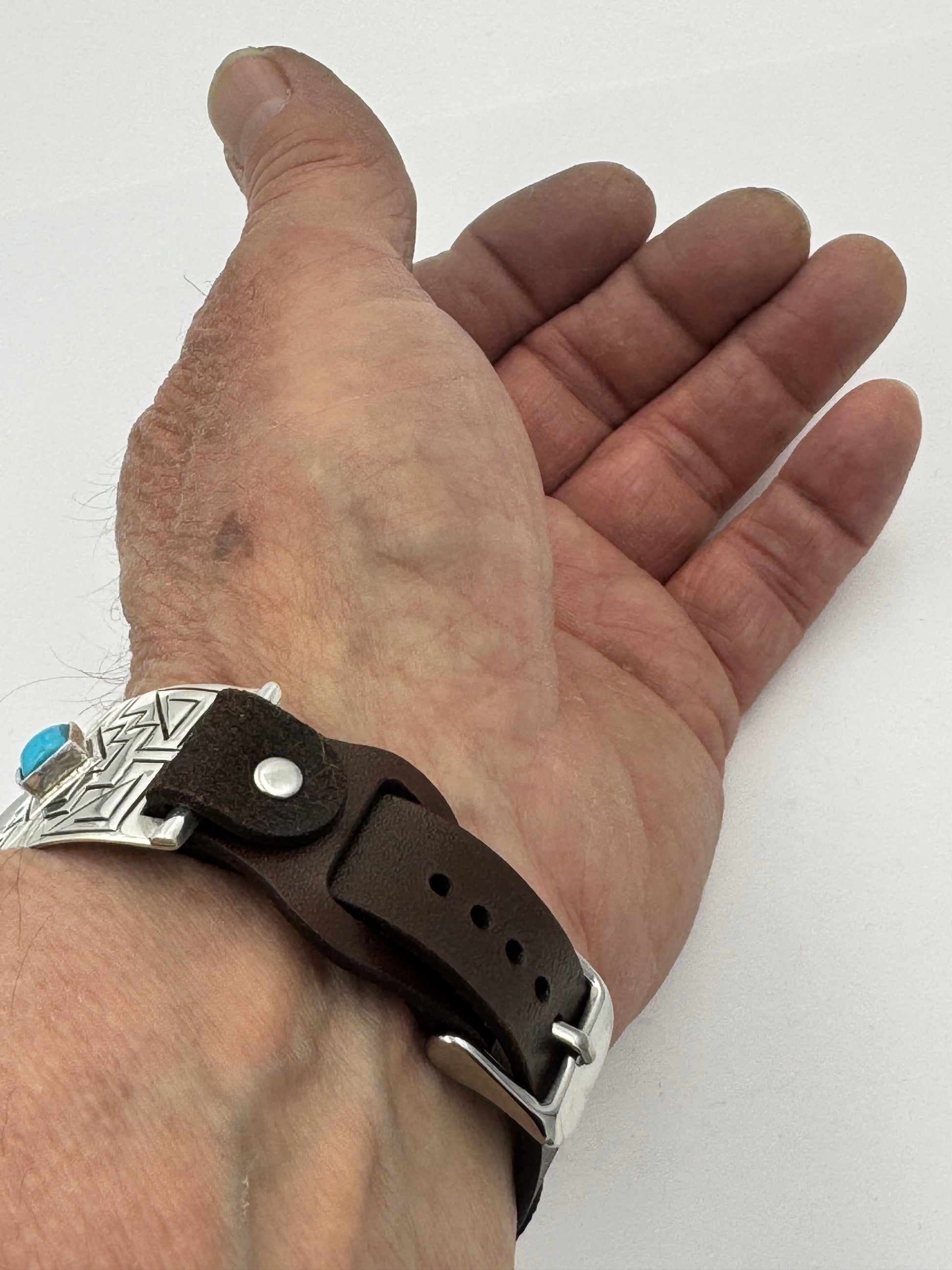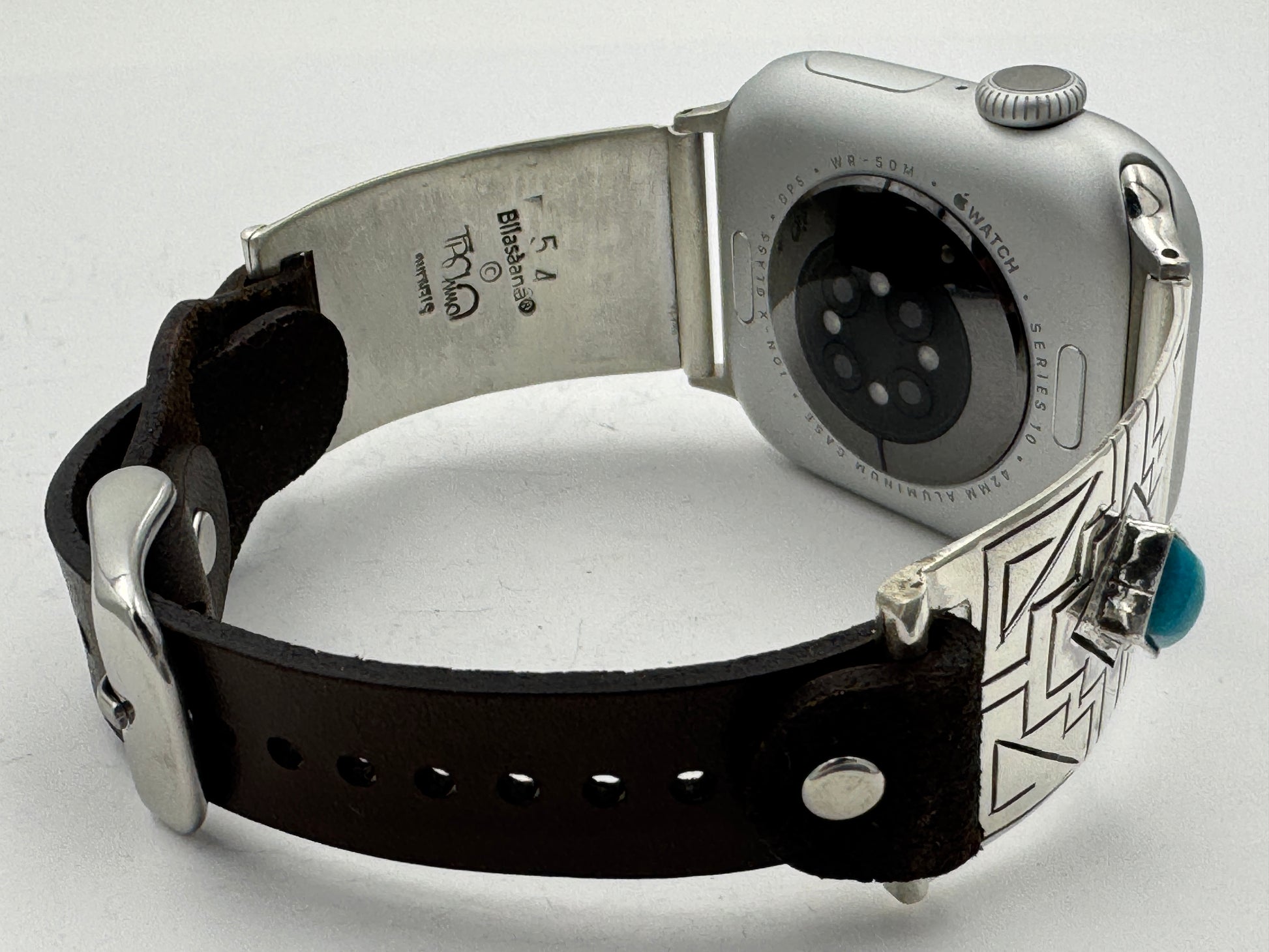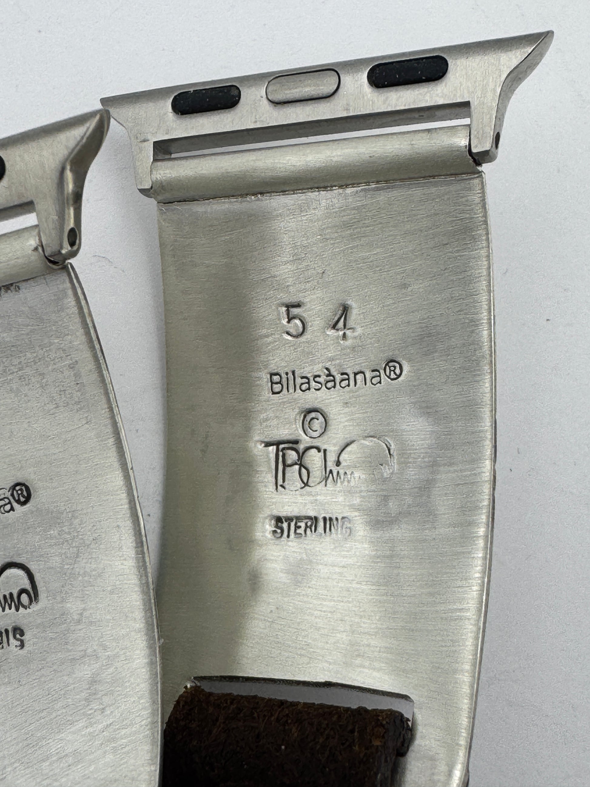 This is Tony Chino's 54th Bilasaana piece offered. The iBand consists of two Sterling Silver Tips with 38/40/41/42mm Apple WATCH adapters and a leather expansion band. The Sterling Silver Tips are Handcrafted by Tony Chino of Acoma Pueblo heritage and have a unique Sterling Silver design. Each tip has silver stamped in the shape of a Zia with square diamond turquoise stones in the center. On the inside of each Tip is the official Bilasáana® Trademark, a Sterling stamp, the serial number 54 and Tony's official hallmark stamp.