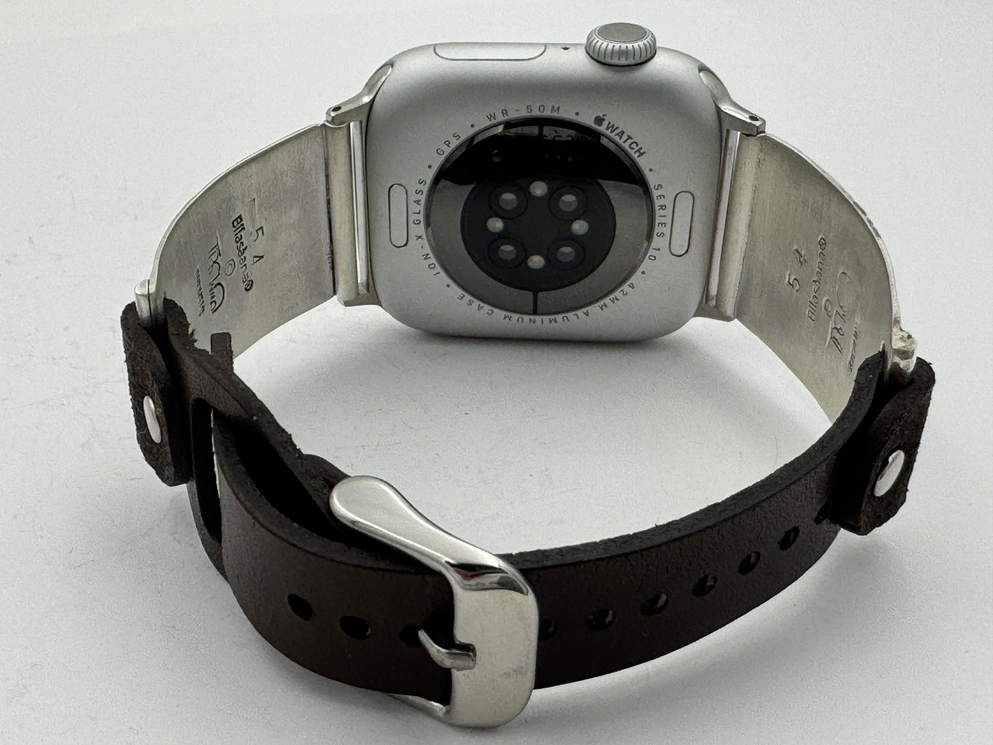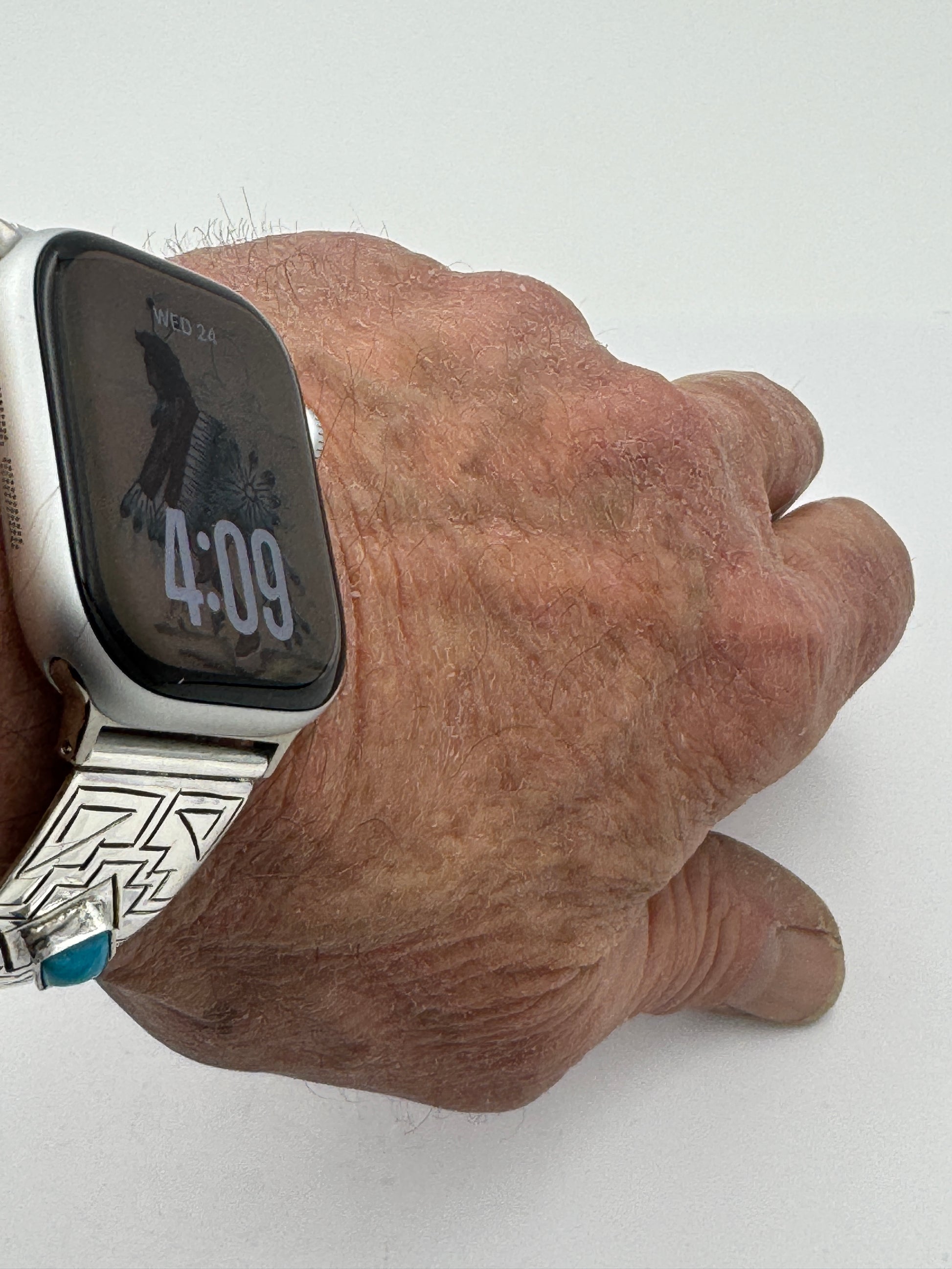 This purchase includes Handcrafted Native American Sterling Silver watch tips with a Riveted Leather band for Apple Watch Series 1 38mm thru Series 9 41mm and Series 10 42mm. The Apple Watch 38/40/41/42mm is not included.