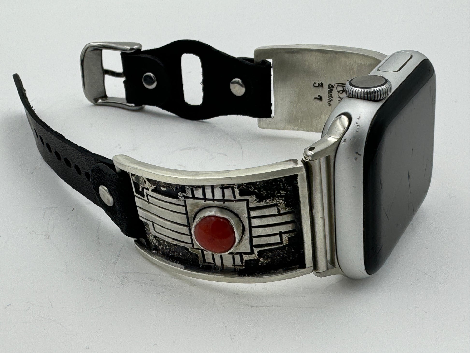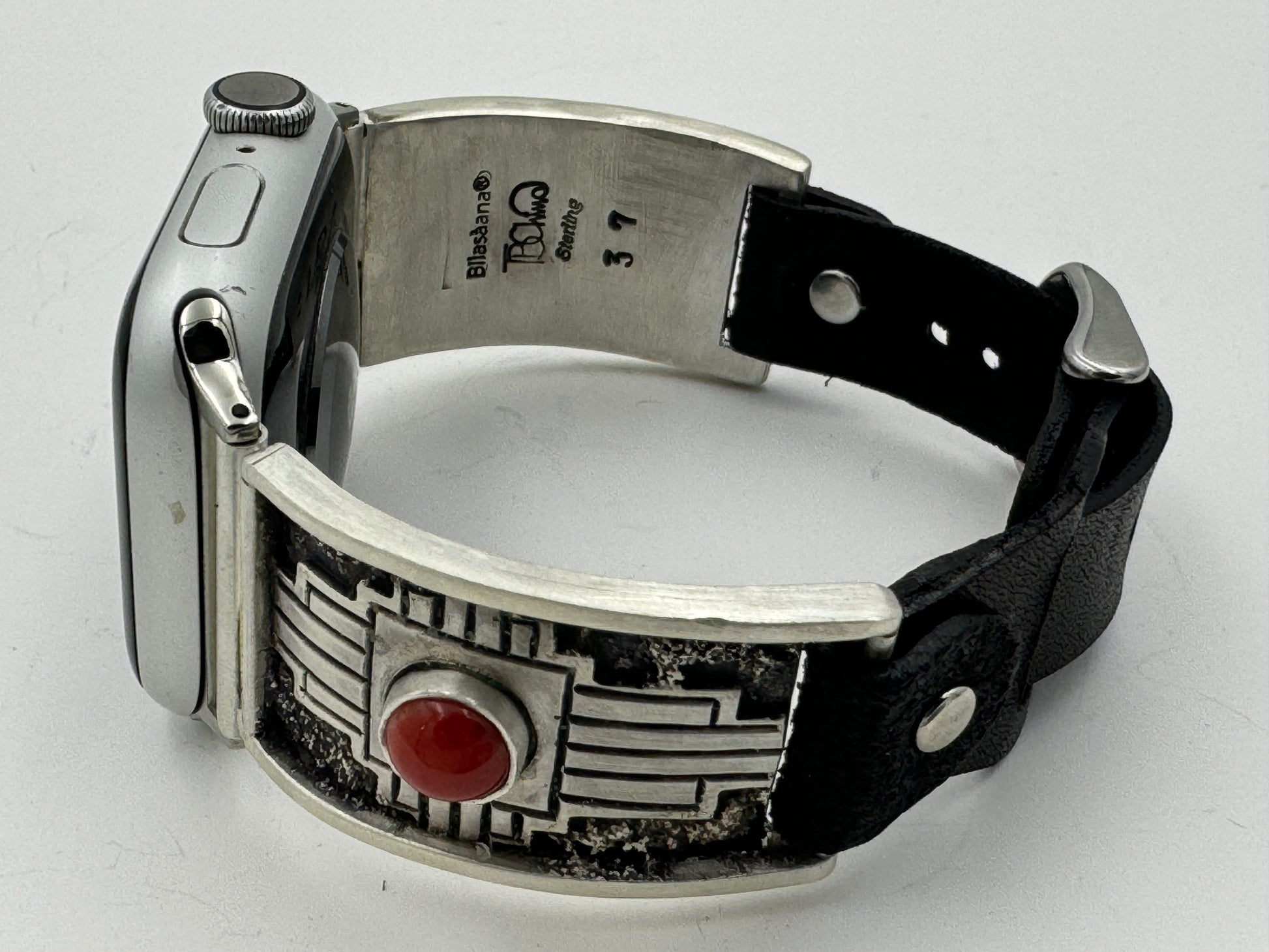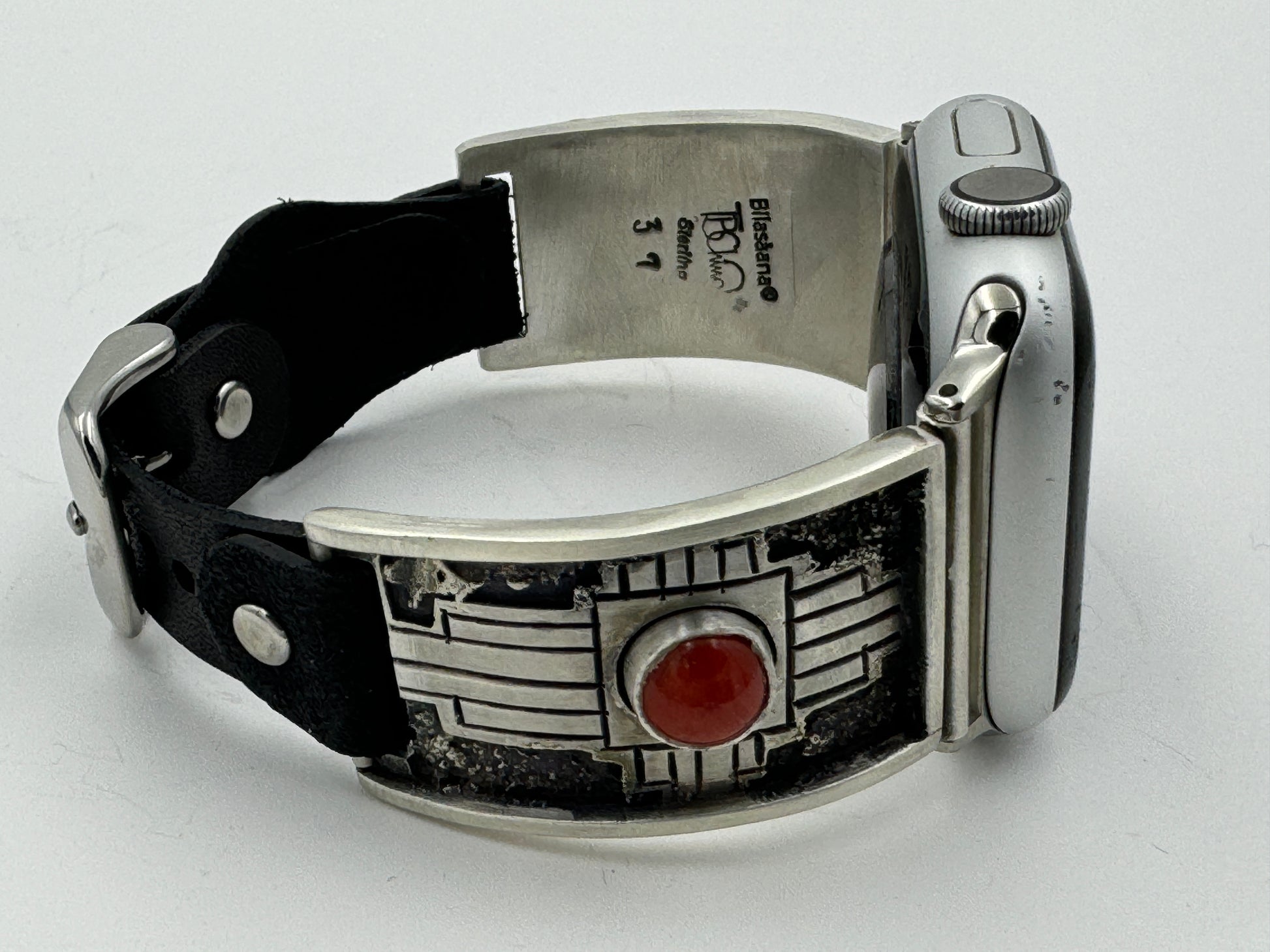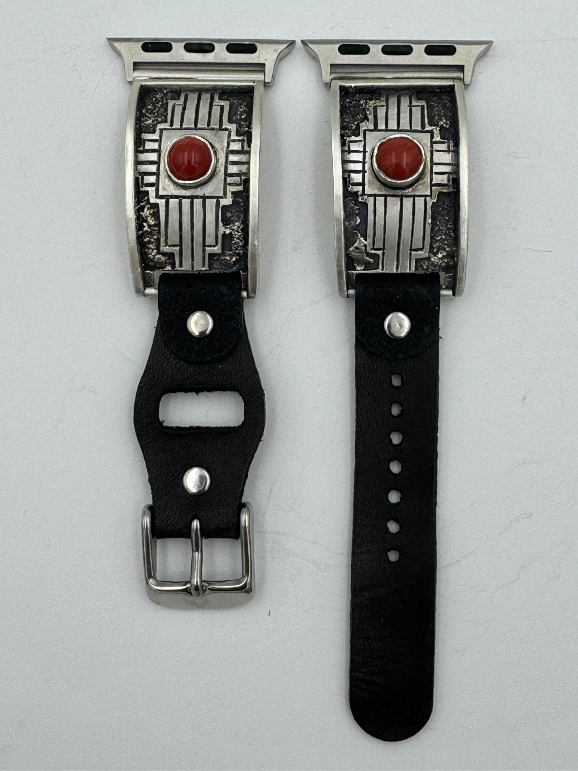 This is Tony Chino's 37th Bilasaana piece offered. The iBand consists of two Sterling Silver Tips with 38/40/41mm Apple WATCH adapters and a leather expansion band. The Sterling Silver Tips are Handcrafted by Tony Chino of Acoma Pueblo heritage and have a unique Sterling Silver design. Each tip has silver in the shape of a Zia with round coral stones in the center. On the inside of each Tip is the official Bilasáana® Trademark, a Sterling stamp, the serial number 37 and Tony's official hallmark stamp.