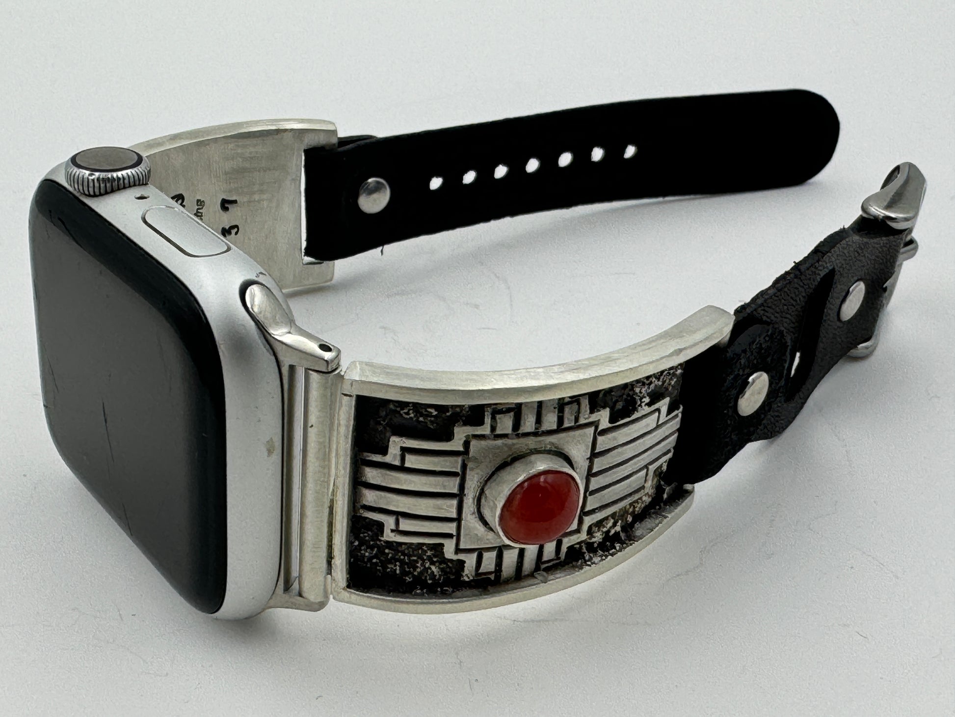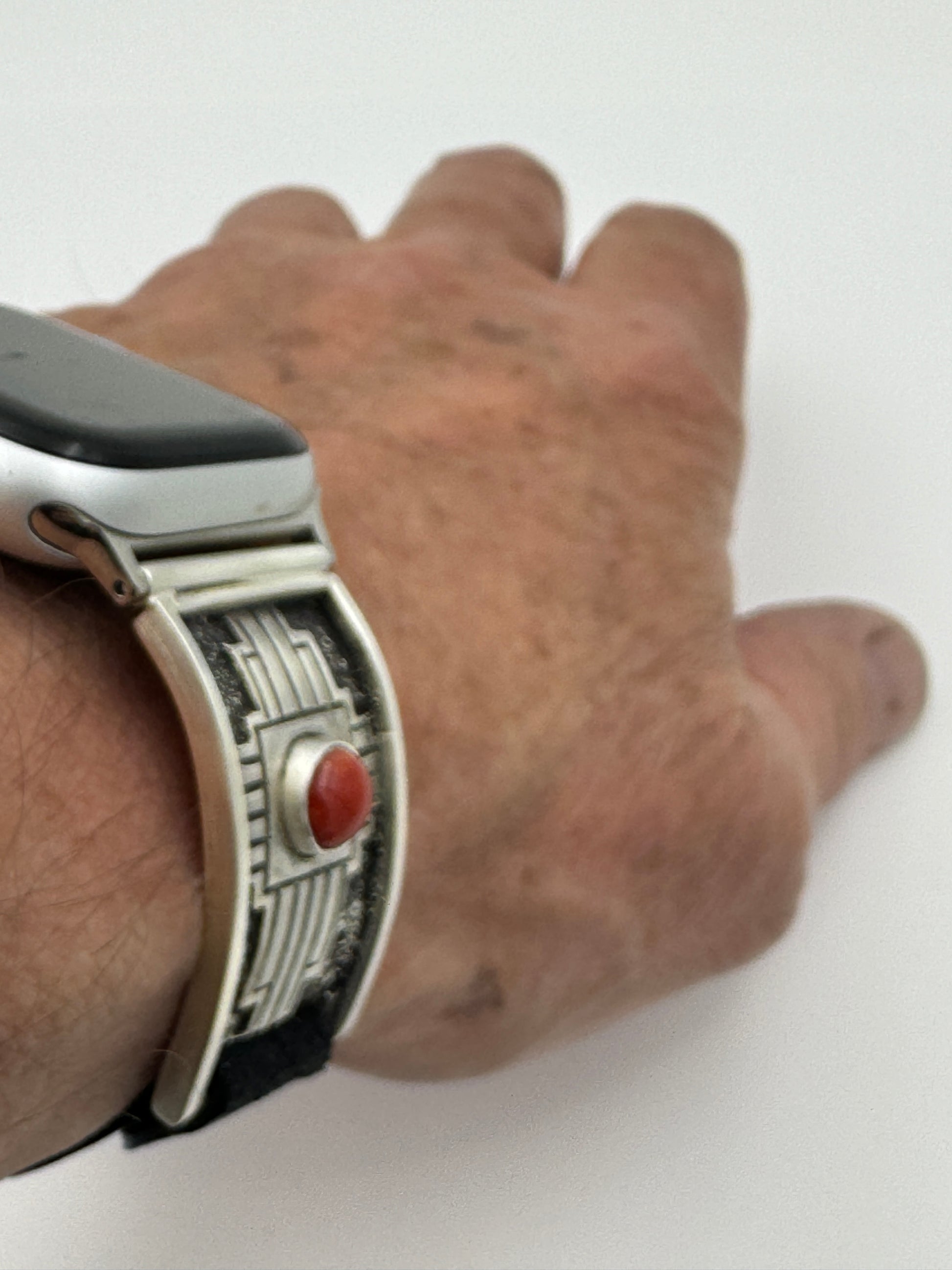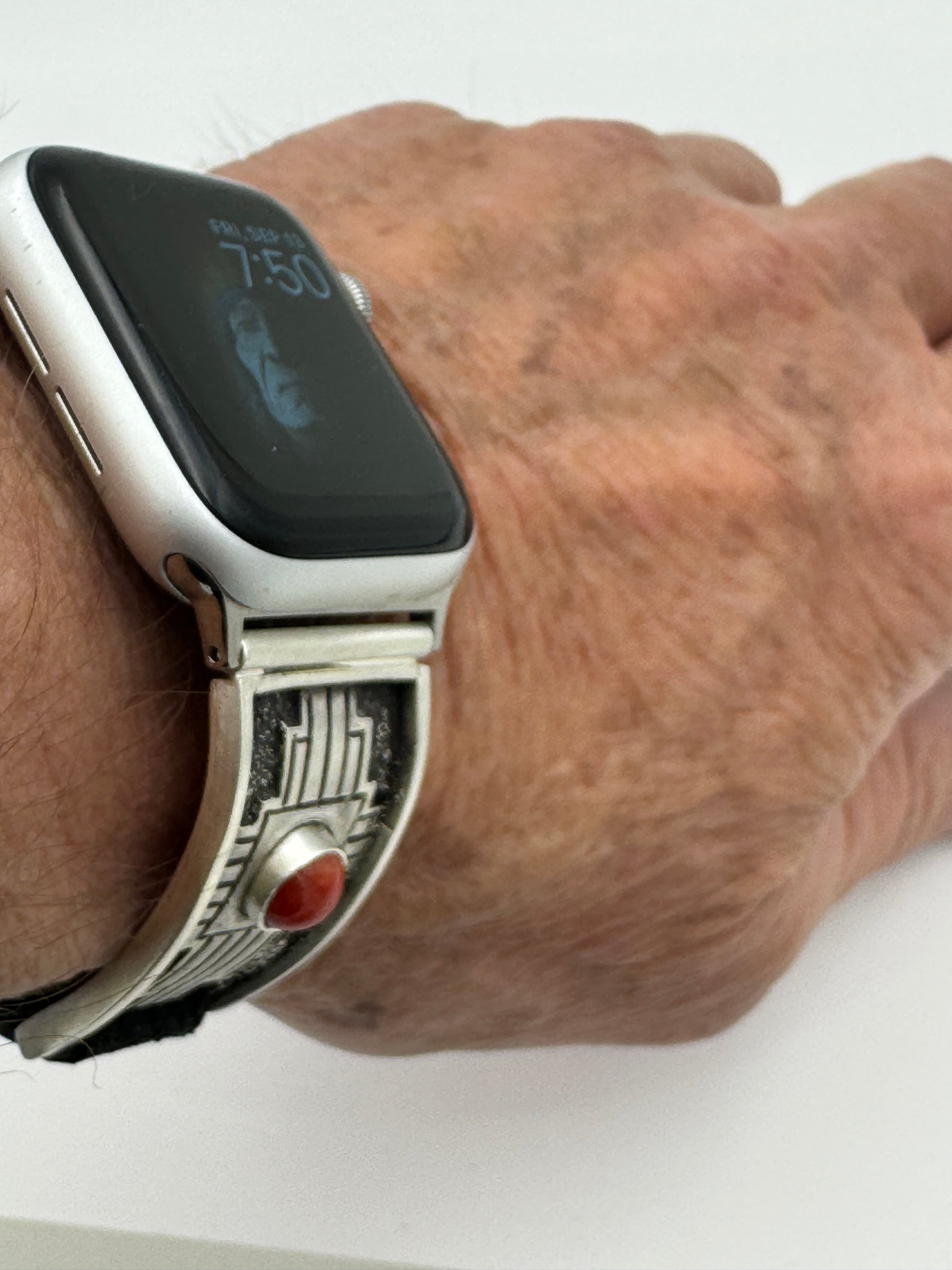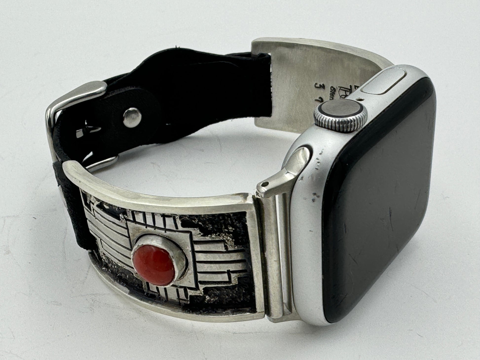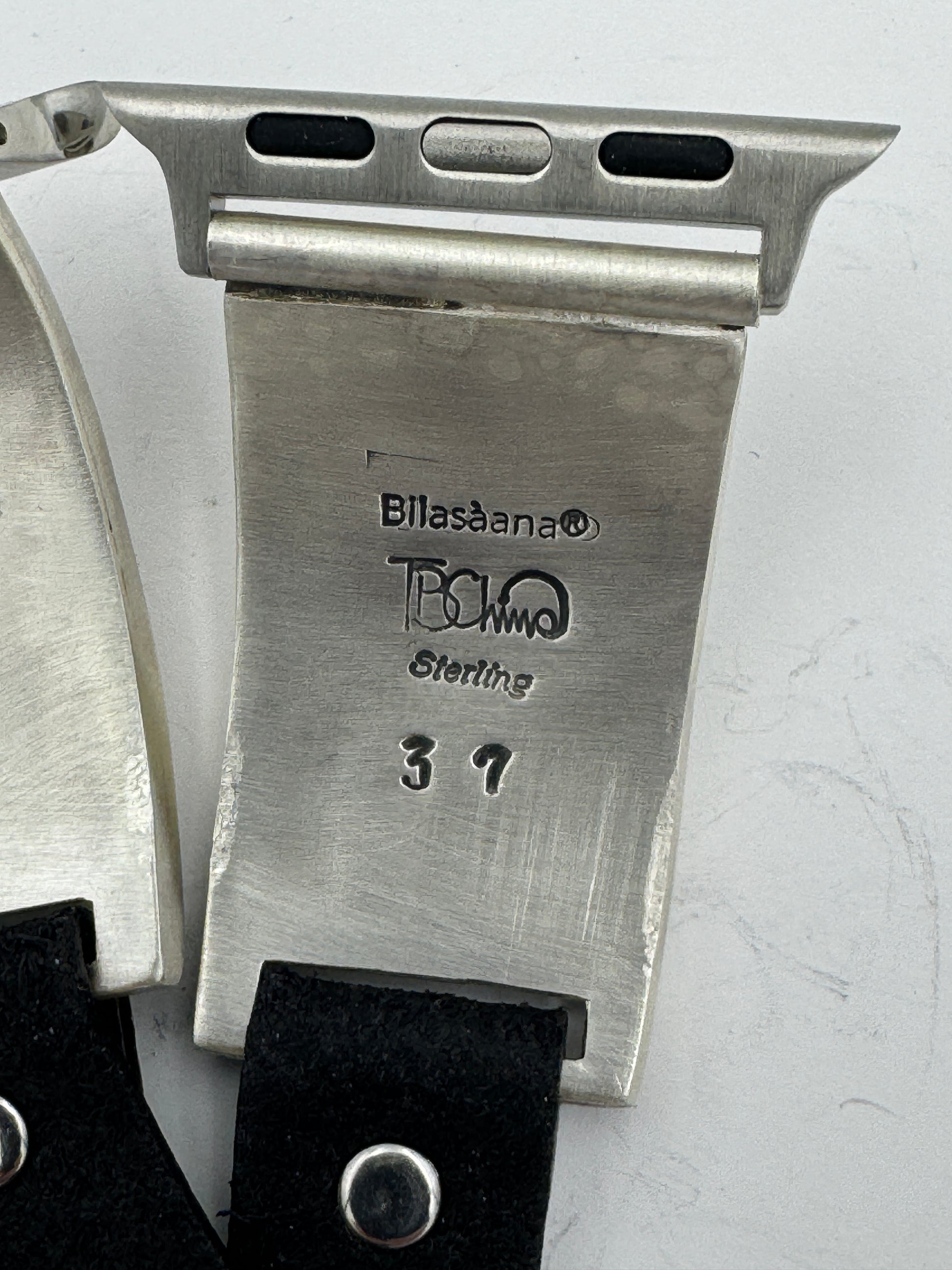 This is Tony Chino's 37th Bilasaana piece offered. The iBand consists of two Sterling Silver Tips with 38/40/41mm Apple WATCH adapters and a leather expansion band. The Sterling Silver Tips are Handcrafted by Tony Chino of Acoma Pueblo heritage and have a unique Sterling Silver design. Each tip has silver in the shape of a Zia with round coral stones in the center. On the inside of each Tip is the official Bilasáana® Trademark, a Sterling stamp, the serial number 37 and Tony's official hallmark stamp.