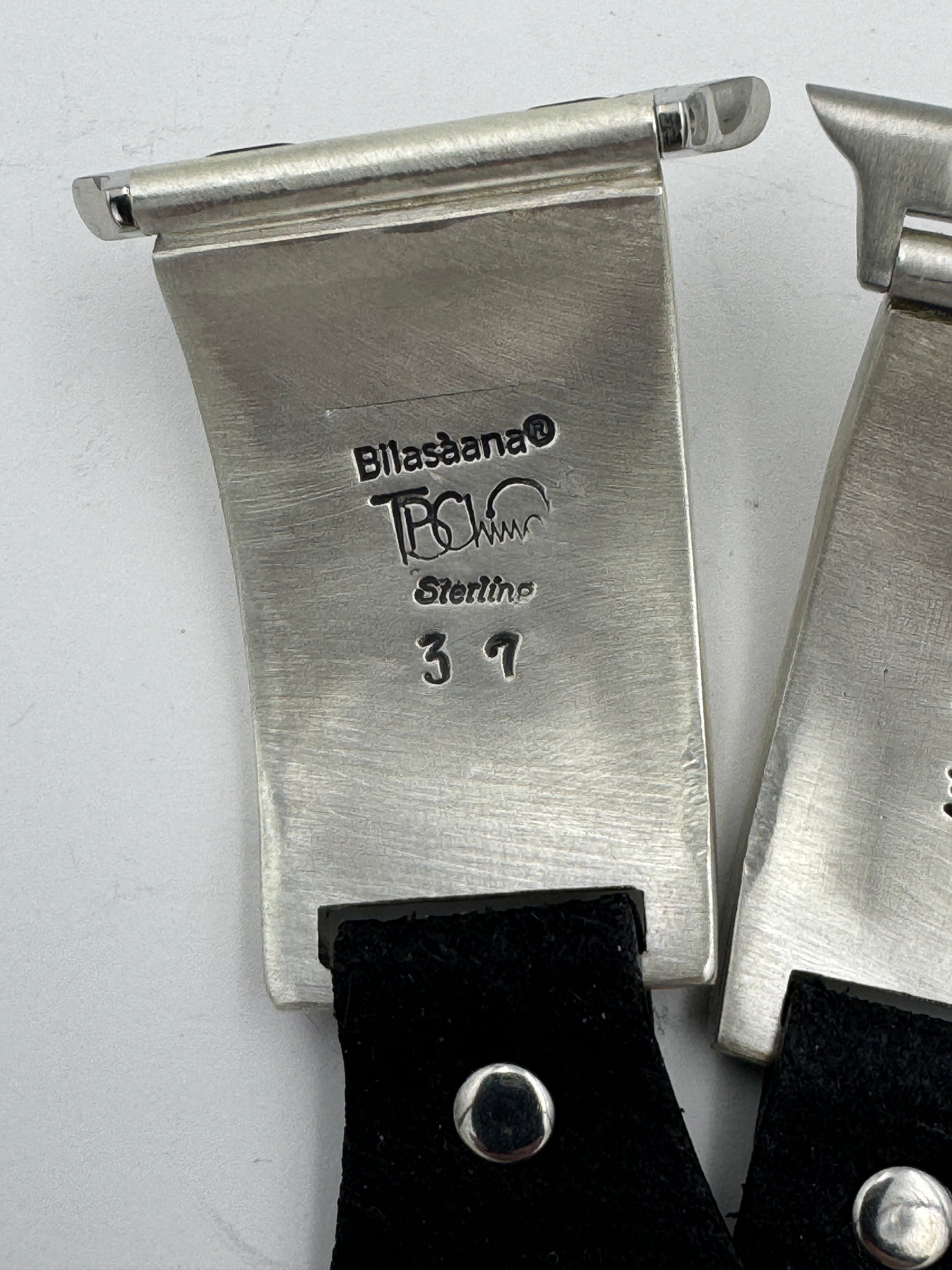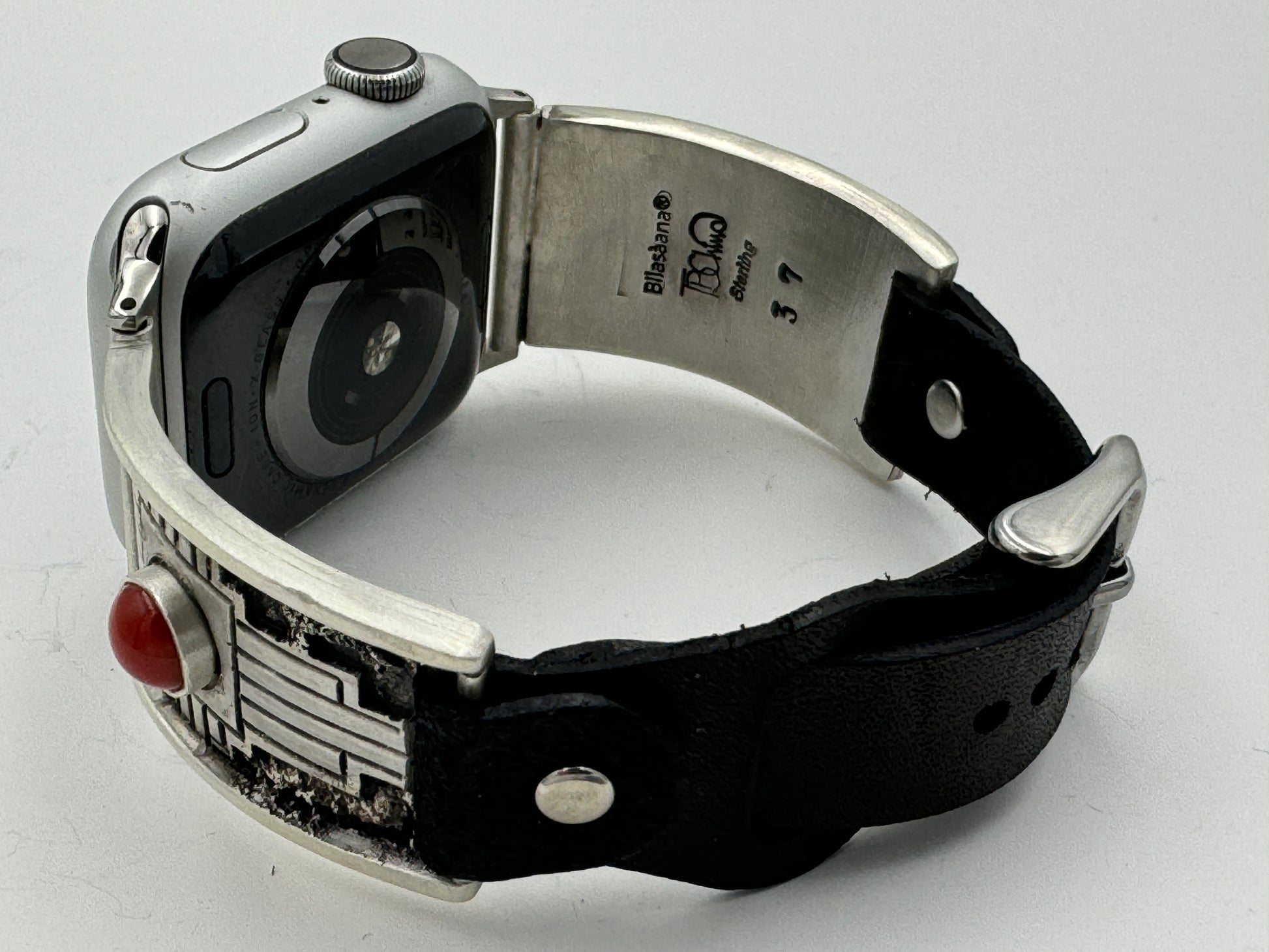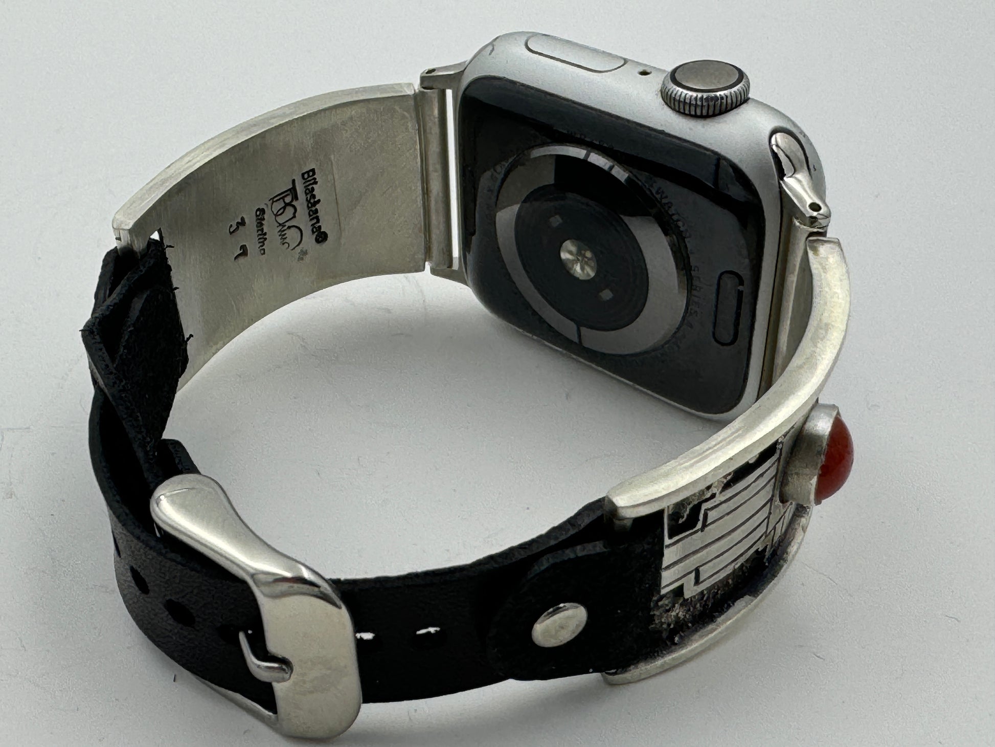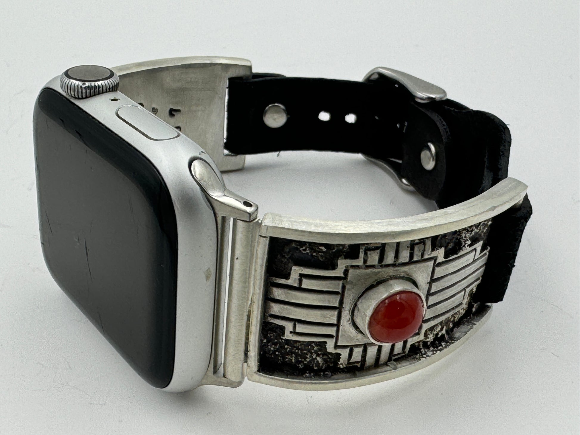 This is Tony Chino's 37th Bilasaana piece offered. The iBand consists of two Sterling Silver Tips with 38/40/41mm Apple WATCH adapters and a leather expansion band. The Sterling Silver Tips are Handcrafted by Tony Chino of Acoma Pueblo heritage and have a unique Sterling Silver design. Each tip has silver in the shape of a Zia with round coral stones in the center. On the inside of each Tip is the official Bilasáana® Trademark, a Sterling stamp, the serial number 37 and Tony's official hallmark stamp.