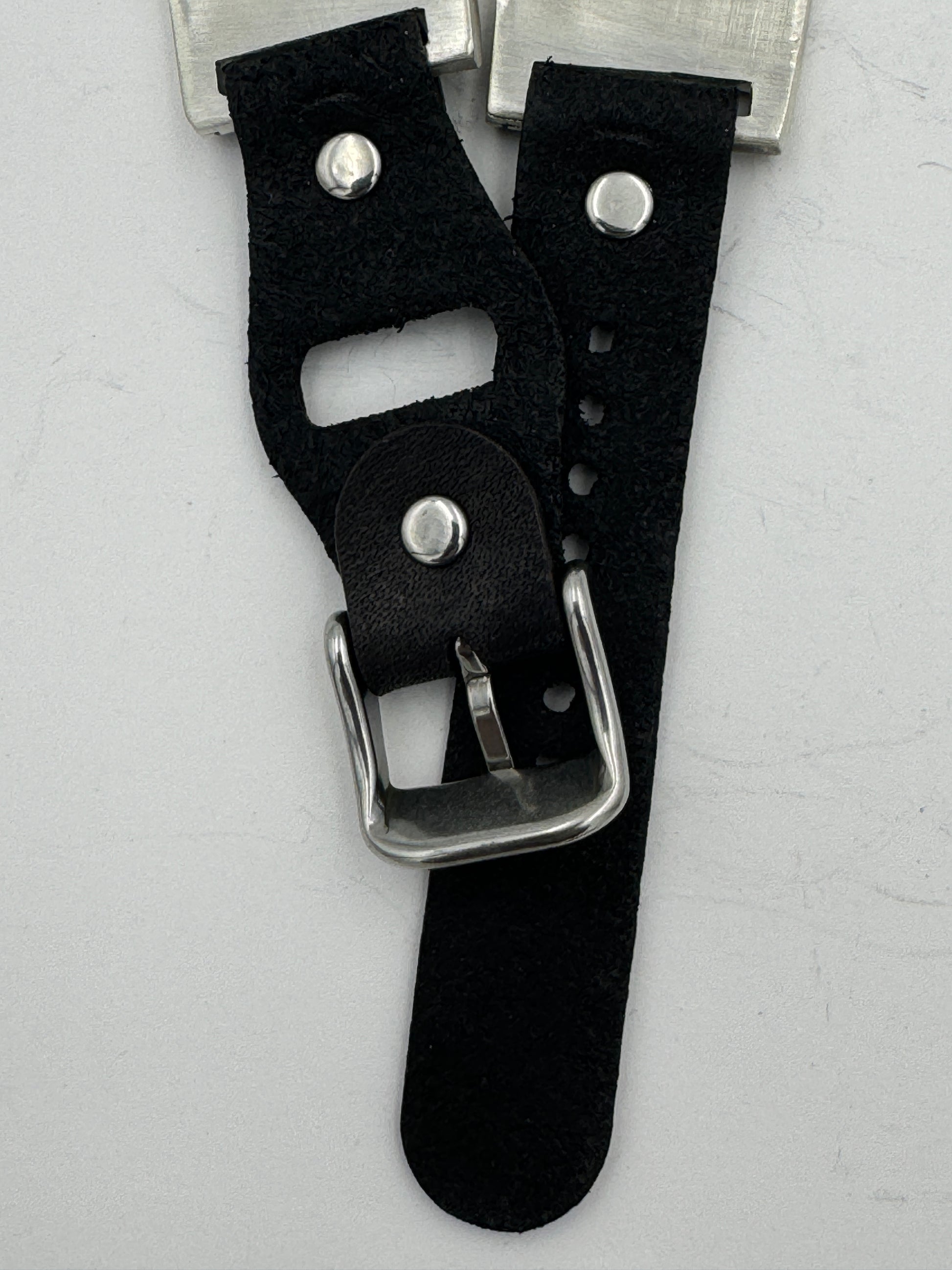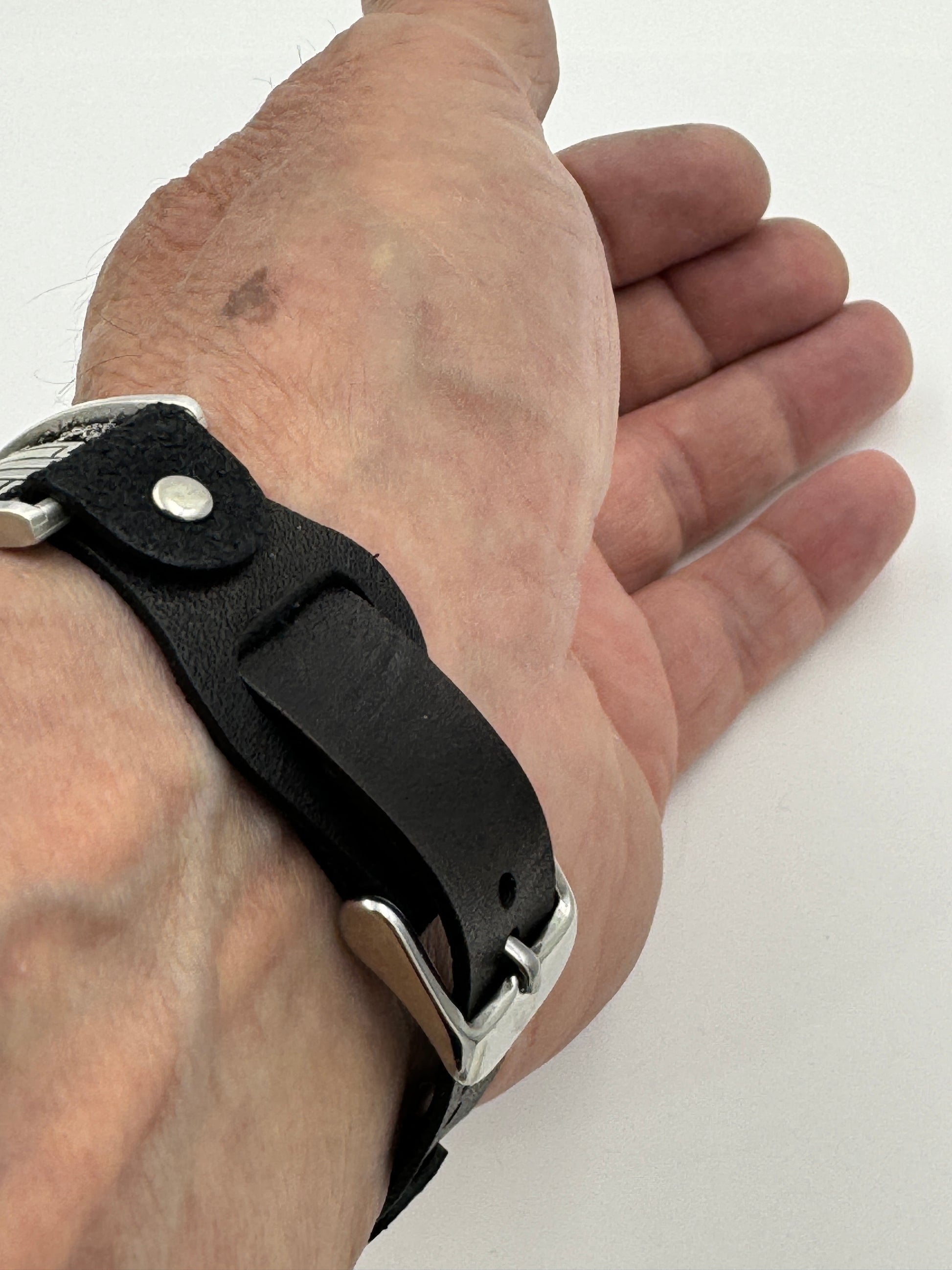 The iBand comes with our Laser Cut Water Resistant Riveted Buckle Leather Band v6.0 as shown. The leather band comes in two sizes S/M and M/L. The iBand shown has a Black and Brown S/M band attached. This is a great piece for a small to a medium size wrist. We can size this band to fit virtually any wrist. We can do the leather band in black, dark brown and other colors. Choose your band size at checkout and we will contact you to assure a nice fit. Be sure and leave us valid contact information and watch for our message to you. The iBand will seamlessly integrate with the Apple 38mm Series 1 thru Series 9 41mm WATCH. We can also adapt this band to the 42/44/45mm or the new 49mm Ultra or Ultra 2 Apple Watches. This setup works nicely for those with the large Apple Watch and a small wrist.