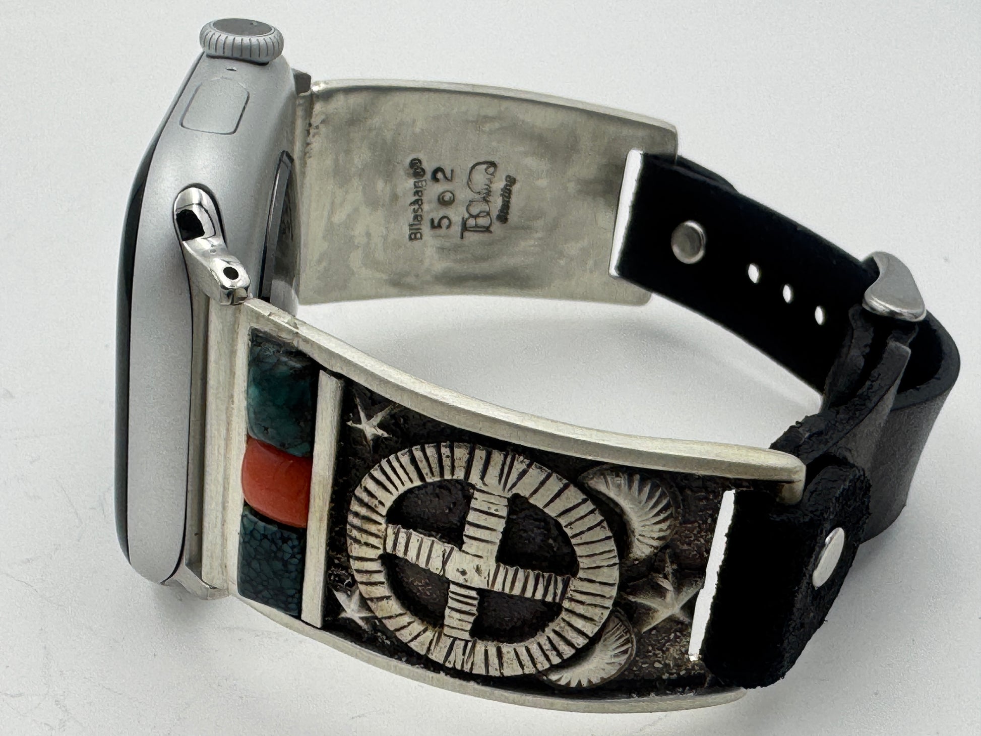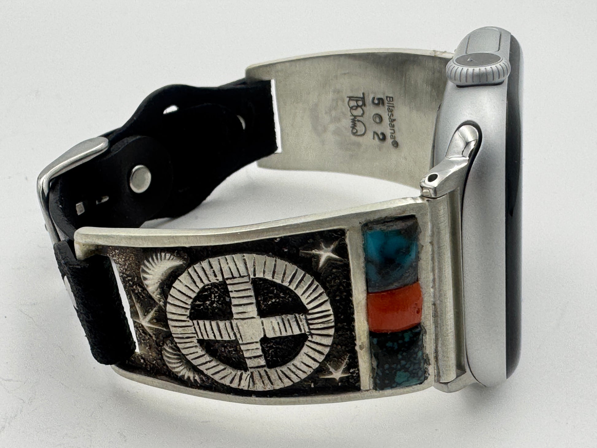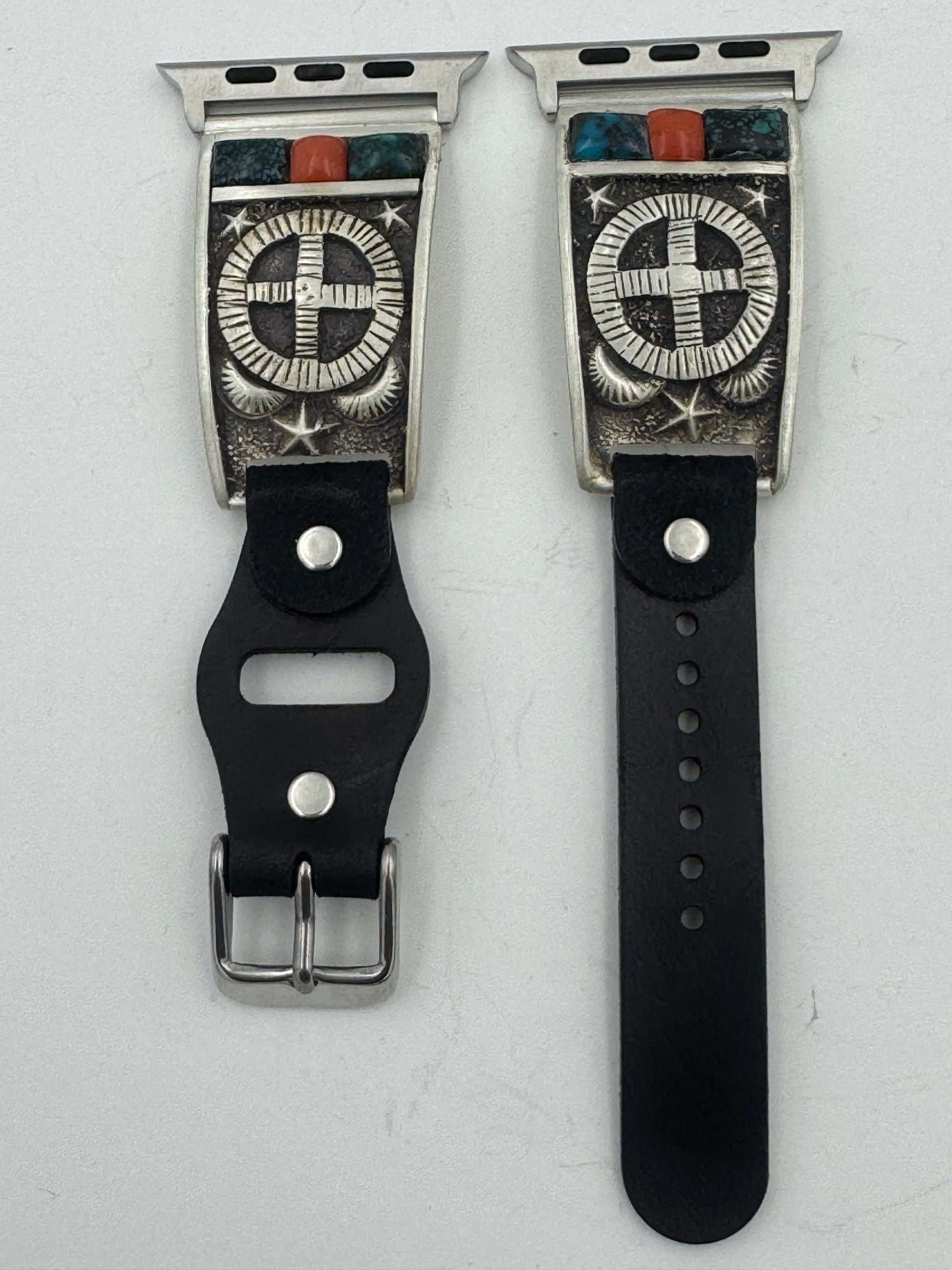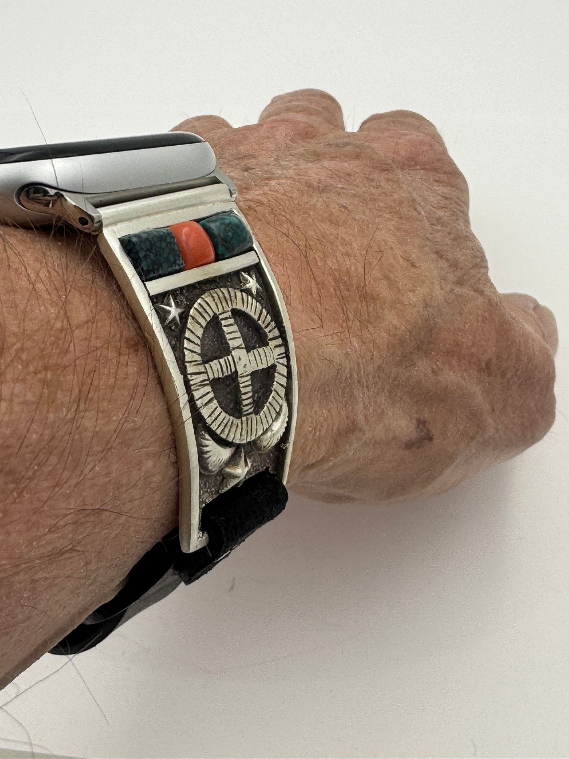 This is Tony Chino's 52nd Bilasaana piece offered. The iBand consists of two Sterling Silver Tips with 42/44/45/46mm Apple Watch adapters and a leather expansion band. The Sterling Silver Tips are Handcrafted by Tony Chino of Acoma Pueblo heritage and have a unique Sterling Silver design. Each tip has Hubei Turquoise and Tibetan Mediterranean Coral stones with a Sterling Silver Medicine Wheel. On the inside of each Tip is the official Bilasáana® Trademark, a Sterling stamp, the serial number 52 and Tony's official hallmark.