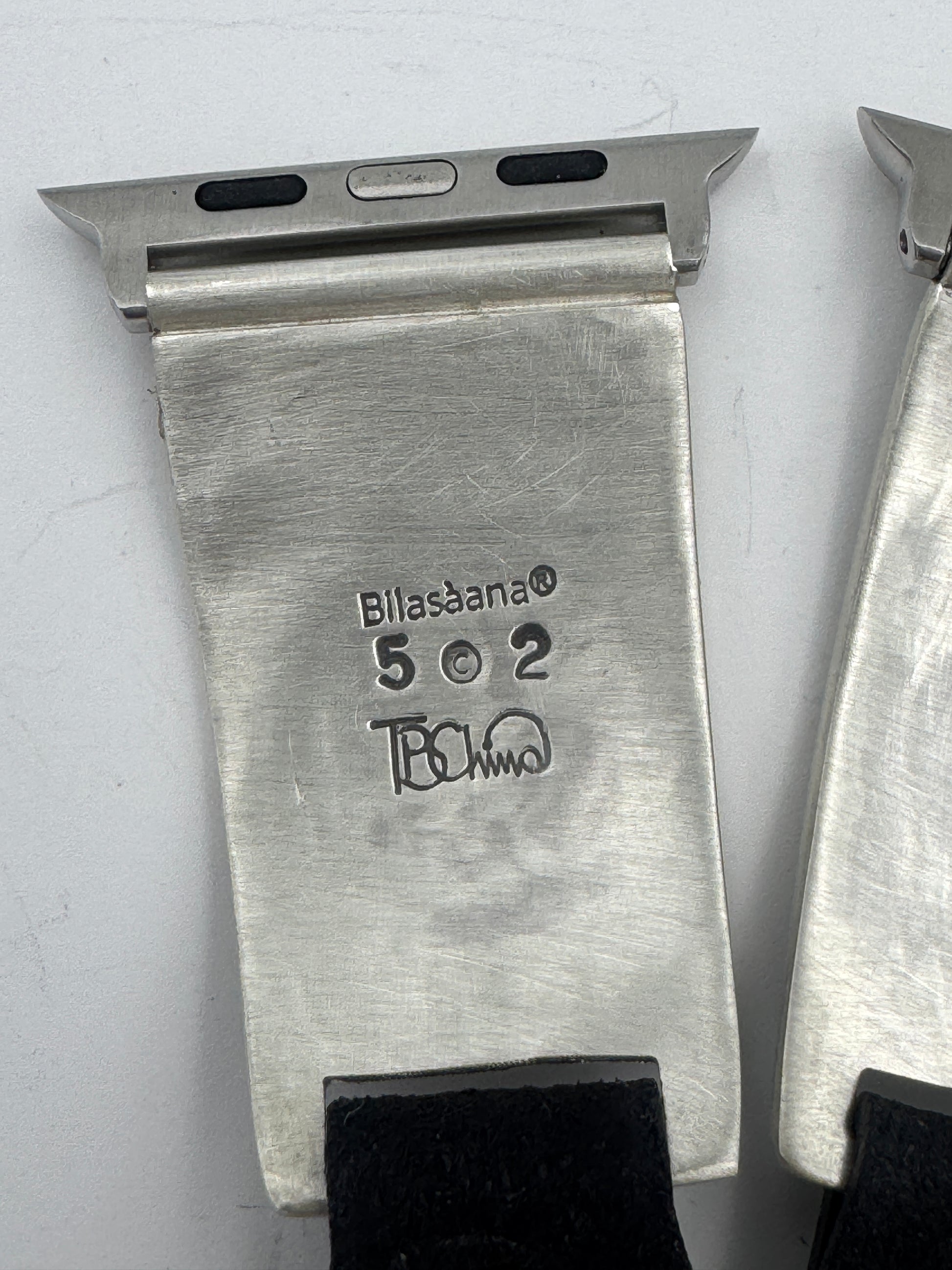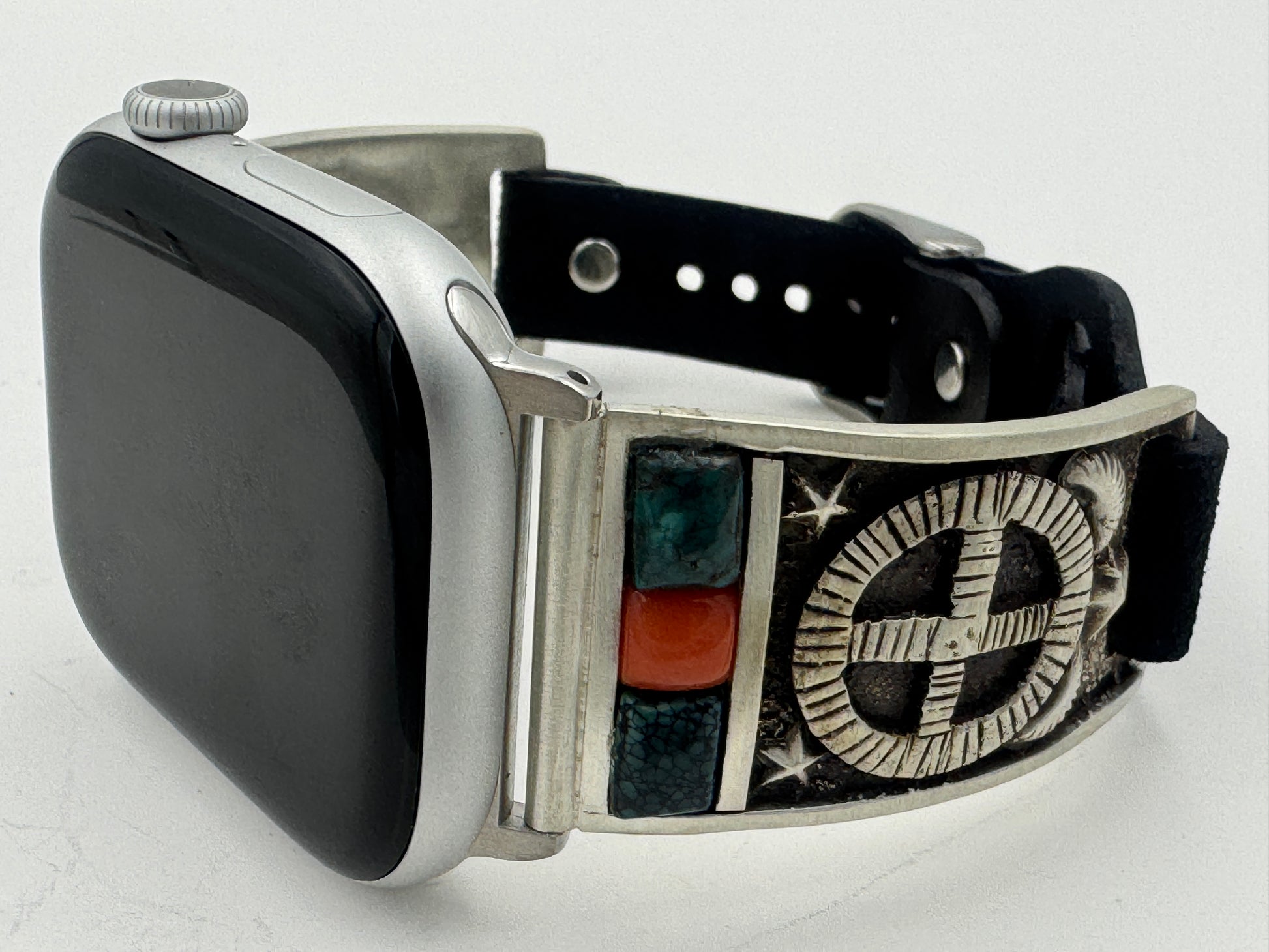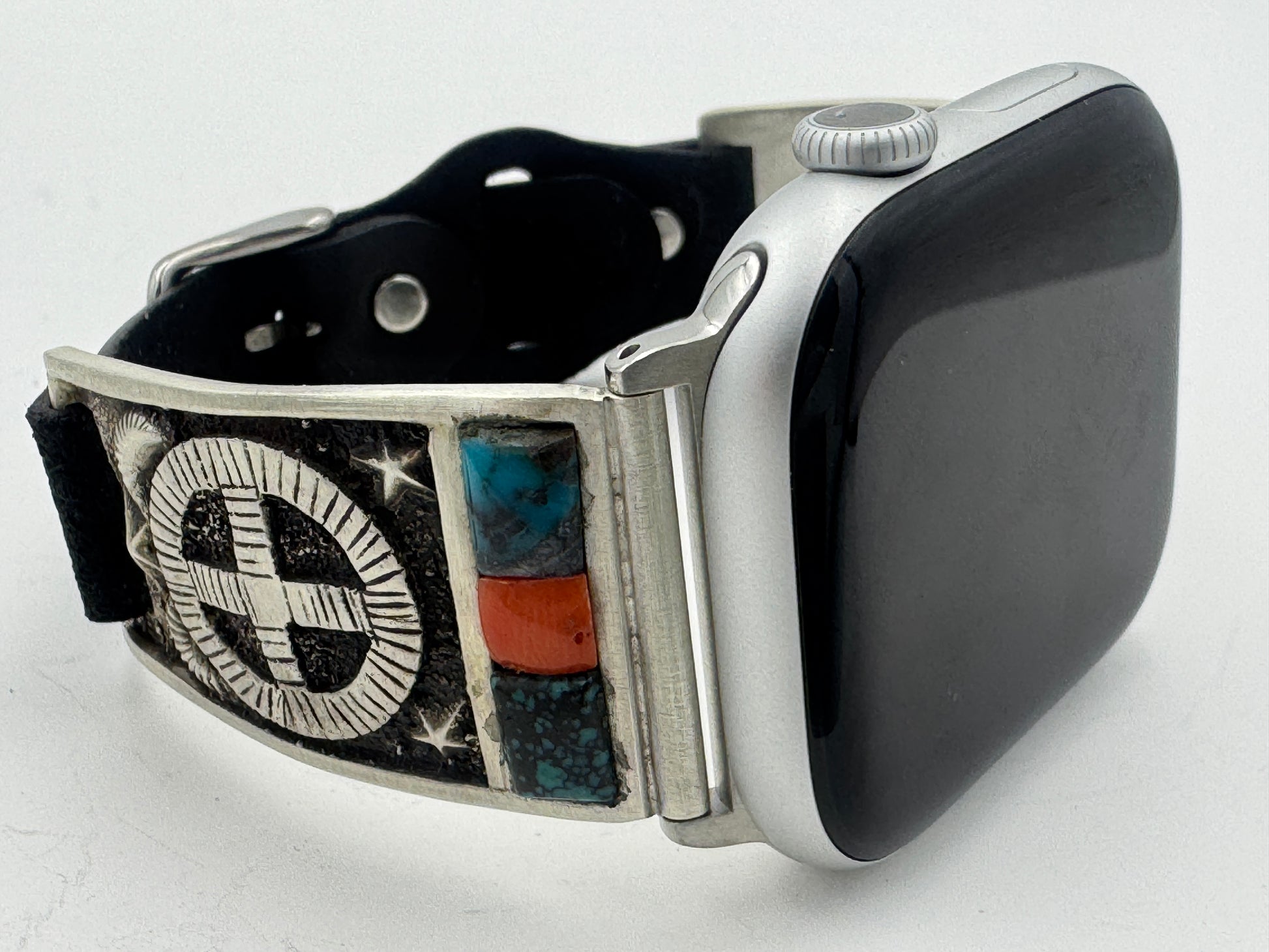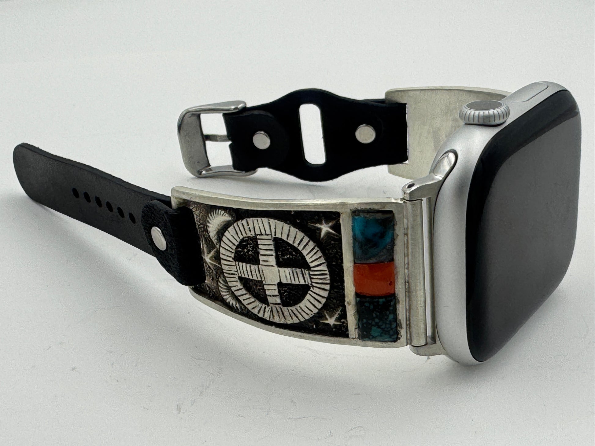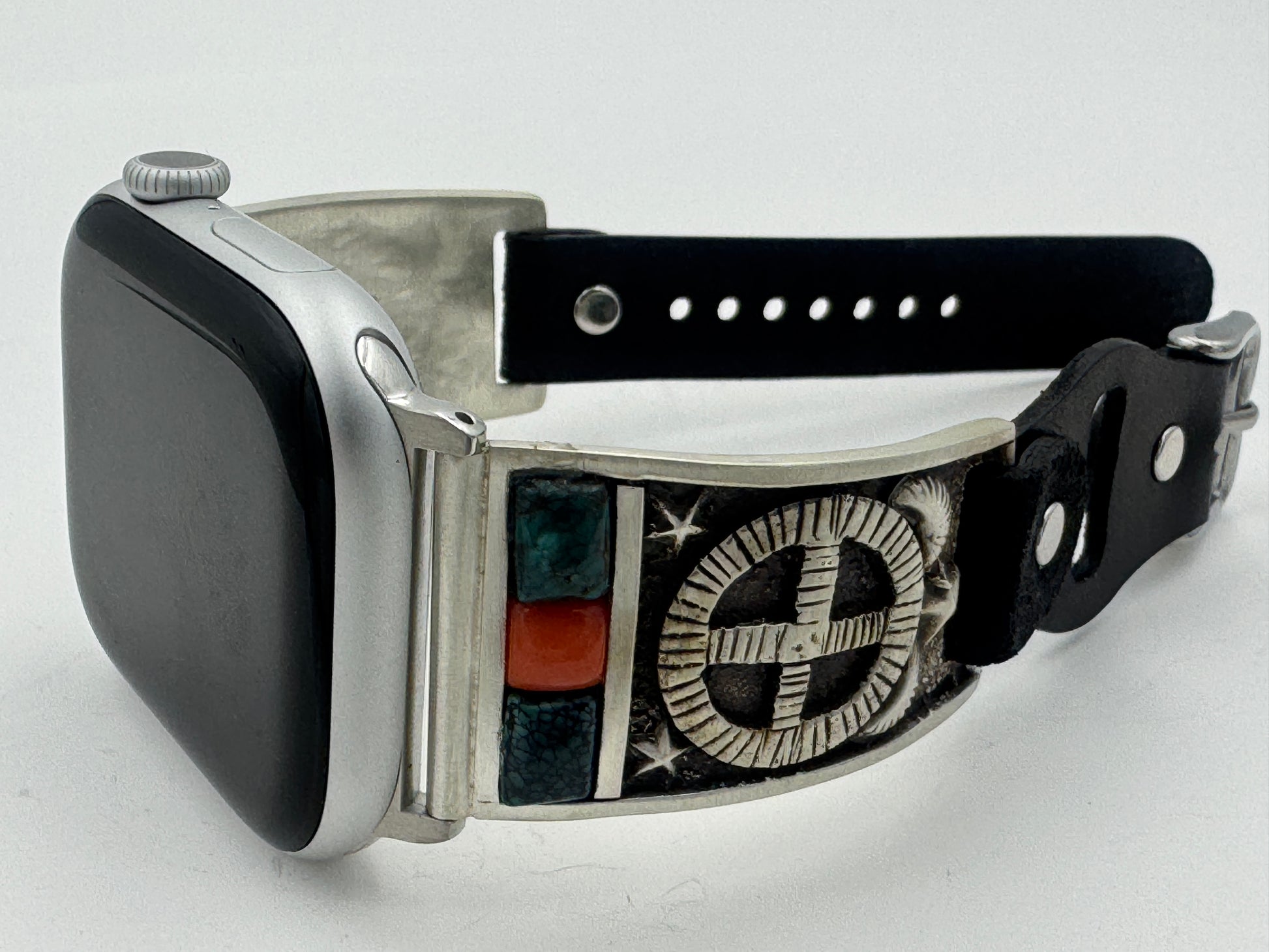 This is Tony Chino's 52nd Bilasaana piece offered. The iBand consists of two Sterling Silver Tips with 42/44/45/46mm Apple Watch adapters and a leather expansion band. The Sterling Silver Tips are Handcrafted by Tony Chino of Acoma Pueblo heritage and have a unique Sterling Silver design. Each tip has Hubei Turquoise and Tibetan Mediterranean Coral stones with a Sterling Silver Medicine Wheel. On the inside of each Tip is the official Bilasáana® Trademark, a Sterling stamp, the serial number 52 and Tony's official hallmark.