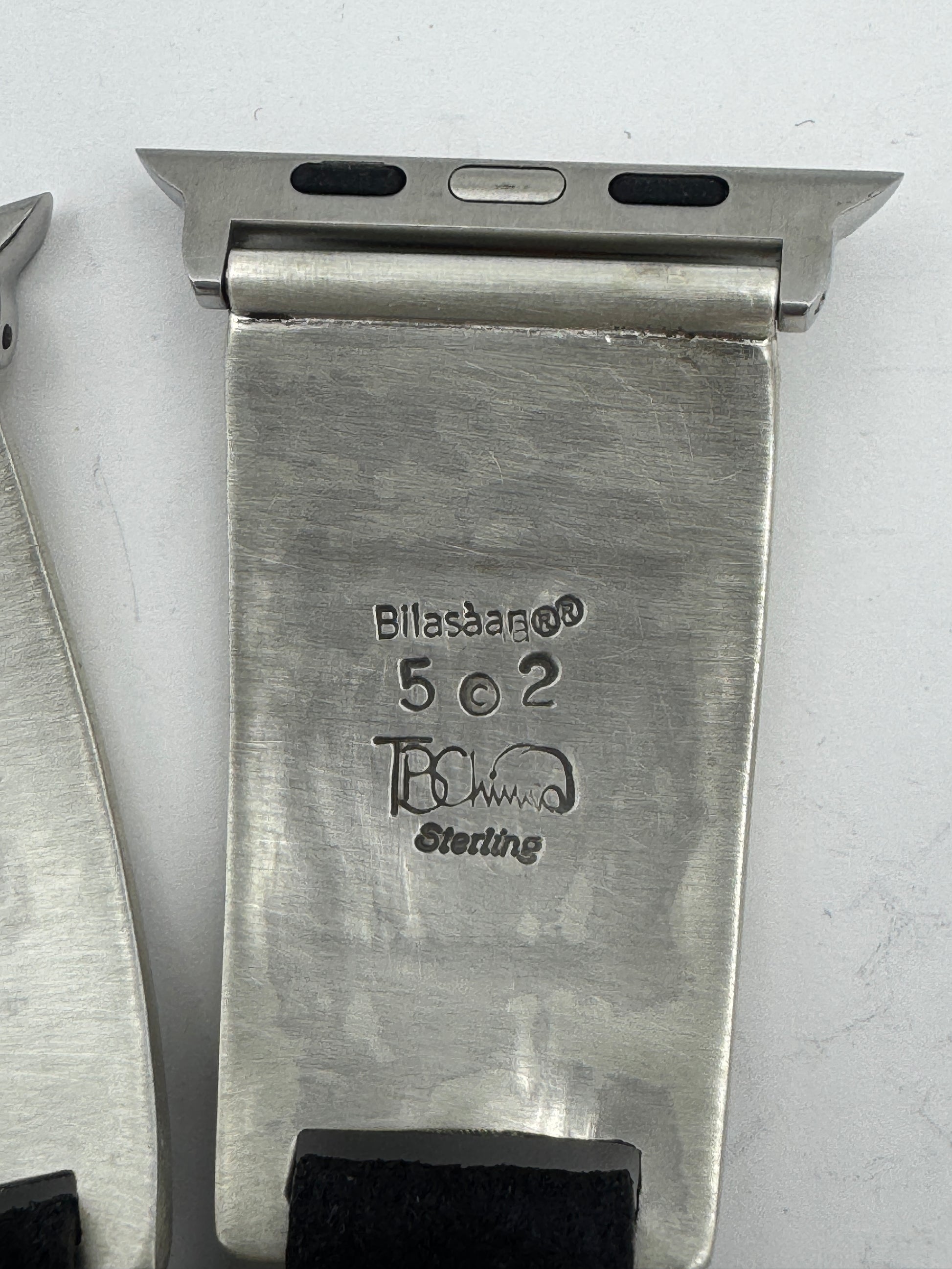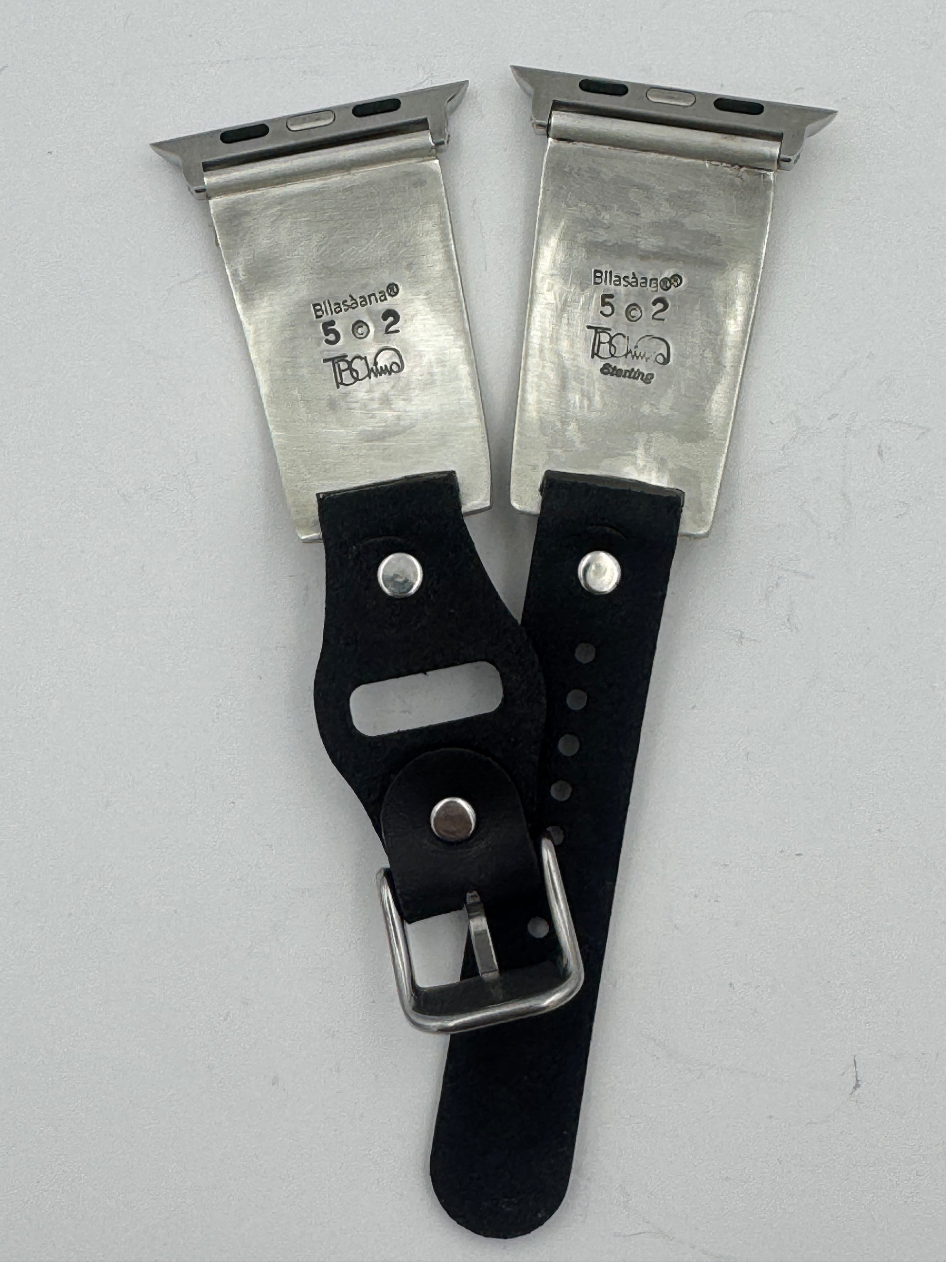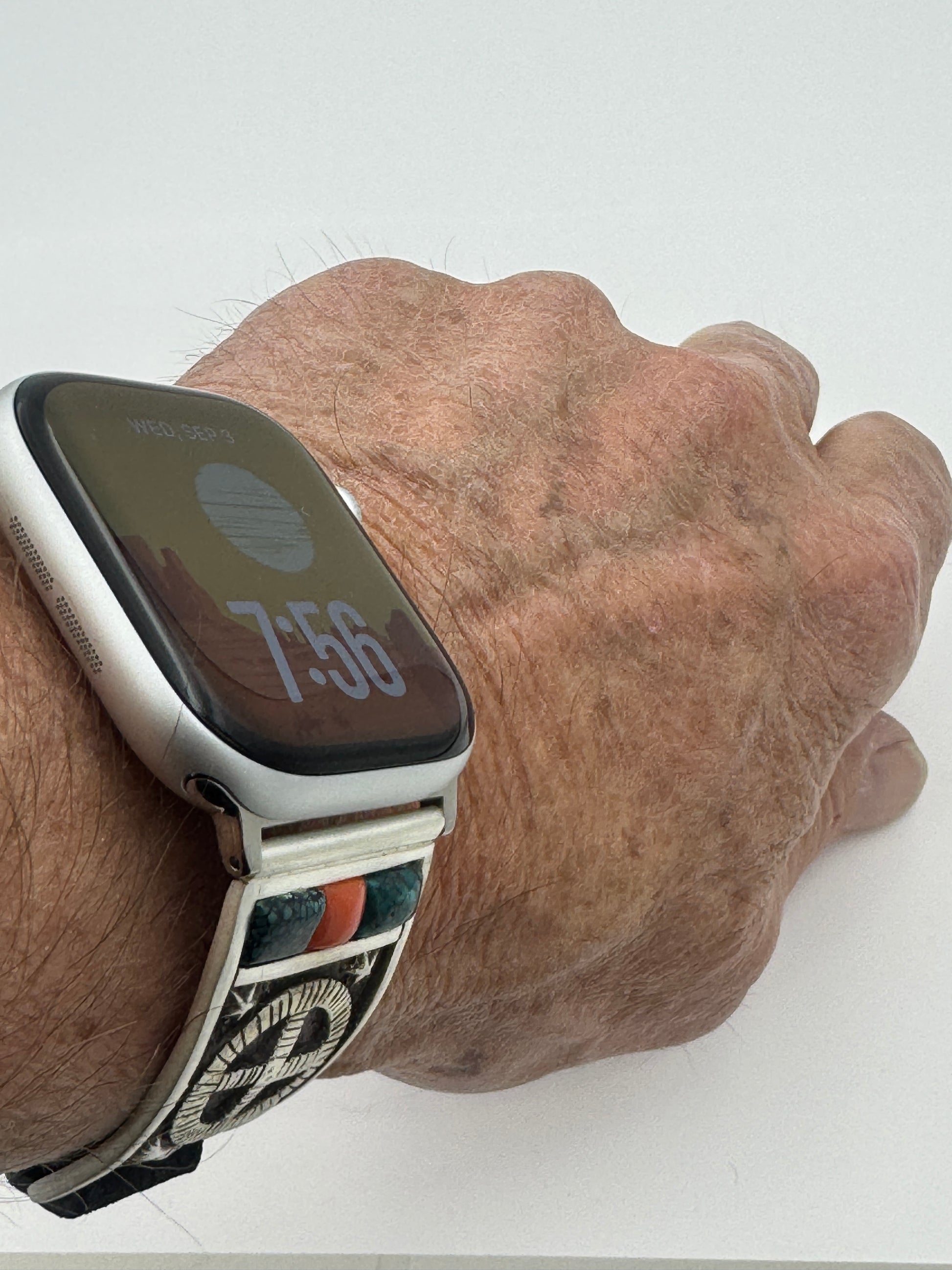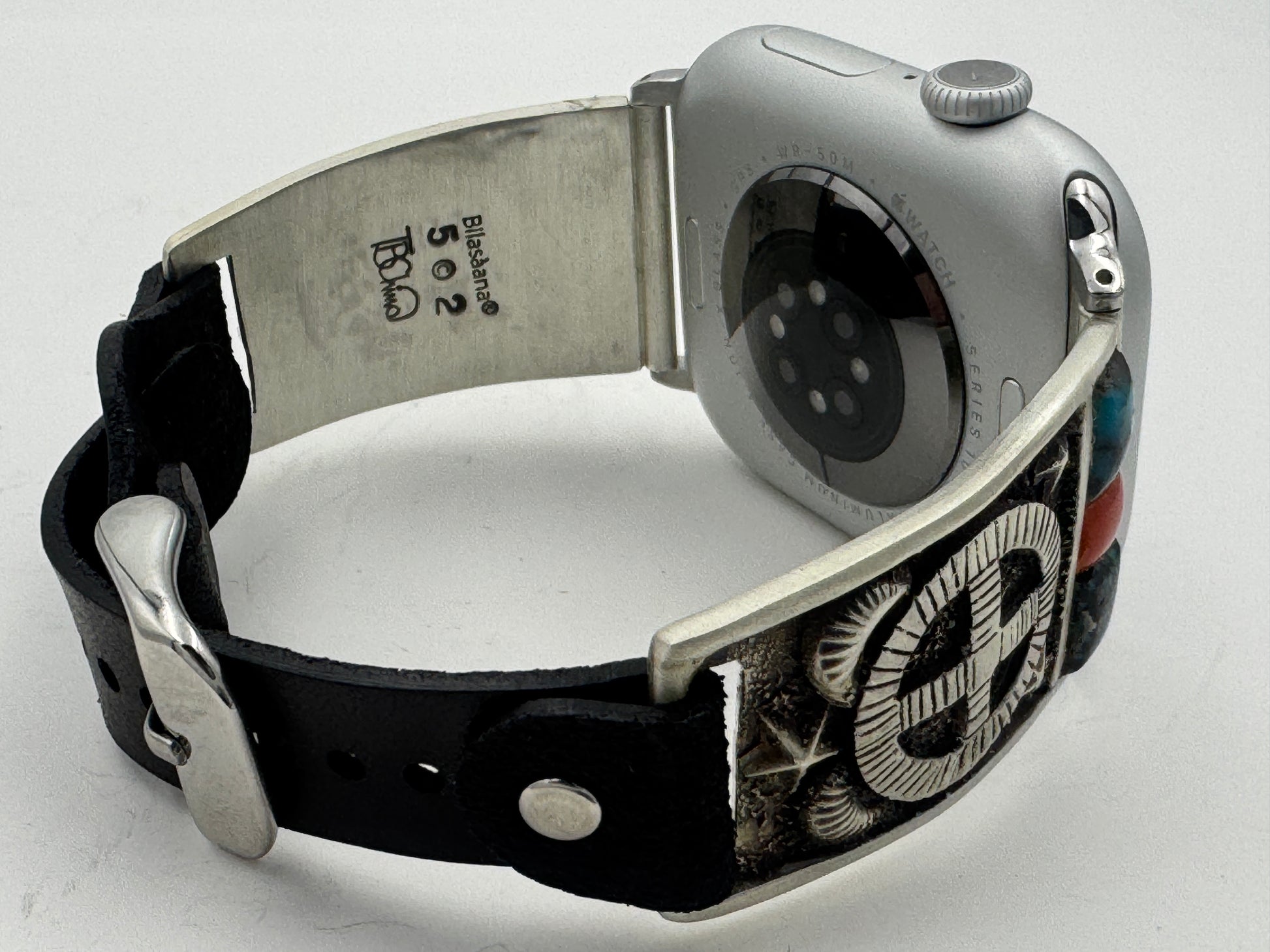 This is Tony Chino's 52nd Bilasaana piece offered. The iBand consists of two Sterling Silver Tips with 42/44/45/46mm Apple Watch adapters and a leather expansion band. The Sterling Silver Tips are Handcrafted by Tony Chino of Acoma Pueblo heritage and have a unique Sterling Silver design. Each tip has Hubei Turquoise and Tibetan Mediterranean Coral stones with a Sterling Silver Medicine Wheel. On the inside of each Tip is the official Bilasáana® Trademark, a Sterling stamp, the serial number 52 and Tony's official hallmark.
