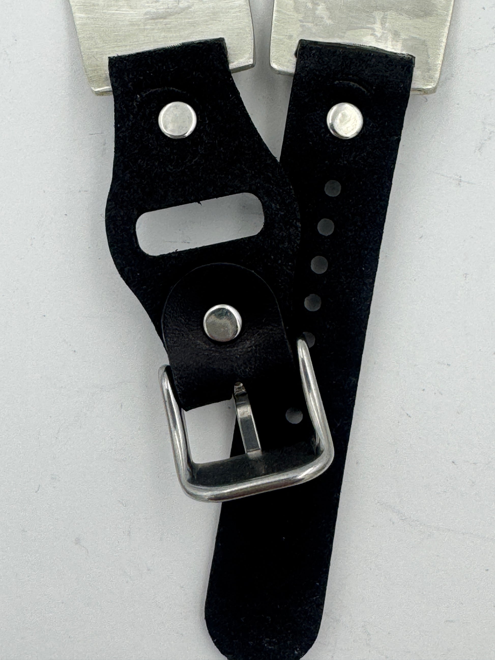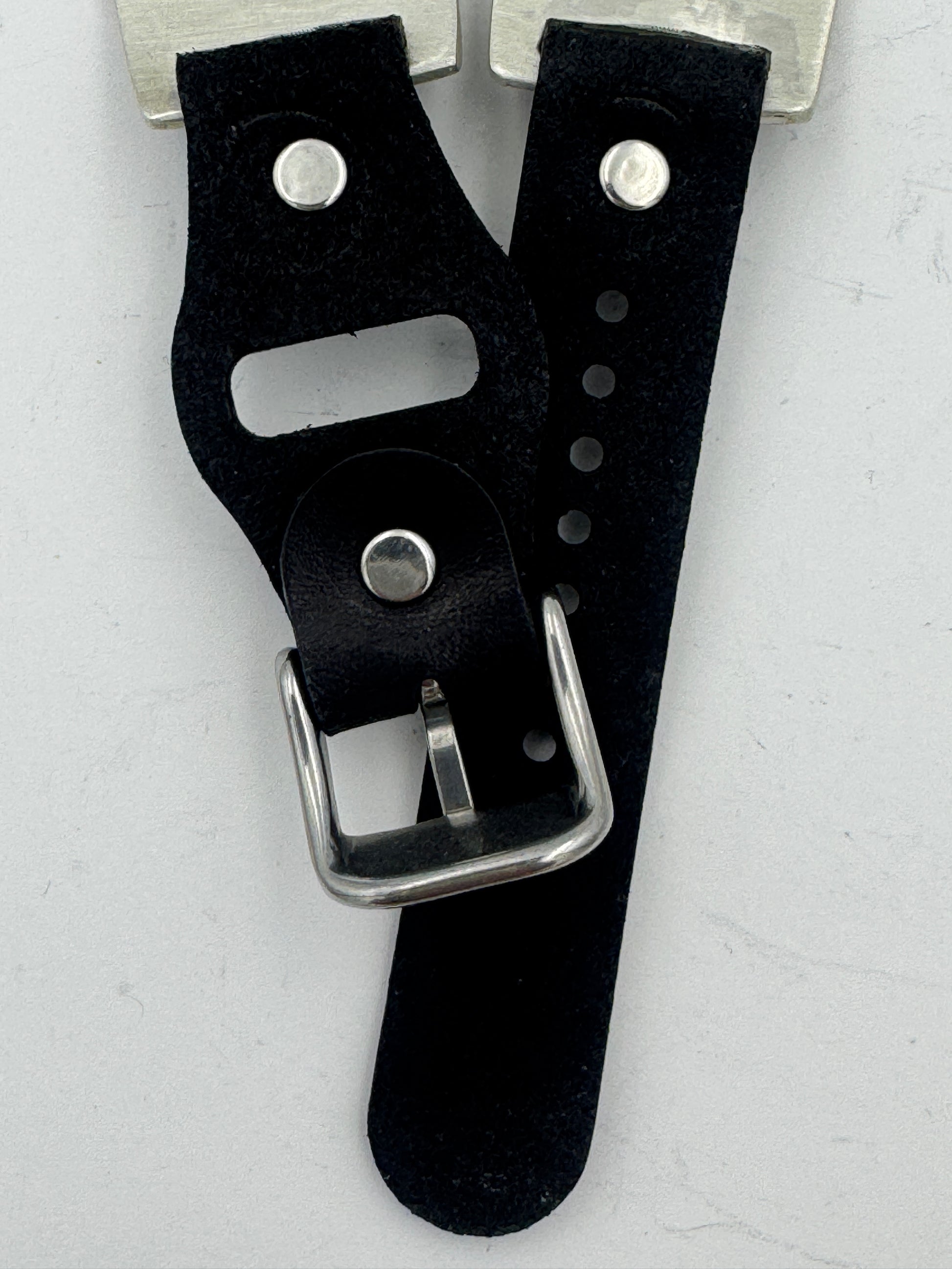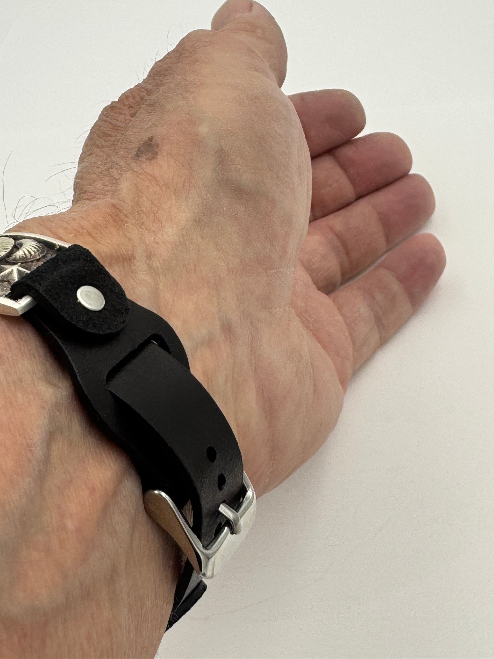 The iBand comes with a choice of our new Laser Cut Riveted Buckle bands in a variety of colors and styles. This band shown has our latest buckle no loop v6.0 UBB attached. This new buckle band has smaller holes which should last longer and gives a more precise fit than previous bands. This is a great piece for a small to a medium size wrist. We can size this band to fit virtually any wrist. Black, Dark brown and other colors available. Choose your band size at checkout and we will contact you to assure a nice fit. The iBand will seamlessly integrate with the Apple 42mm Series 1 thru Series 10 46mm WATCH. This band also works with the new Ultra and Ultra 2 49mm Apple Watches.
