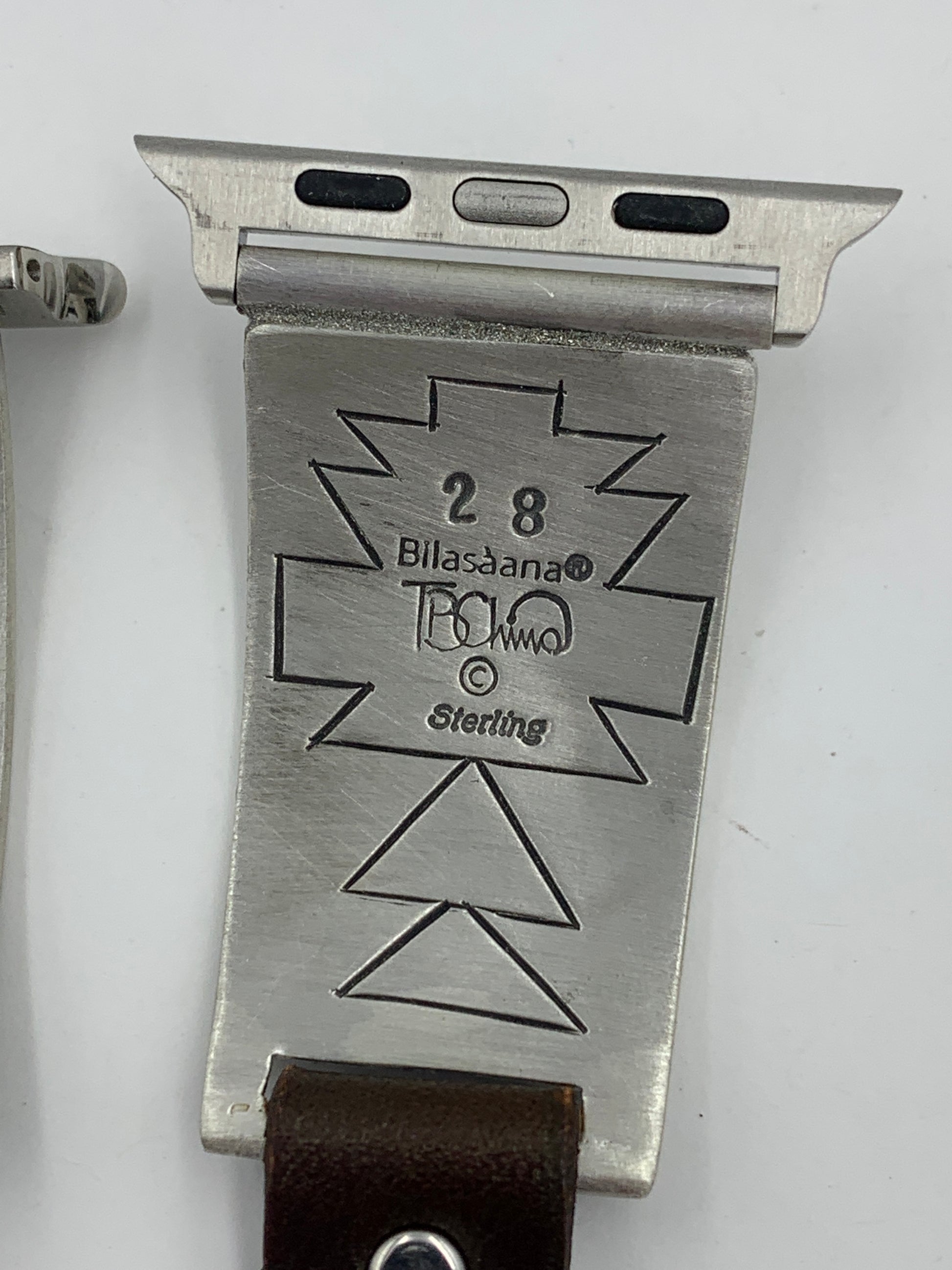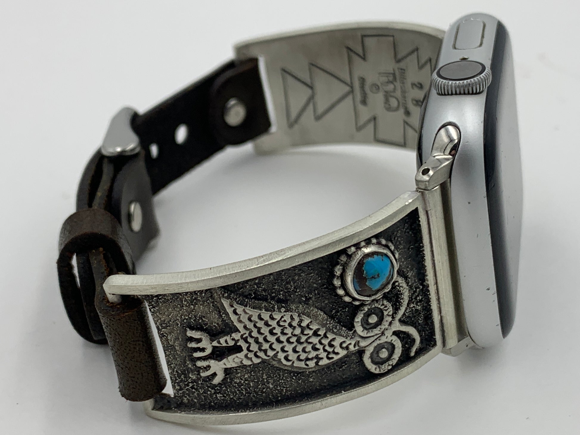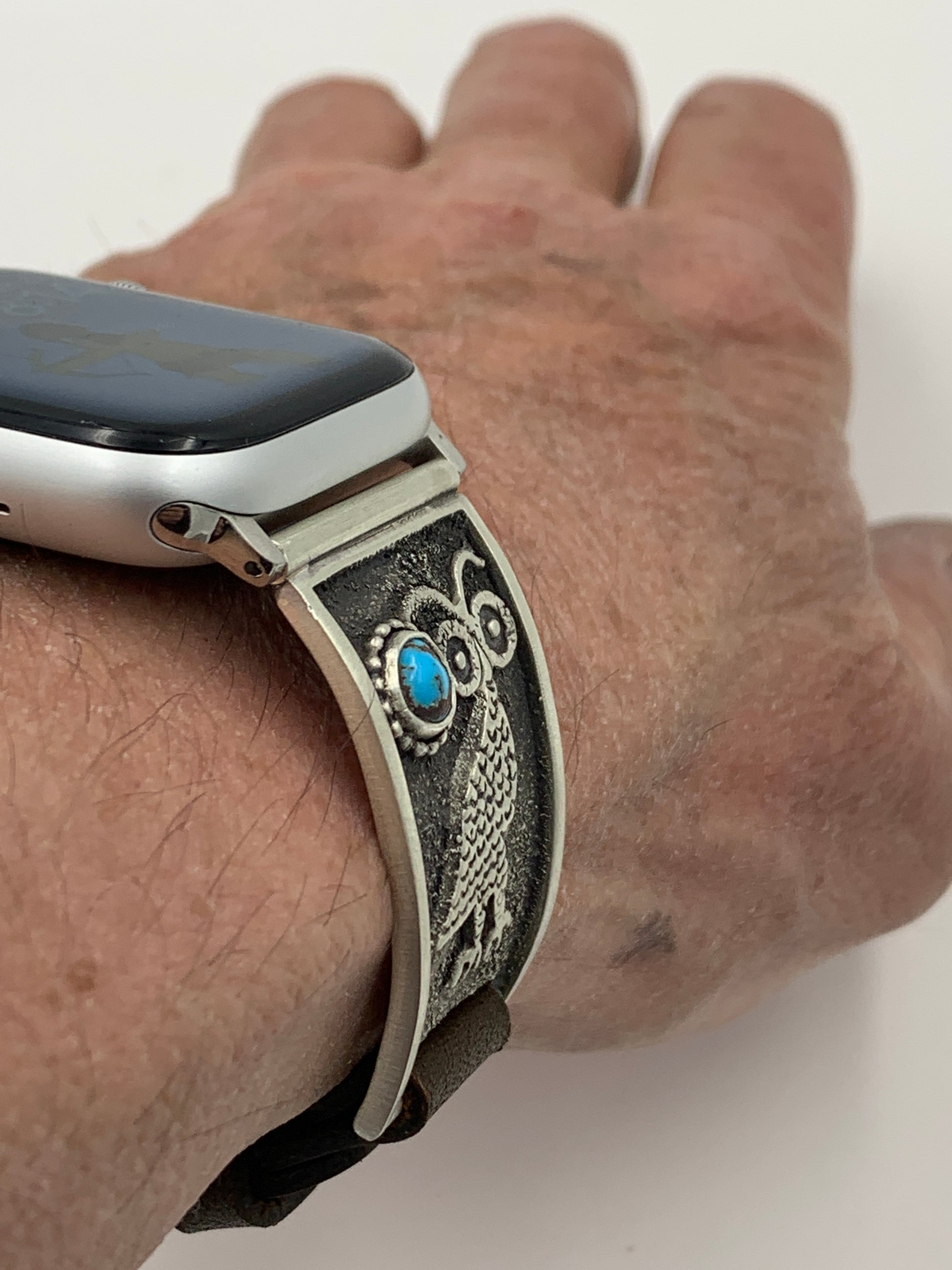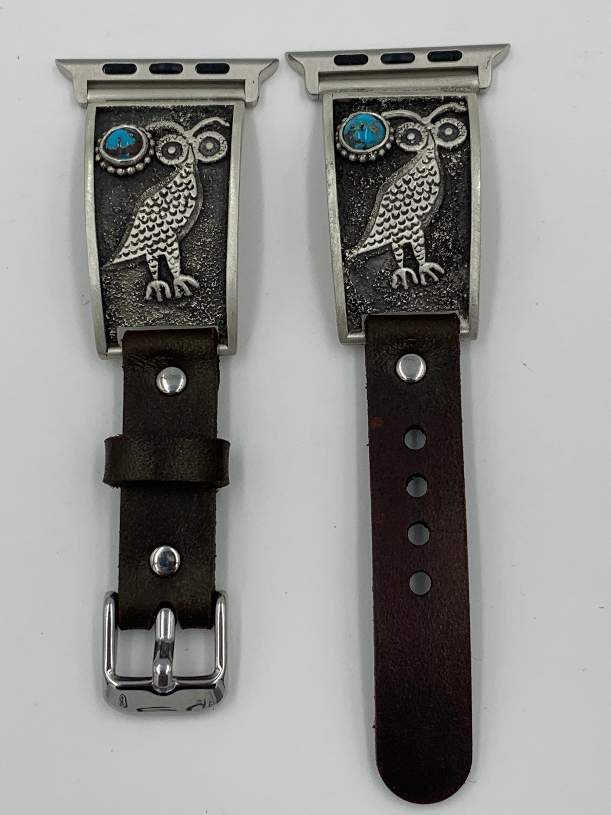 This is Tony Chino's 28th Bilasaana piece offered. The iBand consists of two Sterling Silver Tips with 42/44/45mm Apple WATCH adapters and a leather expansion band. The Sterling Silver Tips are Handcrafted by Tony Chino of Acoma Pueblo heritage and have a unique Sterling Silver design. Each tip has a silver Owl with a turquoise stone. On the inside of each Tip is the official Bilasáana® Trademark, a Sterling stamp, the serial number 28 and Tony's official hallmark and custom stamping.