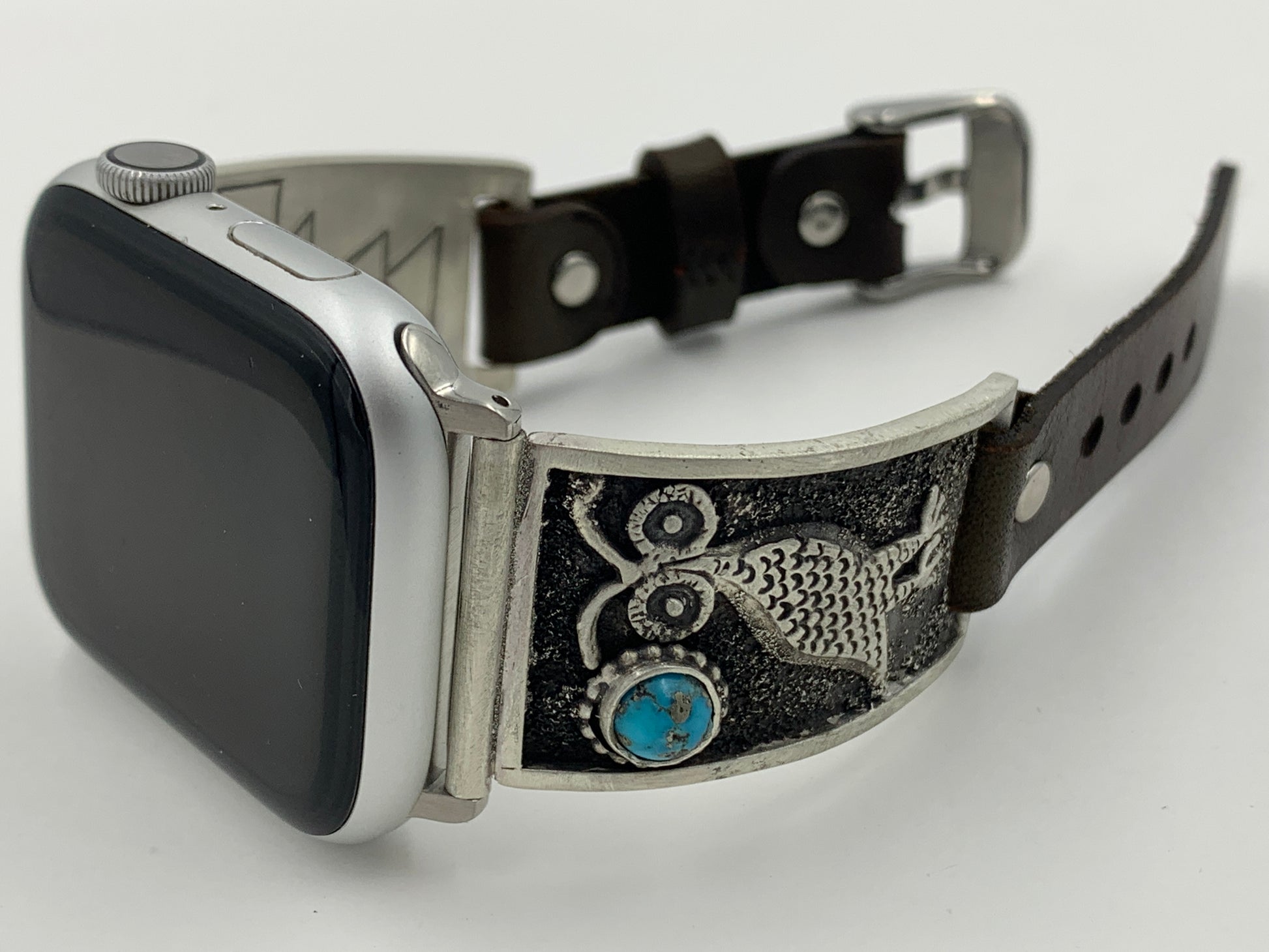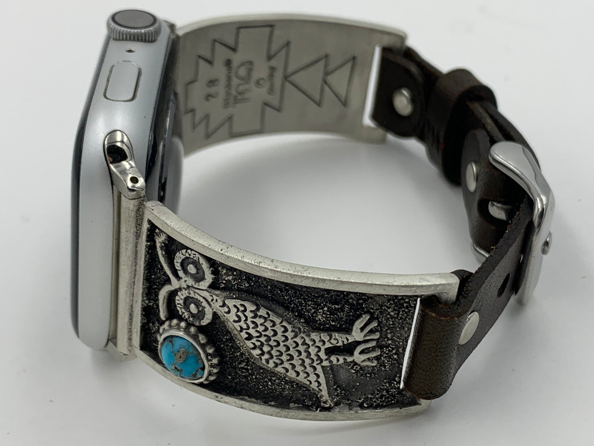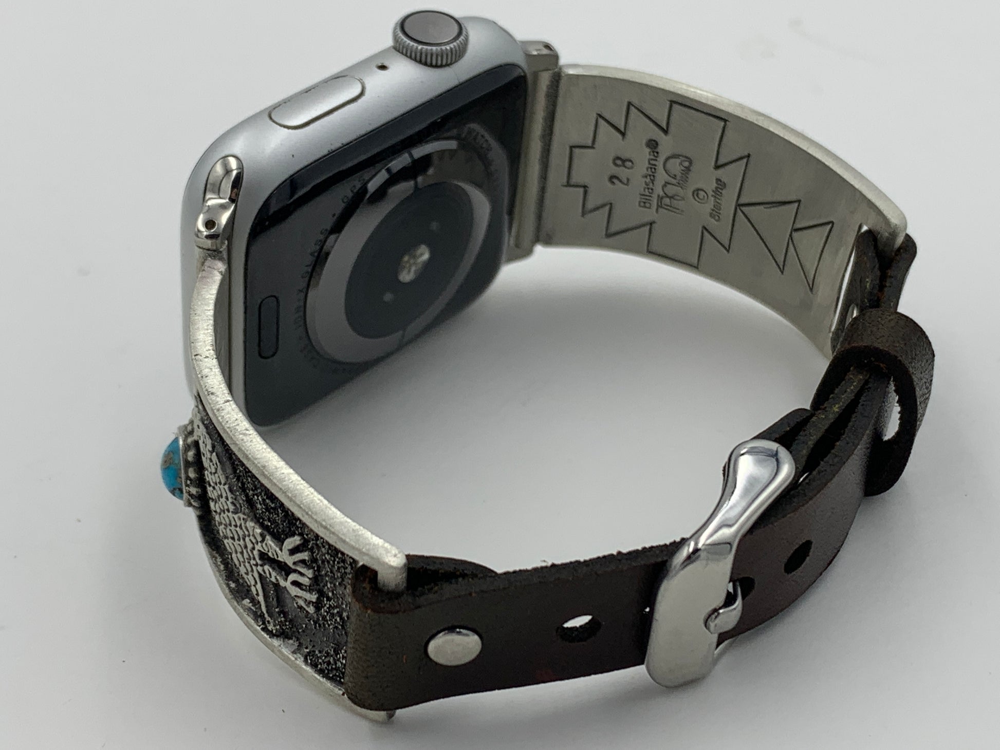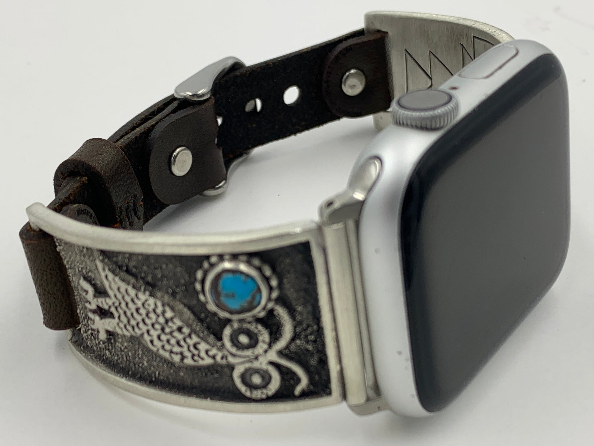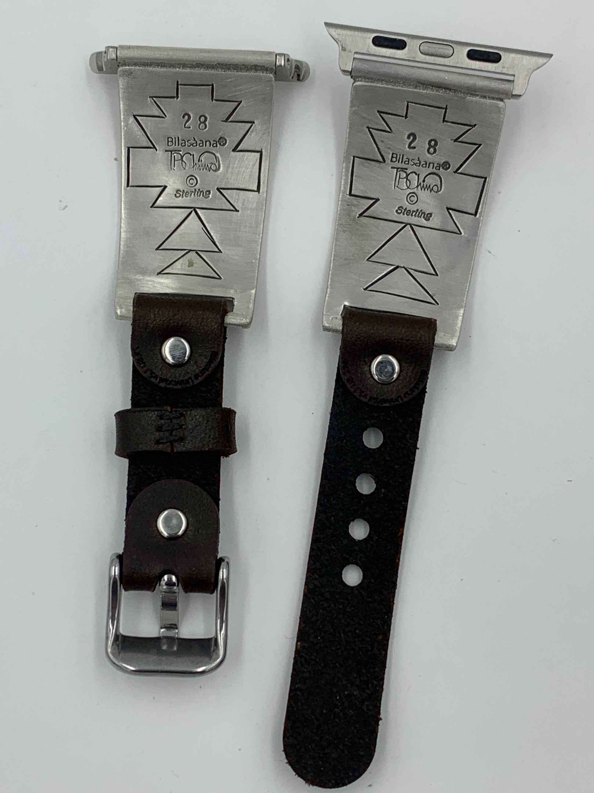This is Tony Chino's 28th Bilasaana piece offered. The iBand consists of two Sterling Silver Tips with 42/44/45mm Apple WATCH adapters and a leather expansion band. The Sterling Silver Tips are Handcrafted by Tony Chino of Acoma Pueblo heritage and have a unique Sterling Silver design. Each tip has a silver Owl with a turquoise stone. On the inside of each Tip is the official Bilasáana® Trademark, a Sterling stamp, the serial number 28 and Tony's official hallmark and custom stamping.