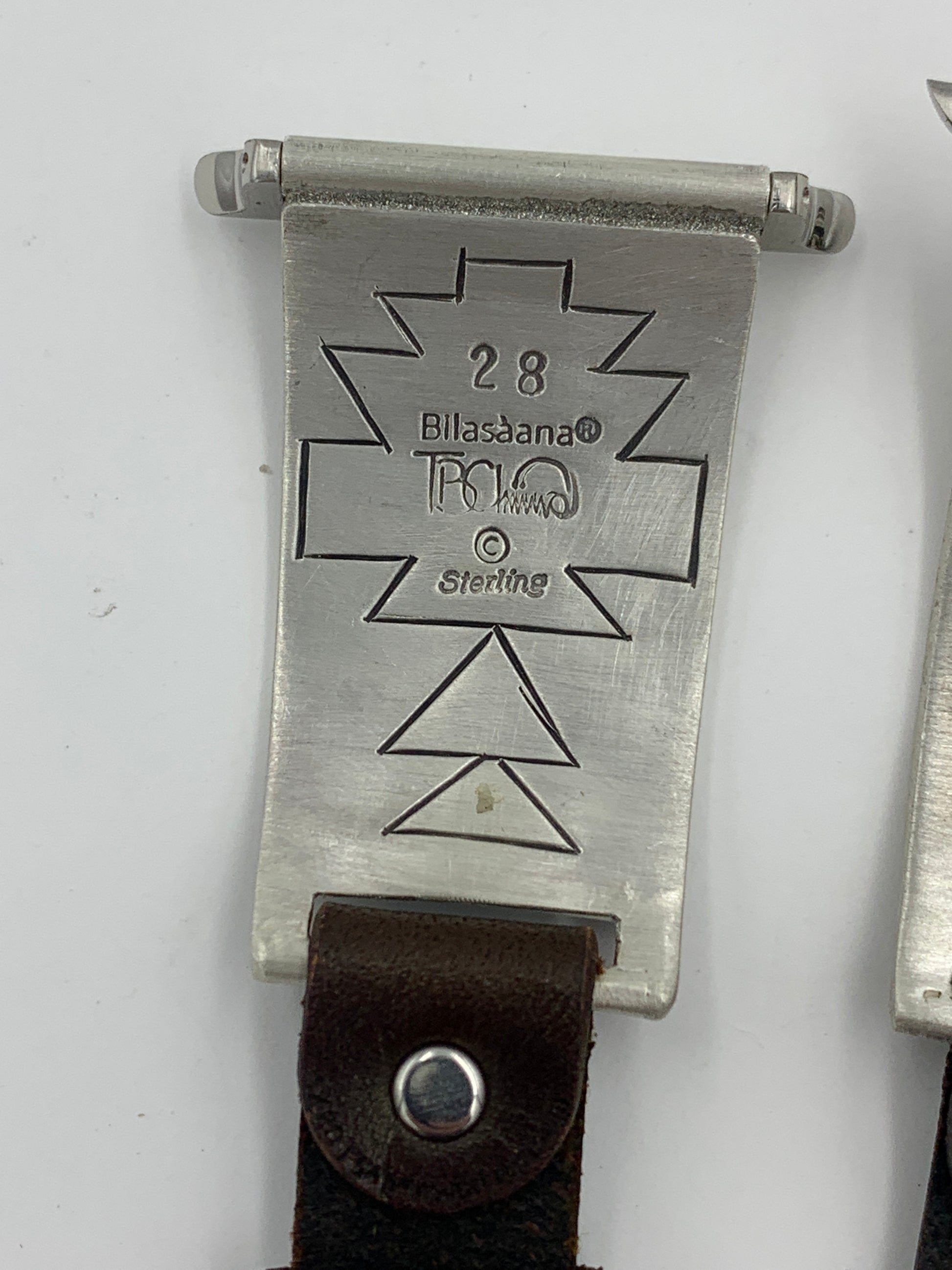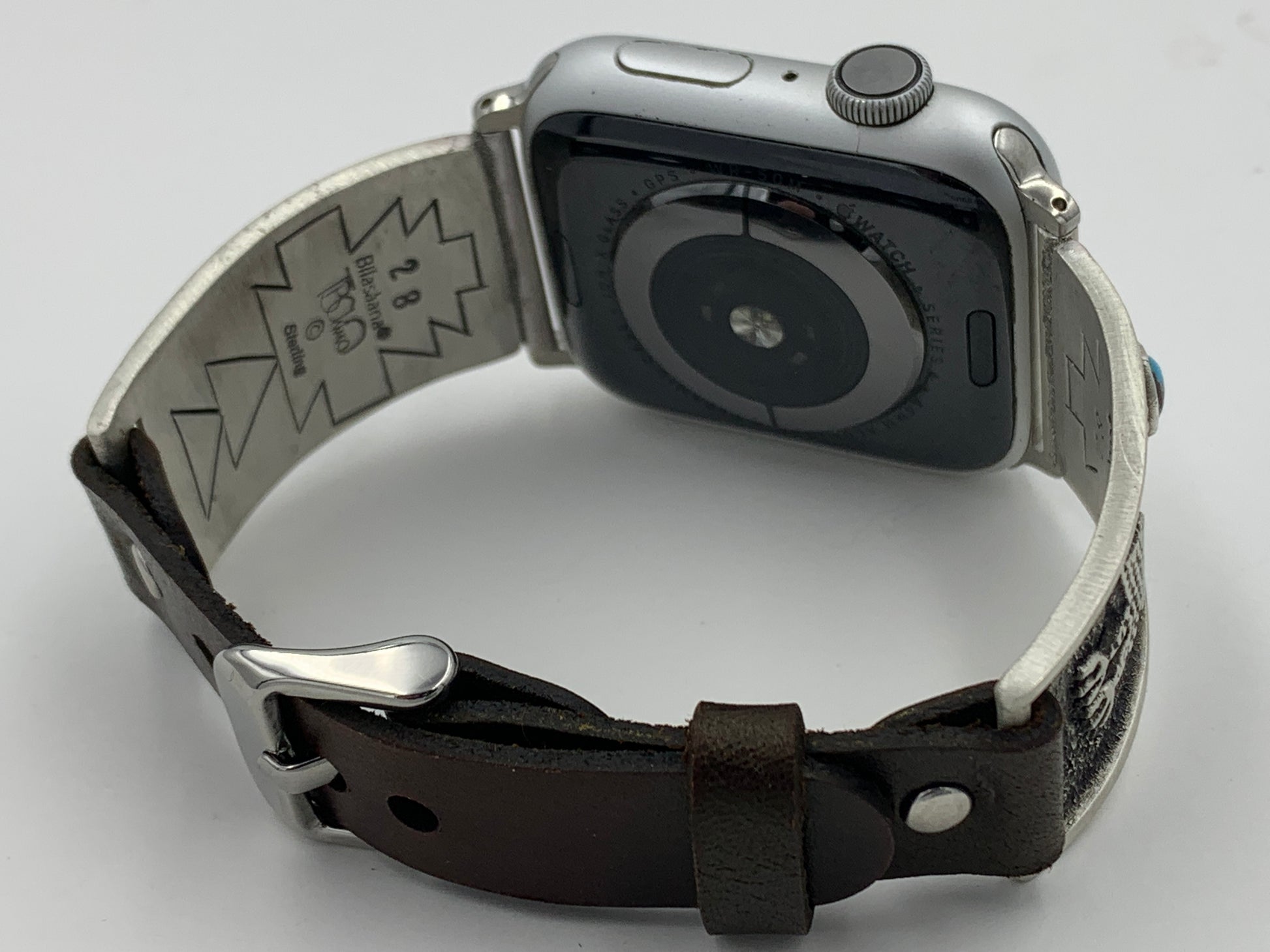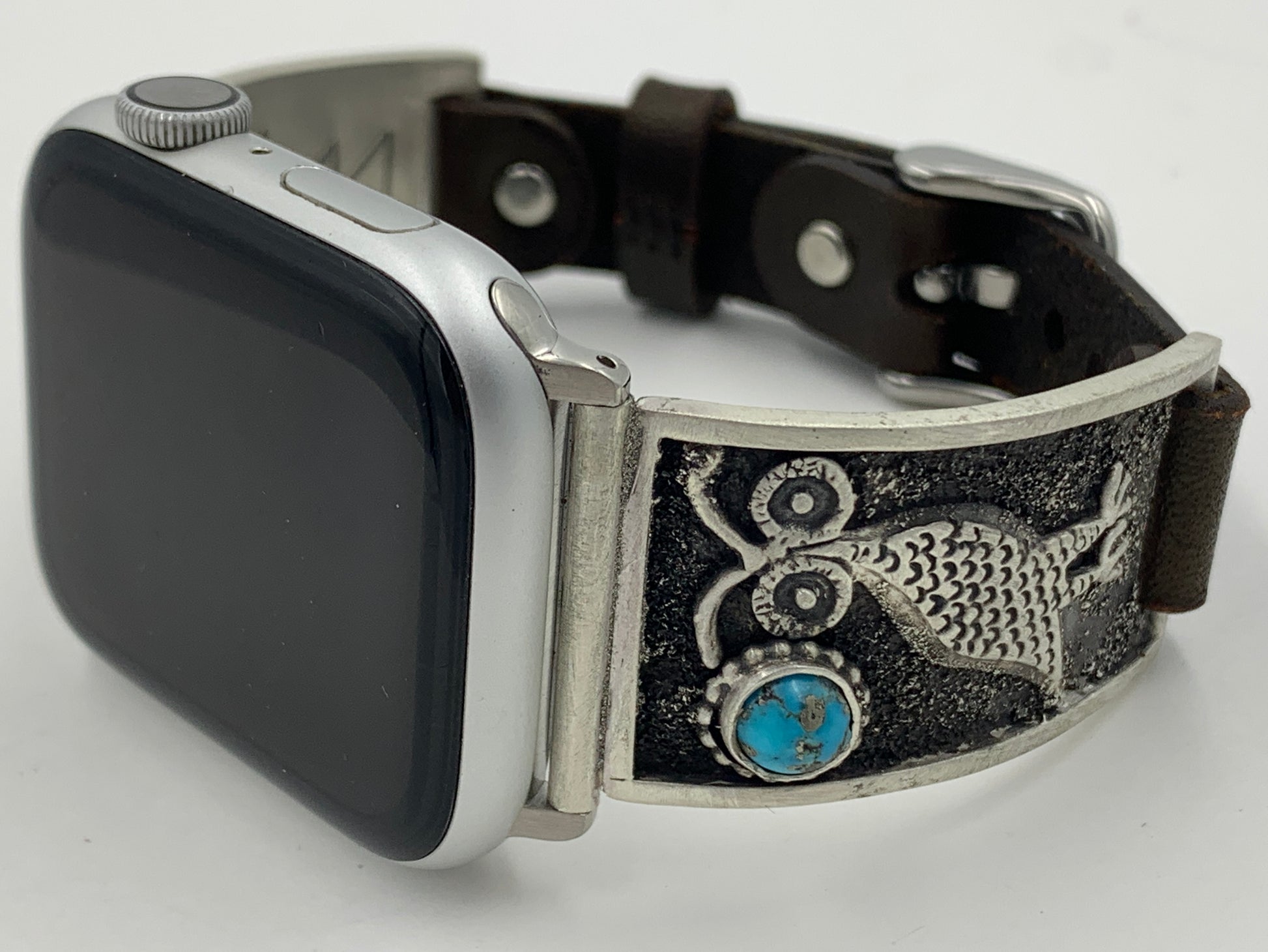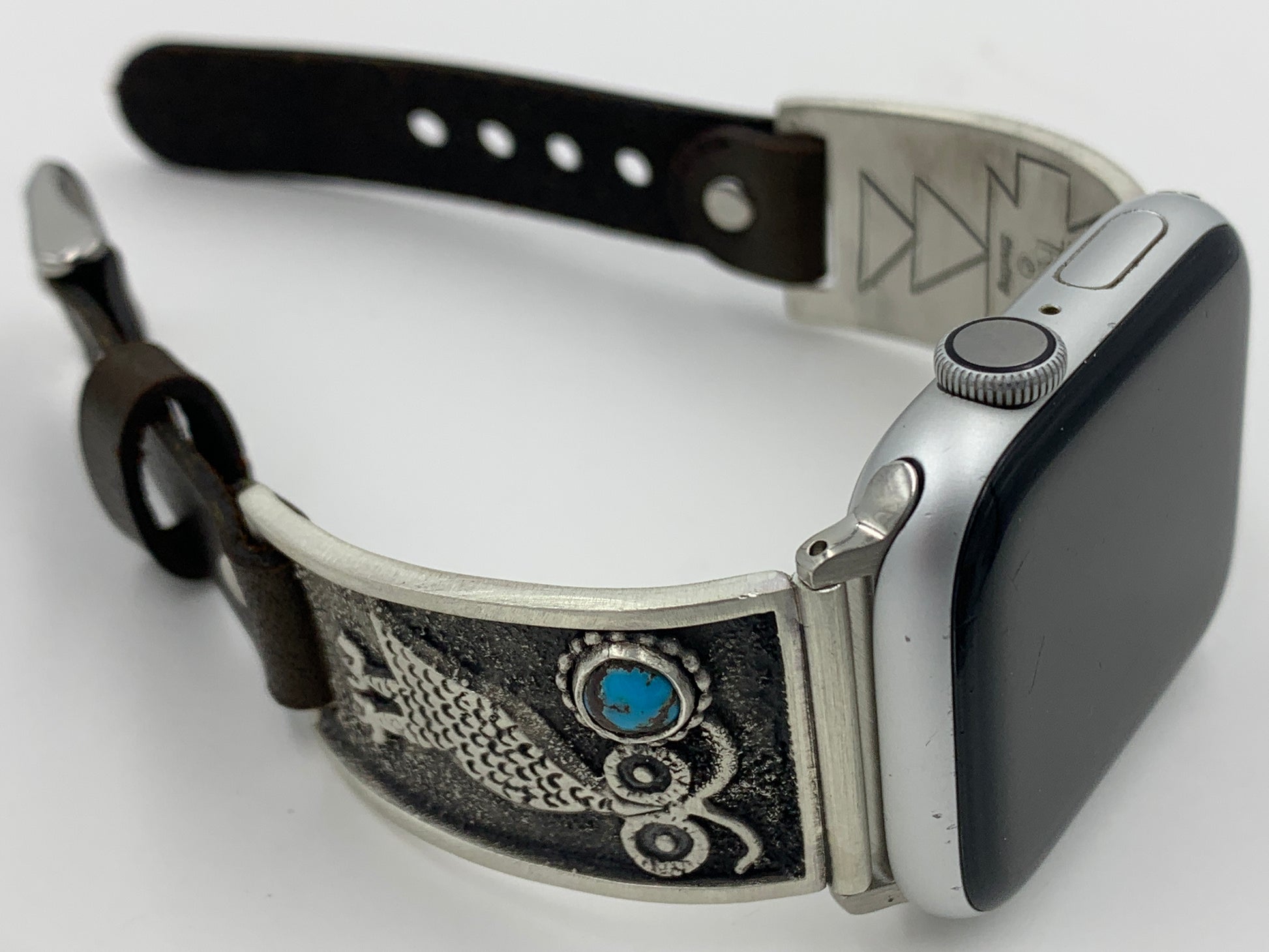 This is Tony Chino's 28th Bilasaana piece offered. The iBand consists of two Sterling Silver Tips with 42/44/45mm Apple WATCH adapters and a leather expansion band. The Sterling Silver Tips are Handcrafted by Tony Chino of Acoma Pueblo heritage and have a unique Sterling Silver design. Each tip has a silver Owl with a turquoise stone. On the inside of each Tip is the official Bilasáana® Trademark, a Sterling stamp, the serial number 28 and Tony's official hallmark and custom stamping.