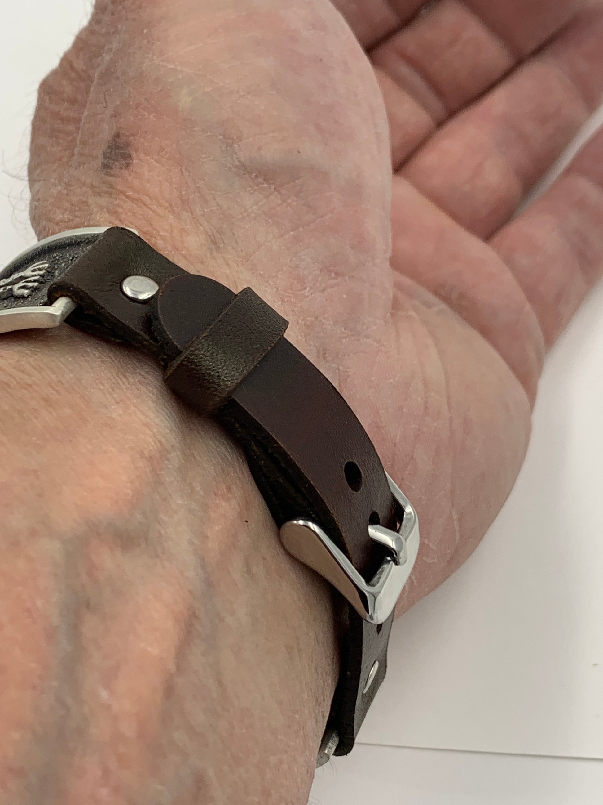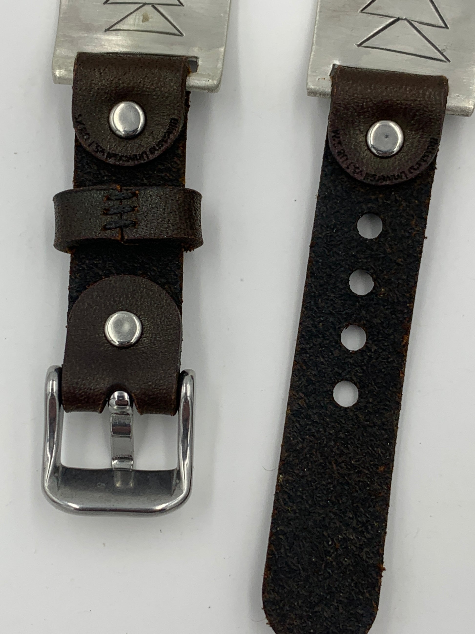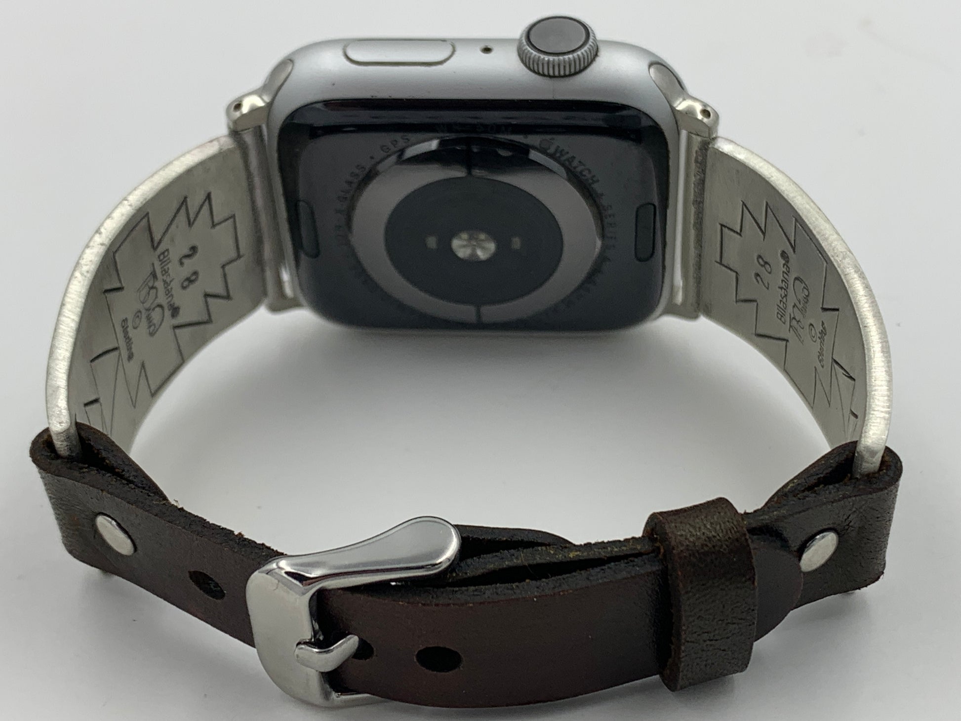 This purchase includes a Handcrafted Native American Sterling Silver watch tips with a Riveted brown Leather buckle band for Apple WATCH Series 1 42mm thru Series 9 44mm and Series 7 45mm. The Apple WATCH 42/44/45mm is not included.