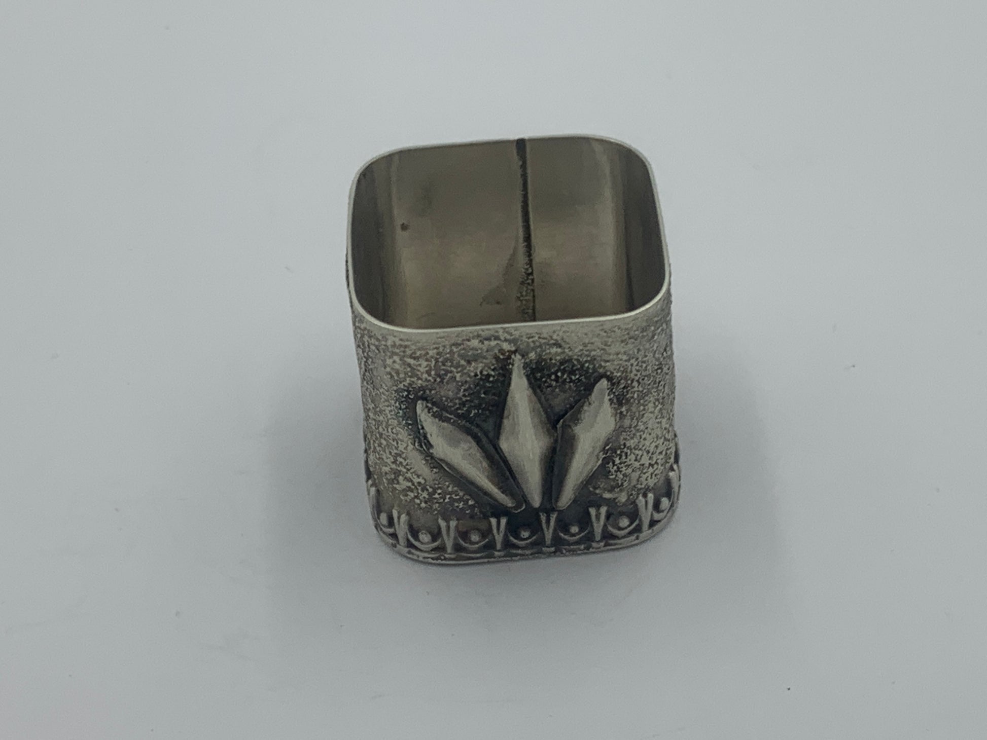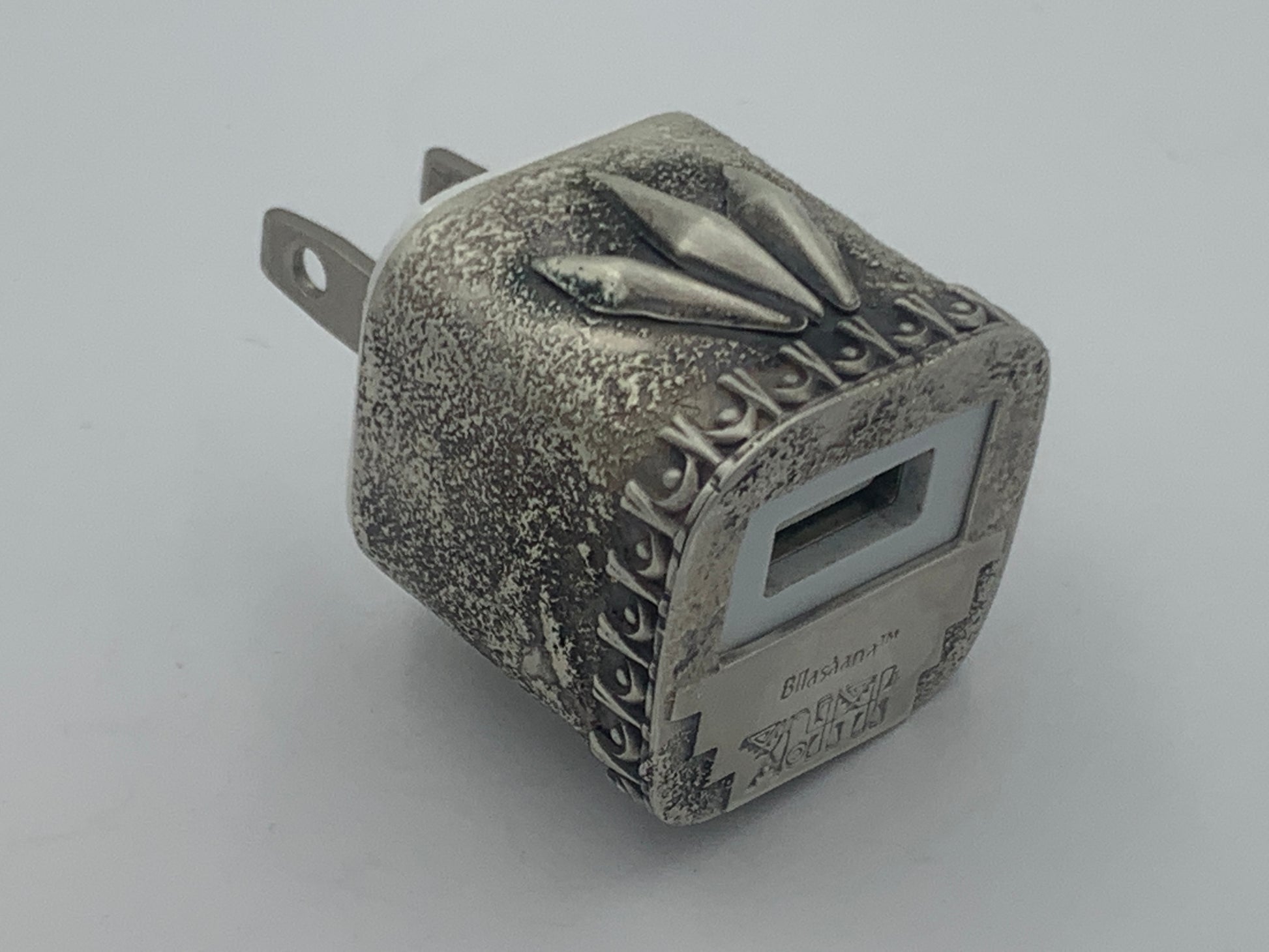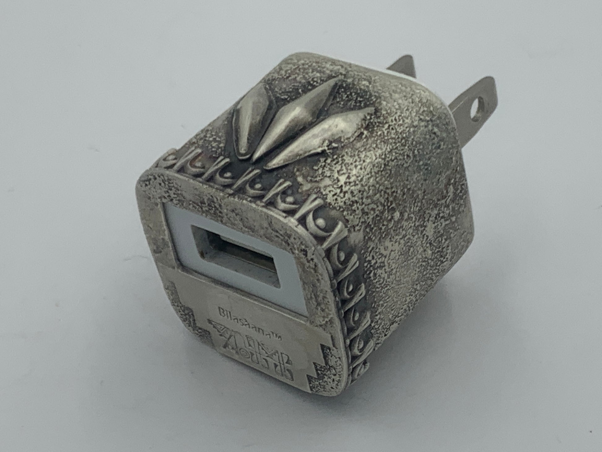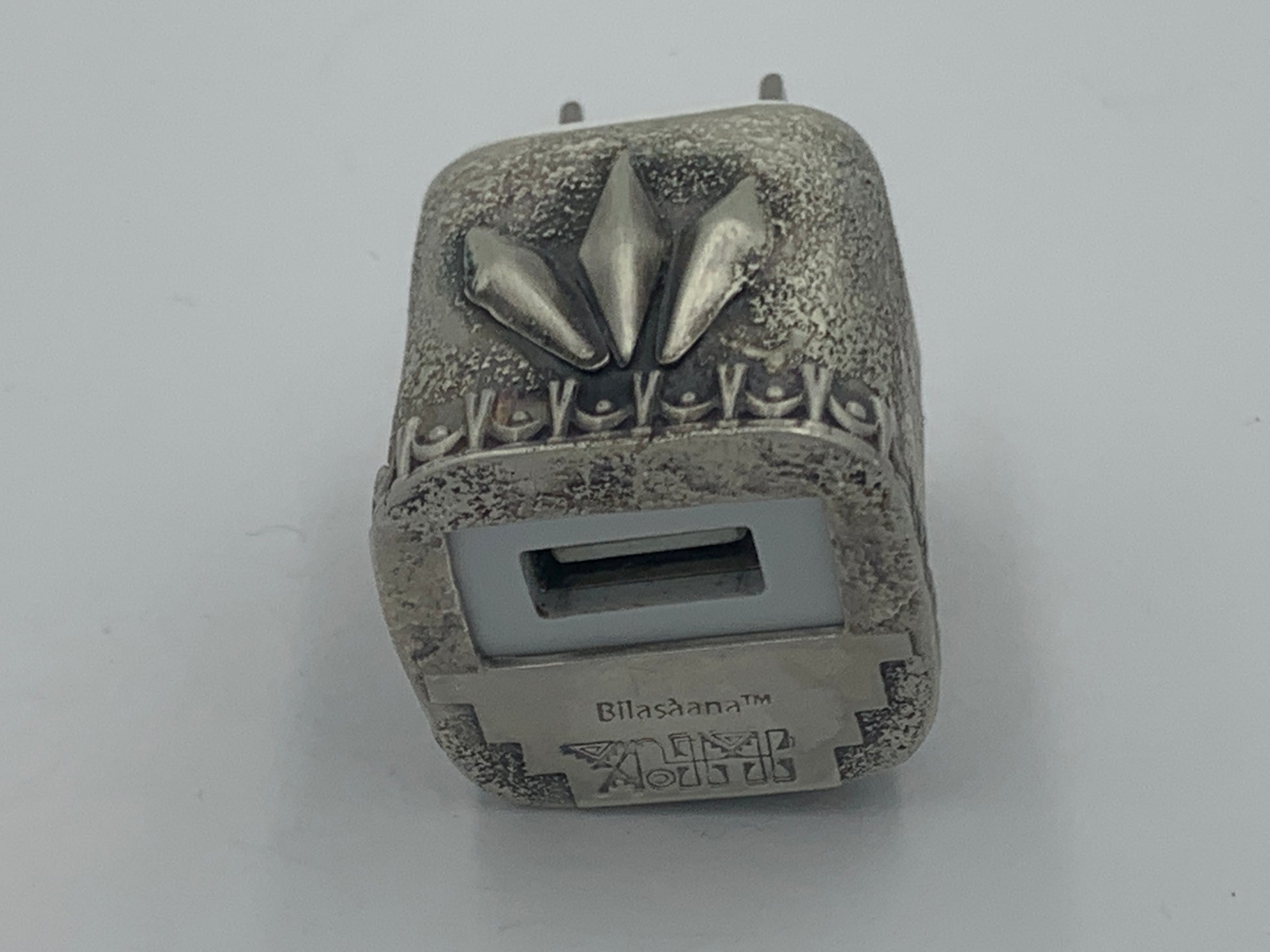 This is Tony Chino's 1st USB iCase piece offered. The iCase is handmade out of Sterling Silver. The Sterling Silver iCase is Handcrafted by Tony Chino of Acoma Pueblo heritage and has a very unique textured background design with what is possibly a plant rising from the under growth looking base bezel. The plant like design is on two sides and on the back side there is a USB Plug hole, the Bilasaana mark and Tony's official hallmark stamp.