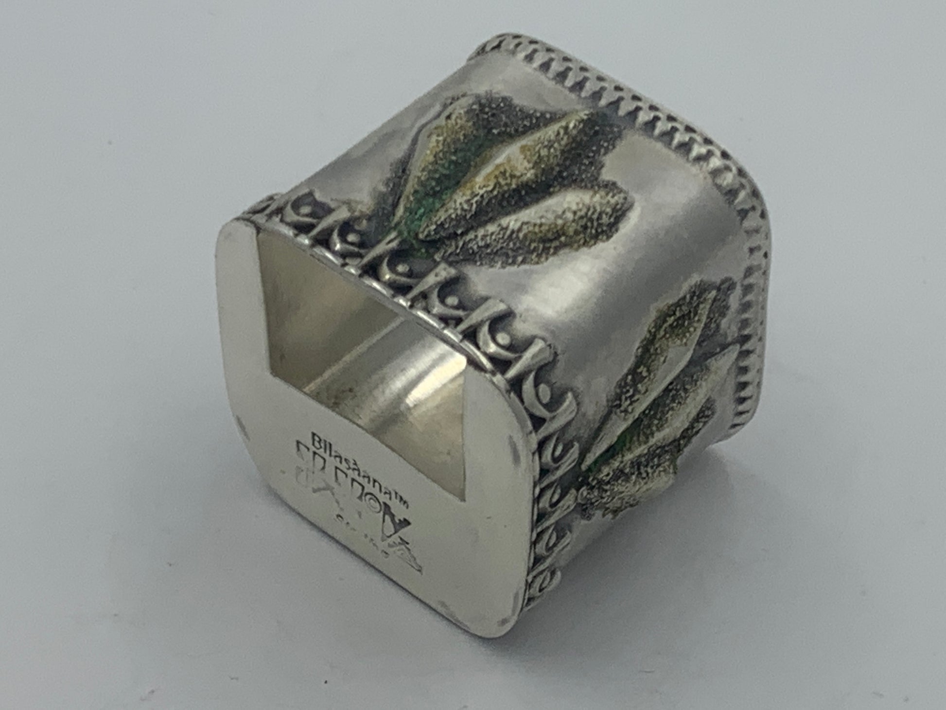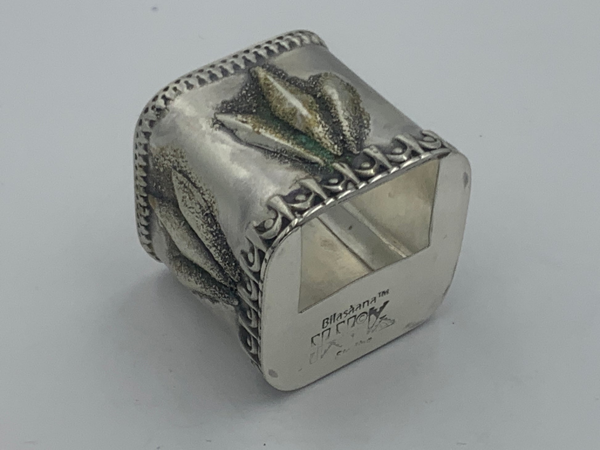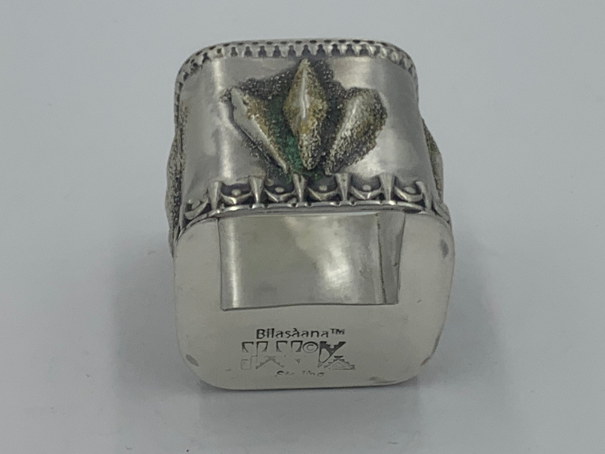 This is Tony Chino's 3rd USB iCase piece offered. The iCase is handmade out of Sterling Silver. The Sterling Silver iCase is Handcrafted by Tony Chino of Acoma Pueblo heritage and has a very unique textured background design with what is possibly a plant rising from the under growth looking base bezel. The plant like design is on two asides and on the back side there is a USB Plug hole, the Bilasaana mark and Tony's official hallmark stamp.
